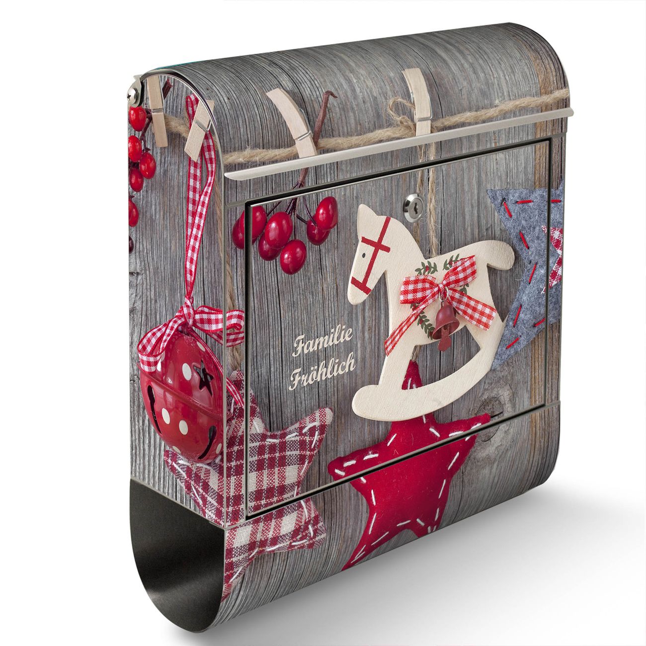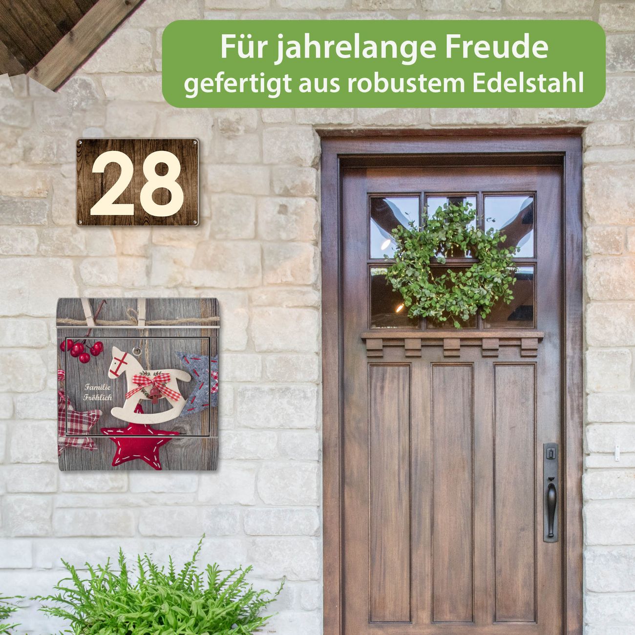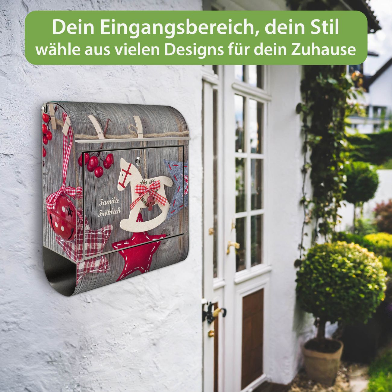 FUNKTION: Der banjado Edelstahl Briefkasten mit Motiv Motiv Winterdekoration bietet Ihnen mit seinem Fassungsvermögen genügend Platz auch für große A4 Sendungen. Das integrierte Zeitungsfach eignet sich hervorragend um unkompliziert die Tageszeitung zu fassen. Auf Wunsch können Sie bei uns den passenden Ständer kaufen und so aus dem Wandbriefkasten einen Standbriefkasten machen. DESIGN: Der Motivbriefkasten hat ein sehr ansprechendes und ausgefallenes Design, damit entlocken Sie Ihren Nachbarn und dem Postboten ein Lächeln. Heben Sie Sich ab von der tristen grauen Masse ohne auf Funktionalität zu verzichten. DETAILS: Der Design Briefkasten mit Motiv Motiv Winterdekoration besteht aus hochwertigem 18/0 Edelstahl. Das Motiv besteht aus einer wetter- und UV-resistenten Folie, die mit einem Schutzlaminat überzogen ist. Der Briefkasten wird mit Montagematerial und zwei Schlüsseln geliefert. NUTZEN: Sie können diesen Briefkasten sowohl als Wandbriefkasten montieren oder einen passenden Ständer auswählen und als Standbriefkasten einbetonieren. Die Größe bietet genügend Platz für Sendungen aller Art, das hochwertige Edelstahl ist rostfrei und die Motivfolie absolut wetterfest. SCHUTZ: Um Ihre Post optimal vor Witterungseinflüssen wie Starkregen zu schützen, empfehlen wir, den Briefkasten geschützt anzubringen. BANJADO: Ihr Briefkasten wird in Sachsen in einer kleinen Manufaktur von Hand veredelt. Die Motivfolie ist lösungsmittelfrei und schutzlaminiert, dies sorgt für einen langen Halt. Wir legen großen Wert auf die Verbindung von Funktionalität und Design. Sie erhalten Handarbeit aus Sachsen.