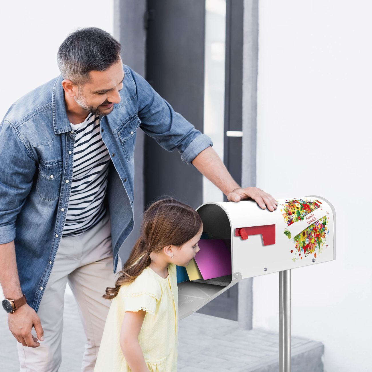 Der amerikanische Briefkasten von banjado mit Sommer Motiv bietet Ihnen ausreichend Fassungsvermögen, um große A4 Sendungen und Zeitschriften zu empfangen. Die typisch amerikanische rote Fahne zeigt Ihnen an, wenn Sie Post erhalten haben. Die US-Mailbox besteht aus verzinktem Stahlblech welches lackiert wurde und ist 48 x 22 x 16 CM (BxHxT) groß. Die Folie mit Motiv Sommer besteht aus einer wetter- und UV-resistenten Folie, die mit einem Schutzlaminat überzogen ist, sodass die US Mailbox zusätzlich vor Kratzern geschützt ist. An der Unterkante sind 4 Löcher je Seite um die Mailbox, typisch amerikanisch, an einem Holzpfahl oder einem Zaun zu befestigen. Auf Wunsch können Sie bei uns den passenden Standfuß oder die passende Wandhalterung kaufen um die US-Mailbox sicher zu befestigen. Wir bieten Ihnen ebenfalls Namensschilder, bereits beschriftet oder frei zu beschriften, und verschiedene selbst gestaltete Bitte-Keine-Werbung-Aufkleber.