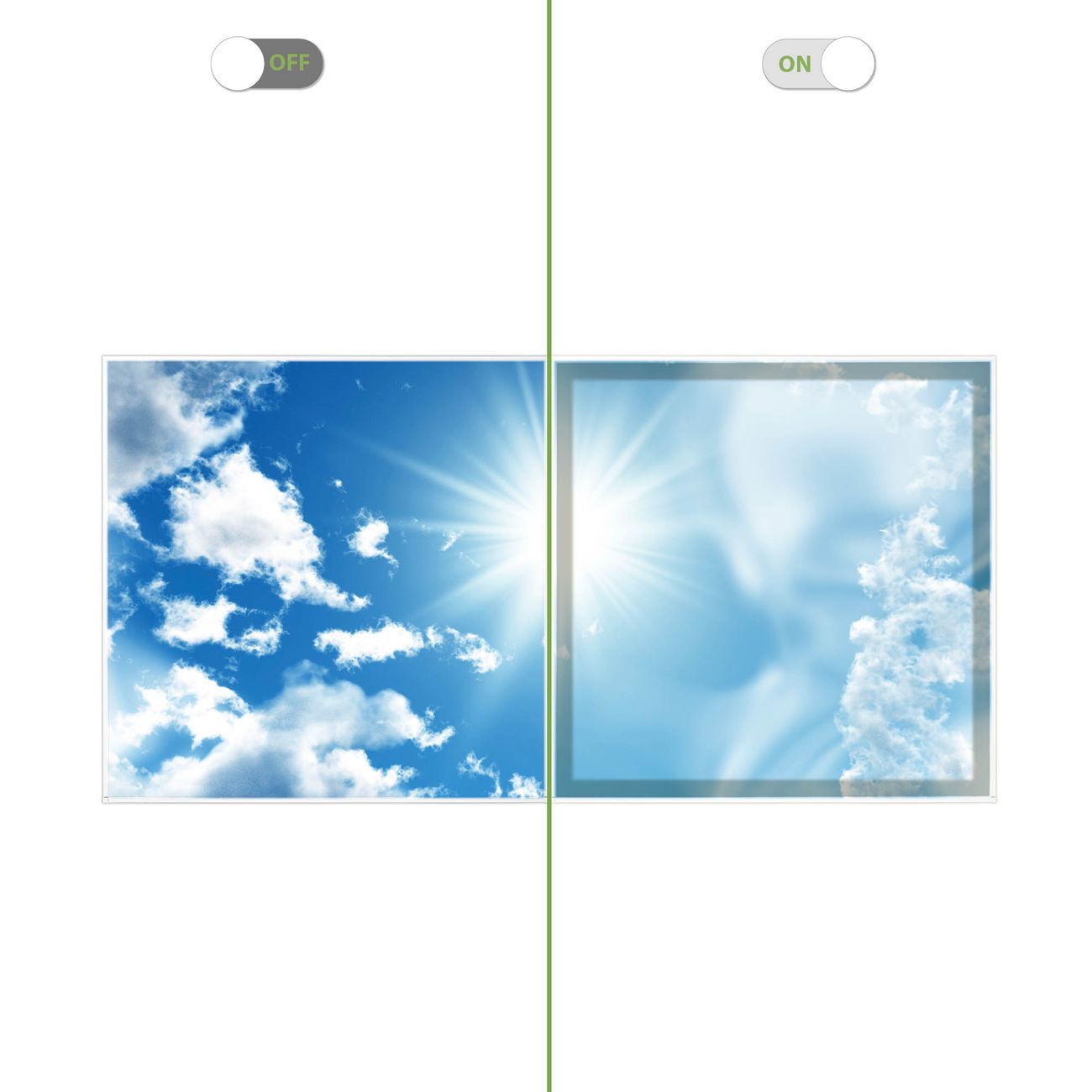 Entdecken Sie unsere vielseitigen Lichtdecken, hier in der Größe 124 x 62cm mit dem Motiv Motiv Clouds - Ihre Beleuchtungslösung für jede Umgebung Beleuchten Sie Ihren Raum nicht nur, sondern schaffen Sie Atmosphäre! Die banjado Lichtdecke verwandelt jeden Ort, ob zu Hause, in Praxen, Büros oder Studios in eine Wohlfühloase. Unsere einzelnen Elemente haben eine genormte Einheitsgröße von 62 x 62cm und können somit in jede gängige Rasterdecken verbaut werden. So finden Sie Ihre passende Ausführung: Gern helfen wir Ihnen, die passende Ausführung zu wählen. Hierfür muss die aktuelle Gegebenheit Ihrer Decke oder Wand beachtet werden. Haben Sie bereits eine Rasterdecke (auch Odenwalddecke genannt)? Hier bestellen Sie lediglich das Motiv + Beleuchtungspanel, denn beides wird in die bereits vorhandene Decke eingelegt. Haben Sie eine glatte Decke mit Lichtauslass oder möchten die Lichtdecke an der Wand befestigen? Hier bestellen Sie bitte Motiv + Beleuchtungspanel + Deckenbefestigung, eine Aufbauanleitung liegt immer bei. Die Lichtdecke kann sowohl an der Decke als auch an der Wand montiert werden, perfekt für kreative Lichtakzente oder alternative Beleuchtungslösungen. Haben Sie bereits eine Lichtdecke und möchten nur das Motiv wechseln? Hier bestellen Sie bitte nur Motiv, der Wechsel ist denkbar einfach. Der Aufbau Ihrer banjado Lichtdecke gestaltet sich unkompliziert, dank einer verständlichen Anleitung, die Ihnen Schritt für Schritt durch den Montageprozess hilft. Für die endgültige Installation und den sicheren Anschluss empfehlen wir die Hinzuziehung eines Fachmanns, um die optimale Funktion und Sicherheit Ihrer Beleuchtung zu gewährleisten. Falls Sie einen Fachmann für die Installation benötigen, geben Sie uns gern Bescheid, wir vermitteln Ihnen gern einen geeigneten Ansprechpartner aus Ihrer Nähe. Steuerung: Steigern Sie Ihr Beleuchtungserlebnis mit der nahtlosen Integration in Ihr Smart Home. Durch die Kompatibilität mit der SmartLife App, Alexa und Google Assistant wird Ihr Smartphone zur zentralen Steuerungseinheit. Ihr Handy fungiert hierbei sozusagen als Fernbedienung. Legen Sie individuelle Lichtszenen in der App fest, die bei Aktivierung über den Wand-Ein-/Ausschalter immer wieder abgerufen werden können ohne Handy. Mit der Szenenfunktion in der Smart App können Sie die Beleuchtung personalisieren und steuern, sodass sie auf Ihre individuellen Bedürfnisse, Tagesrhythmus und Stimmung zugeschnitten ist. Beispielsweise können Sie sich in der Morgendämmerung durch ein sanftes Licht wecken lassen oder das Licht der Praxis werktags um 7 Uhr automatisch einschalten lassen. Dieses kann dann natürlich auch zu einer bestimmten Zeit automatisch ausgeschaltet werden. Motivwahl: Diese einzigartige Lichtdecke zeichnet sich durch ihre Fähigkeit aus, die Lichtfarbe je nach gewähltem Motiv anzupassen - ein Baum wirft ein sanftes grünes Licht, während eine Wolkendecke Ihren Raum in ein beruhigendes blaues Leuchten hüllt. Berücksichtigen Sie dies bitte bei Ihrer Motivauswahl. Sie können das Motiv jederzeit ohne großen Aufwand austauschen, ob nach Jahreszeit oder anderem Anlass, unsere Auswahl lässt kaum Wünsche offen. Wir fertigen Ihnen gern eine personalisierte Lichtdecke mit einem eigenen Motiv oder Logo oder Foto, schreiben Sie uns jederzeit an. Technische Daten: Das Motiv ist auf einer 4mm starken Acrylglas Scheibe aufgebracht, das Gesamtgewicht Ihrer Ausführung beträgt 8,9kg. Die Farbtemperatur lässt sich frei einstellen von 3000 bis 6000 Kelvin, damit können Sie stufenlos zwischen warmweiß, neutralweiß und kaltweiß wählen. Die Gesamtleistung bei Ihrer gewählten Ausführung beträgt 80W. Der Lichtstrom beträgt 3600 Lumen, die Nennspannung 230 V. Die Lichtdecke ist mit Schutzart IP20 für den Innenbereich konzipiert und sollte nicht im Nassbereich verwendet werden.