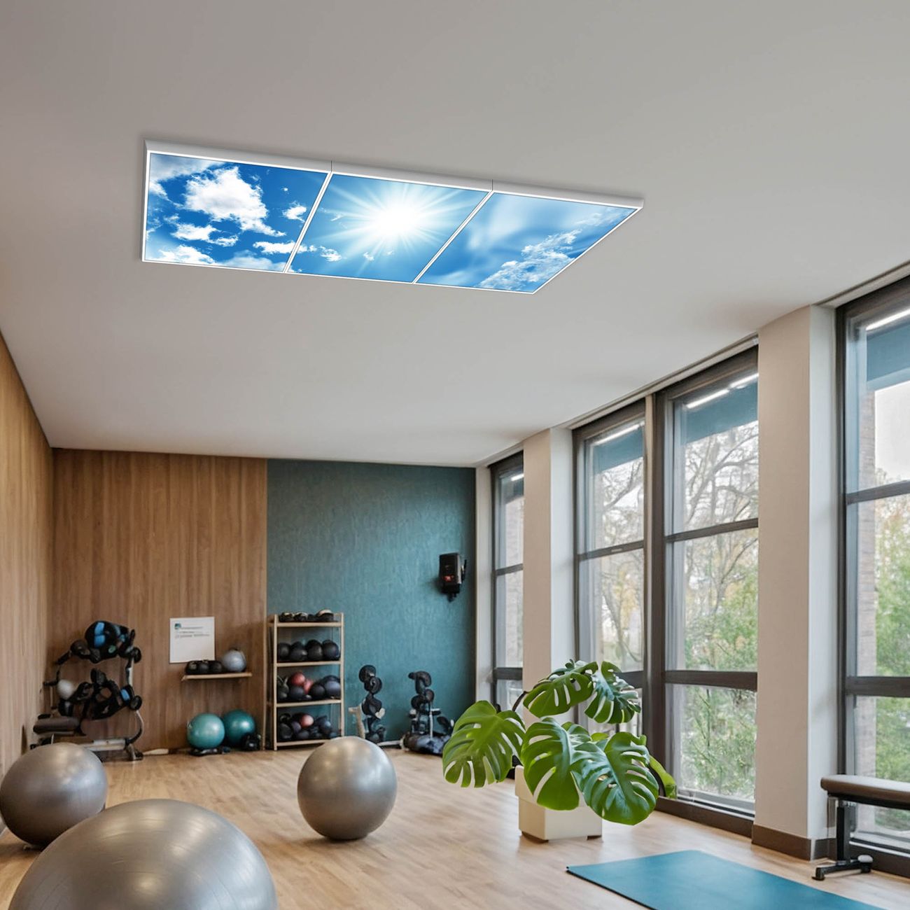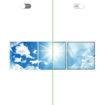 Entdecken Sie unsere vielseitigen Lichtdecken, hier in der Größe 186 x 62cm mit dem Motiv Motiv Clouds - Ihre Beleuchtungslösung für jede Umgebung Beleuchten Sie Ihren Raum nicht nur, sondern schaffen Sie Atmosphäre! Die banjado Lichtdecke verwandelt jeden Ort, ob zu Hause, in Praxen, Büros oder Studios in eine Wohlfühloase. Unsere einzelnen Elemente haben eine genormte Einheitsgröße von 62 x 62cm und können somit in jede gängige Rasterdecken verbaut werden. So finden Sie Ihre passende Ausführung: Gern helfen wir Ihnen, die passende Ausführung zu wählen. Hierfür muss die aktuelle Gegebenheit Ihrer Decke oder Wand beachtet werden. Haben Sie bereits eine Rasterdecke (auch Odenwalddecke genannt)? Hier bestellen Sie lediglich das Motiv + Beleuchtungspanel, denn beides wird in die bereits vorhandene Decke eingelegt. Haben Sie eine glatte Decke mit Lichtauslass oder möchten die Lichtdecke an der Wand befestigen? Hier bestellen Sie bitte Motiv + Beleuchtungspanel + Deckenbefestigung, eine Aufbauanleitung liegt immer bei. Die Lichtdecke kann sowohl an der Decke als auch an der Wand montiert werden, perfekt für kreative Lichtakzente oder alternative Beleuchtungslösungen. Haben Sie bereits eine Lichtdecke und möchten nur das Motiv wechseln? Hier bestellen Sie bitte nur Motiv, der Wechsel ist denkbar einfach. Der Aufbau Ihrer banjado Lichtdecke gestaltet sich unkompliziert, dank einer verständlichen Anleitung, die Ihnen Schritt für Schritt durch den Montageprozess hilft. Für die endgültige Installation und den sicheren Anschluss empfehlen wir die Hinzuziehung eines Fachmanns, um die optimale Funktion und Sicherheit Ihrer Beleuchtung zu gewährleisten. Falls Sie einen Fachmann für die Installation benötigen, geben Sie uns gern Bescheid, wir vermitteln Ihnen gern einen geeigneten Ansprechpartner aus Ihrer Nähe. Steuerung: Steigern Sie Ihr Beleuchtungserlebnis mit der nahtlosen Integration in Ihr Smart Home. Durch die Kompatibilität mit der SmartLife App, Alexa und Google Assistant wird Ihr Smartphone zur zentralen Steuerungseinheit. Ihr Handy fungiert hierbei sozusagen als Fernbedienung. Legen Sie individuelle Lichtszenen in der App fest, die bei Aktivierung über den Wand-Ein-/Ausschalter immer wieder abgerufen werden können ohne Handy. Mit der Szenenfunktion in der Smart App können Sie die Beleuchtung personalisieren und steuern, sodass sie auf Ihre individuellen Bedürfnisse, Tagesrhythmus und Stimmung zugeschnitten ist. Beispielsweise können Sie sich in der Morgendämmerung durch ein sanftes Licht wecken lassen oder das Licht der Praxis werktags um 7 Uhr automatisch einschalten lassen. Dieses kann dann natürlich auch zu einer bestimmten Zeit automatisch ausgeschaltet werden. Motivwahl: Diese einzigartige Lichtdecke zeichnet sich durch ihre Fähigkeit aus, die Lichtfarbe je nach gewähltem Motiv anzupassen - ein Baum wirft ein sanftes grünes Licht, während eine Wolkendecke Ihren Raum in ein beruhigendes blaues Leuchten hüllt. Berücksichtigen Sie dies bitte bei Ihrer Motivauswahl. Sie können das Motiv jederzeit ohne großen Aufwand austauschen, ob nach Jahreszeit oder anderem Anlass, unsere Auswahl lässt kaum Wünsche offen. Wir fertigen Ihnen gern eine personalisierte Lichtdecke mit einem eigenen Motiv oder Logo oder Foto, schreiben Sie uns jederzeit an. Technische Daten: Das Motiv ist auf einer 4mm starken Acrylglas Scheibe aufgebracht, das Gesamtgewicht Ihrer Ausführung beträgt 14,8kg. Die Farbtemperatur lässt sich frei einstellen von 3000 bis 6000 Kelvin, damit können Sie stufenlos zwischen warmweiß, neutralweiß und kaltweiß wählen. Die Gesamtleistung bei Ihrer gewählten Ausführung beträgt 120W. Der Lichtstrom beträgt 3600 Lumen, die Nennspannung 230 V. Die Lichtdecke ist mit Schutzart IP20 für den Innenbereich konzipiert und sollte nicht im Nassbereich verwendet werden.