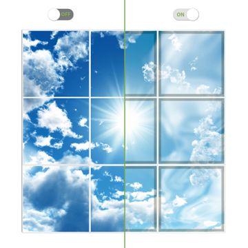 Entdecken Sie unsere vielseitigen Lichtdecken, hier in der Größe 186 x 186cm mit dem Motiv Motiv Clouds - Ihre Beleuchtungslösung für jede Umgebung Beleuchten Sie Ihren Raum nicht nur, sondern schaffen Sie Atmosphäre! Die banjado Lichtdecke verwandelt jeden Ort, ob zu Hause, in Praxen, Büros oder Studios in eine Wohlfühloase. Unsere einzelnen Elemente haben eine genormte Einheitsgröße von 62 x 62cm und können somit in jede gängige Rasterdecken verbaut werden. So finden Sie Ihre passende Ausführung: Gern helfen wir Ihnen, die passende Ausführung zu wählen. Hierfür muss die aktuelle Gegebenheit Ihrer Decke oder Wand beachtet werden. Haben Sie bereits eine Rasterdecke (auch Odenwalddecke genannt)? Hier bestellen Sie lediglich das Motiv + Beleuchtungspanel, denn beides wird in die bereits vorhandene Decke eingelegt. Haben Sie eine glatte Decke mit Lichtauslass oder möchten die Lichtdecke an der Wand befestigen? Hier bestellen Sie bitte Motiv + Beleuchtungspanel + Deckenbefestigung, eine Aufbauanleitung liegt immer bei. Die Lichtdecke kann sowohl an der Decke als auch an der Wand montiert werden, perfekt für kreative Lichtakzente oder alternative Beleuchtungslösungen. Haben Sie bereits eine Lichtdecke und möchten nur das Motiv wechseln? Hier bestellen Sie bitte nur Motiv, der Wechsel ist denkbar einfach. Der Aufbau Ihrer banjado Lichtdecke gestaltet sich unkompliziert, dank einer verständlichen Anleitung, die Ihnen Schritt für Schritt durch den Montageprozess hilft. Für die endgültige Installation und den sicheren Anschluss empfehlen wir die Hinzuziehung eines Fachmanns, um die optimale Funktion und Sicherheit Ihrer Beleuchtung zu gewährleisten. Falls Sie einen Fachmann für die Installation benötigen, geben Sie uns gern Bescheid, wir vermitteln Ihnen gern einen geeigneten Ansprechpartner aus Ihrer Nähe. Steuerung: Steigern Sie Ihr Beleuchtungserlebnis mit der nahtlosen Integration in Ihr Smart Home. Durch die Kompatibilität mit der SmartLife App, Alexa und Google Assistant wird Ihr Smartphone zur zentralen Steuerungseinheit. Ihr Handy fungiert hierbei sozusagen als Fernbedienung. Legen Sie individuelle Lichtszenen in der App fest, die bei Aktivierung über den Wand-Ein-/Ausschalter immer wieder abgerufen werden können ohne Handy. Mit der Szenenfunktion in der Smart App können Sie die Beleuchtung personalisieren und steuern, sodass sie auf Ihre individuellen Bedürfnisse, Tagesrhythmus und Stimmung zugeschnitten ist. Beispielsweise können Sie sich in der Morgendämmerung durch ein sanftes Licht wecken lassen oder das Licht der Praxis werktags um 7 Uhr automatisch einschalten lassen. Dieses kann dann natürlich auch zu einer bestimmten Zeit automatisch ausgeschaltet werden. Motivwahl: Diese einzigartige Lichtdecke zeichnet sich durch ihre Fähigkeit aus, die Lichtfarbe je nach gewähltem Motiv anzupassen - ein Baum wirft ein sanftes grünes Licht, während eine Wolkendecke Ihren Raum in ein beruhigendes blaues Leuchten hüllt. Berücksichtigen Sie dies bitte bei Ihrer Motivauswahl. Sie können das Motiv jederzeit ohne großen Aufwand austauschen, ob nach Jahreszeit oder anderem Anlass, unsere Auswahl lässt kaum Wünsche offen. Wir fertigen Ihnen gern eine personalisierte Lichtdecke mit einem eigenen Motiv oder Logo oder Foto, schreiben Sie uns jederzeit an. Technische Daten: Das Motiv ist auf einer 4mm starken Acrylglas Scheibe aufgebracht, das Gesamtgewicht Ihrer Ausführung beträgt 20,4kg. Die Farbtemperatur lässt sich frei einstellen von 3000 bis 6000 Kelvin, damit können Sie stufenlos zwischen warmweiß, neutralweiß und kaltweiß wählen. Die Gesamtleistung bei Ihrer gewählten Ausführung beträgt 360W. Der Lichtstrom beträgt 3600 Lumen, die Nennspannung 230 V. Die Lichtdecke ist mit Schutzart IP20 für den Innenbereich konzipiert und sollte nicht im Nassbereich verwendet werden.