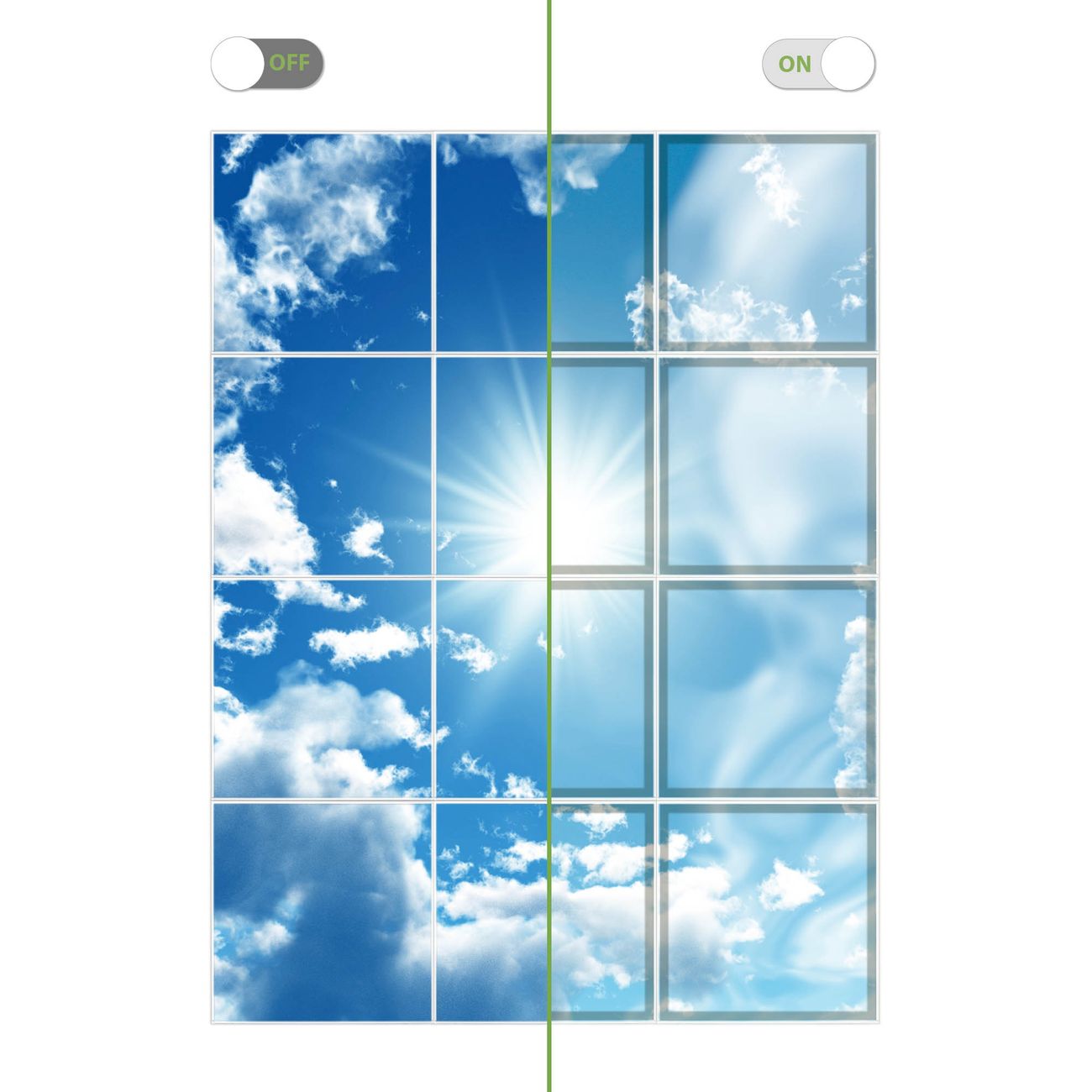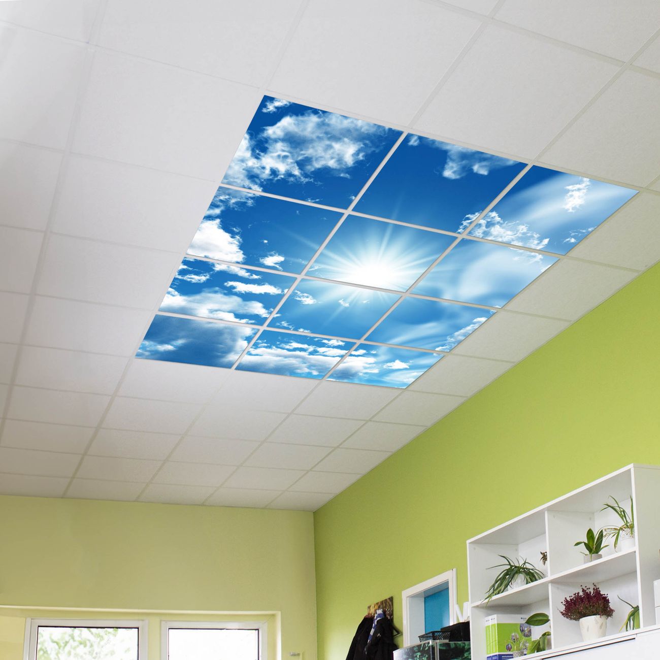 Entdecken Sie unsere vielseitigen Lichtdecken, hier in der Größe 186 x 248cm mit dem Motiv Motiv Clouds - Ihre Beleuchtungslösung für jede Umgebung Beleuchten Sie Ihren Raum nicht nur, sondern schaffen Sie Atmosphäre! Die banjado Lichtdecke verwandelt jeden Ort, ob zu Hause, in Praxen, Büros oder Studios in eine Wohlfühloase. Unsere einzelnen Elemente haben eine genormte Einheitsgröße von 62 x 62cm und können somit in jede gängige Rasterdecken verbaut werden. So finden Sie Ihre passende Ausführung: Gern helfen wir Ihnen, die passende Ausführung zu wählen. Hierfür muss die aktuelle Gegebenheit Ihrer Decke oder Wand beachtet werden. Haben Sie bereits eine Rasterdecke (auch Odenwalddecke genannt)? Hier bestellen Sie lediglich das Motiv + Beleuchtungspanel, denn beides wird in die bereits vorhandene Decke eingelegt. Haben Sie eine glatte Decke mit Lichtauslass oder möchten die Lichtdecke an der Wand befestigen? Hier bestellen Sie bitte Motiv + Beleuchtungspanel + Deckenbefestigung, eine Aufbauanleitung liegt immer bei. Die Lichtdecke kann sowohl an der Decke als auch an der Wand montiert werden, perfekt für kreative Lichtakzente oder alternative Beleuchtungslösungen. Haben Sie bereits eine Lichtdecke und möchten nur das Motiv wechseln? Hier bestellen Sie bitte nur Motiv, der Wechsel ist denkbar einfach. Der Aufbau Ihrer banjado Lichtdecke gestaltet sich unkompliziert, dank einer verständlichen Anleitung, die Ihnen Schritt für Schritt durch den Montageprozess hilft. Für die endgültige Installation und den sicheren Anschluss empfehlen wir die Hinzuziehung eines Fachmanns, um die optimale Funktion und Sicherheit Ihrer Beleuchtung zu gewährleisten. Falls Sie einen Fachmann für die Installation benötigen, geben Sie uns gern Bescheid, wir vermitteln Ihnen gern einen geeigneten Ansprechpartner aus Ihrer Nähe. Steuerung: Steigern Sie Ihr Beleuchtungserlebnis mit der nahtlosen Integration in Ihr Smart Home. Durch die Kompatibilität mit der SmartLife App, Alexa und Google Assistant wird Ihr Smartphone zur zentralen Steuerungseinheit. Ihr Handy fungiert hierbei sozusagen als Fernbedienung. Legen Sie individuelle Lichtszenen in der App fest, die bei Aktivierung über den Wand-Ein-/Ausschalter immer wieder abgerufen werden können ohne Handy. Mit der Szenenfunktion in der Smart App können Sie die Beleuchtung personalisieren und steuern, sodass sie auf Ihre individuellen Bedürfnisse, Tagesrhythmus und Stimmung zugeschnitten ist. Beispielsweise können Sie sich in der Morgendämmerung durch ein sanftes Licht wecken lassen oder das Licht der Praxis werktags um 7 Uhr automatisch einschalten lassen. Dieses kann dann natürlich auch zu einer bestimmten Zeit automatisch ausgeschaltet werden. Motivwahl: Diese einzigartige Lichtdecke zeichnet sich durch ihre Fähigkeit aus, die Lichtfarbe je nach gewähltem Motiv anzupassen - ein Baum wirft ein sanftes grünes Licht, während eine Wolkendecke Ihren Raum in ein beruhigendes blaues Leuchten hüllt. Berücksichtigen Sie dies bitte bei Ihrer Motivauswahl. Sie können das Motiv jederzeit ohne großen Aufwand austauschen, ob nach Jahreszeit oder anderem Anlass, unsere Auswahl lässt kaum Wünsche offen. Wir fertigen Ihnen gern eine personalisierte Lichtdecke mit einem eigenen Motiv oder Logo oder Foto, schreiben Sie uns jederzeit an. Technische Daten: Das Motiv ist auf einer 4mm starken Acrylglas Scheibe aufgebracht, das Gesamtgewicht Ihrer Ausführung beträgt 53,1kg. Die Farbtemperatur lässt sich frei einstellen von 3000 bis 6000 Kelvin, damit können Sie stufenlos zwischen warmweiß, neutralweiß und kaltweiß wählen. Die Gesamtleistung bei Ihrer gewählten Ausführung beträgt 480W. Der Lichtstrom beträgt 3600 Lumen, die Nennspannung 230 V. Die Lichtdecke ist mit Schutzart IP20 für den Innenbereich konzipiert und sollte nicht im Nassbereich verwendet werden.