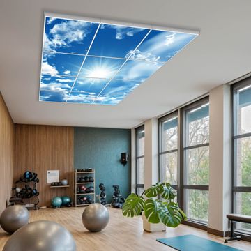 Entdecken Sie unsere vielseitigen Lichtdecken, hier in der Größe 186 x 248cm mit dem Motiv Motiv Clouds - Ihre Beleuchtungslösung für jede Umgebung Beleuchten Sie Ihren Raum nicht nur, sondern schaffen Sie Atmosphäre! Die banjado Lichtdecke verwandelt jeden Ort, ob zu Hause, in Praxen, Büros oder Studios in eine Wohlfühloase. Unsere einzelnen Elemente haben eine genormte Einheitsgröße von 62 x 62cm und können somit in jede gängige Rasterdecken verbaut werden. So finden Sie Ihre passende Ausführung: Gern helfen wir Ihnen, die passende Ausführung zu wählen. Hierfür muss die aktuelle Gegebenheit Ihrer Decke oder Wand beachtet werden. Haben Sie bereits eine Rasterdecke (auch Odenwalddecke genannt)? Hier bestellen Sie lediglich das Motiv + Beleuchtungspanel, denn beides wird in die bereits vorhandene Decke eingelegt. Haben Sie eine glatte Decke mit Lichtauslass oder möchten die Lichtdecke an der Wand befestigen? Hier bestellen Sie bitte Motiv + Beleuchtungspanel + Deckenbefestigung, eine Aufbauanleitung liegt immer bei. Die Lichtdecke kann sowohl an der Decke als auch an der Wand montiert werden, perfekt für kreative Lichtakzente oder alternative Beleuchtungslösungen. Haben Sie bereits eine Lichtdecke und möchten nur das Motiv wechseln? Hier bestellen Sie bitte nur Motiv, der Wechsel ist denkbar einfach. Der Aufbau Ihrer banjado Lichtdecke gestaltet sich unkompliziert, dank einer verständlichen Anleitung, die Ihnen Schritt für Schritt durch den Montageprozess hilft. Für die endgültige Installation und den sicheren Anschluss empfehlen wir die Hinzuziehung eines Fachmanns, um die optimale Funktion und Sicherheit Ihrer Beleuchtung zu gewährleisten. Falls Sie einen Fachmann für die Installation benötigen, geben Sie uns gern Bescheid, wir vermitteln Ihnen gern einen geeigneten Ansprechpartner aus Ihrer Nähe. Steuerung: Steigern Sie Ihr Beleuchtungserlebnis mit der nahtlosen Integration in Ihr Smart Home. Durch die Kompatibilität mit der SmartLife App, Alexa und Google Assistant wird Ihr Smartphone zur zentralen Steuerungseinheit. Ihr Handy fungiert hierbei sozusagen als Fernbedienung. Legen Sie individuelle Lichtszenen in der App fest, die bei Aktivierung über den Wand-Ein-/Ausschalter immer wieder abgerufen werden können ohne Handy. Mit der Szenenfunktion in der Smart App können Sie die Beleuchtung personalisieren und steuern, sodass sie auf Ihre individuellen Bedürfnisse, Tagesrhythmus und Stimmung zugeschnitten ist. Beispielsweise können Sie sich in der Morgendämmerung durch ein sanftes Licht wecken lassen oder das Licht der Praxis werktags um 7 Uhr automatisch einschalten lassen. Dieses kann dann natürlich auch zu einer bestimmten Zeit automatisch ausgeschaltet werden. Motivwahl: Diese einzigartige Lichtdecke zeichnet sich durch ihre Fähigkeit aus, die Lichtfarbe je nach gewähltem Motiv anzupassen - ein Baum wirft ein sanftes grünes Licht, während eine Wolkendecke Ihren Raum in ein beruhigendes blaues Leuchten hüllt. Berücksichtigen Sie dies bitte bei Ihrer Motivauswahl. Sie können das Motiv jederzeit ohne großen Aufwand austauschen, ob nach Jahreszeit oder anderem Anlass, unsere Auswahl lässt kaum Wünsche offen. Wir fertigen Ihnen gern eine personalisierte Lichtdecke mit einem eigenen Motiv oder Logo oder Foto, schreiben Sie uns jederzeit an. Technische Daten: Das Motiv ist auf einer 4mm starken Acrylglas Scheibe aufgebracht, das Gesamtgewicht Ihrer Ausführung beträgt 59,1kg. Die Farbtemperatur lässt sich frei einstellen von 3000 bis 6000 Kelvin, damit können Sie stufenlos zwischen warmweiß, neutralweiß und kaltweiß wählen. Die Gesamtleistung bei Ihrer gewählten Ausführung beträgt 480W. Der Lichtstrom beträgt 3600 Lumen, die Nennspannung 230 V. Die Lichtdecke ist mit Schutzart IP20 für den Innenbereich konzipiert und sollte nicht im Nassbereich verwendet werden.