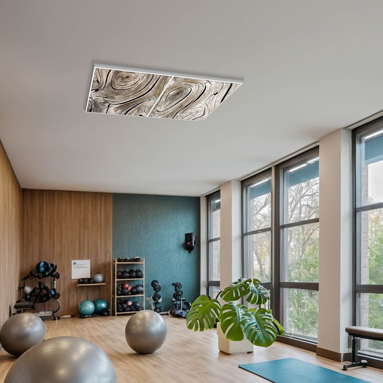 Entdecken Sie unsere vielseitigen Lichtdecken, hier in der Größe 124 x 62cm mit dem Motiv Motiv Holzwirbel - Ihre Beleuchtungslösung für jede Umgebung Beleuchten Sie Ihren Raum nicht nur, sondern schaffen Sie Atmosphäre! Die banjado Lichtdecke verwandelt jeden Ort, ob zu Hause, in Praxen, Büros oder Studios in eine Wohlfühloase. Unsere einzelnen Elemente haben eine genormte Einheitsgröße von 62 x 62cm und können somit in jede gängige Rasterdecken verbaut werden. So finden Sie Ihre passende Ausführung: Gern helfen wir Ihnen, die passende Ausführung zu wählen. Hierfür muss die aktuelle Gegebenheit Ihrer Decke oder Wand beachtet werden. Haben Sie bereits eine Rasterdecke (auch Odenwalddecke genannt)? Hier bestellen Sie lediglich das Motiv + Beleuchtungspanel, denn beides wird in die bereits vorhandene Decke eingelegt. Haben Sie eine glatte Decke mit Lichtauslass oder möchten die Lichtdecke an der Wand befestigen? Hier bestellen Sie bitte Motiv + Beleuchtungspanel + Deckenbefestigung, eine Aufbauanleitung liegt immer bei. Die Lichtdecke kann sowohl an der Decke als auch an der Wand montiert werden, perfekt für kreative Lichtakzente oder alternative Beleuchtungslösungen. Haben Sie bereits eine Lichtdecke und möchten nur das Motiv wechseln? Hier bestellen Sie bitte nur Motiv, der Wechsel ist denkbar einfach. Der Aufbau Ihrer banjado Lichtdecke gestaltet sich unkompliziert, dank einer verständlichen Anleitung, die Ihnen Schritt für Schritt durch den Montageprozess hilft. Für die endgültige Installation und den sicheren Anschluss empfehlen wir die Hinzuziehung eines Fachmanns, um die optimale Funktion und Sicherheit Ihrer Beleuchtung zu gewährleisten. Falls Sie einen Fachmann für die Installation benötigen, geben Sie uns gern Bescheid, wir vermitteln Ihnen gern einen geeigneten Ansprechpartner aus Ihrer Nähe. Steuerung: Steigern Sie Ihr Beleuchtungserlebnis mit der nahtlosen Integration in Ihr Smart Home. Durch die Kompatibilität mit der SmartLife App, Alexa und Google Assistant wird Ihr Smartphone zur zentralen Steuerungseinheit. Ihr Handy fungiert hierbei sozusagen als Fernbedienung. Legen Sie individuelle Lichtszenen in der App fest, die bei Aktivierung über den Wand-Ein-/Ausschalter immer wieder abgerufen werden können ohne Handy. Mit der Szenenfunktion in der Smart App können Sie die Beleuchtung personalisieren und steuern, sodass sie auf Ihre individuellen Bedürfnisse, Tagesrhythmus und Stimmung zugeschnitten ist. Beispielsweise können Sie sich in der Morgendämmerung durch ein sanftes Licht wecken lassen oder das Licht der Praxis werktags um 7 Uhr automatisch einschalten lassen. Dieses kann dann natürlich auch zu einer bestimmten Zeit automatisch ausgeschaltet werden. Motivwahl: Diese einzigartige Lichtdecke zeichnet sich durch ihre Fähigkeit aus, die Lichtfarbe je nach gewähltem Motiv anzupassen - ein Baum wirft ein sanftes grünes Licht, während eine Wolkendecke Ihren Raum in ein beruhigendes blaues Leuchten hüllt. Berücksichtigen Sie dies bitte bei Ihrer Motivauswahl. Sie können das Motiv jederzeit ohne großen Aufwand austauschen, ob nach Jahreszeit oder anderem Anlass, unsere Auswahl lässt kaum Wünsche offen. Wir fertigen Ihnen gern eine personalisierte Lichtdecke mit einem eigenen Motiv oder Logo oder Foto, schreiben Sie uns jederzeit an. Technische Daten: Das Motiv ist auf einer 4mm starken Acrylglas Scheibe aufgebracht, das Gesamtgewicht Ihrer Ausführung beträgt 9,9kg. Die Farbtemperatur lässt sich frei einstellen von 3000 bis 6000 Kelvin, damit können Sie stufenlos zwischen warmweiß, neutralweiß und kaltweiß wählen. Die Gesamtleistung bei Ihrer gewählten Ausführung beträgt 80W. Der Lichtstrom beträgt 3600 Lumen, die Nennspannung 230 V. Die Lichtdecke ist mit Schutzart IP20 für den Innenbereich konzipiert und sollte nicht im Nassbereich verwendet werden.