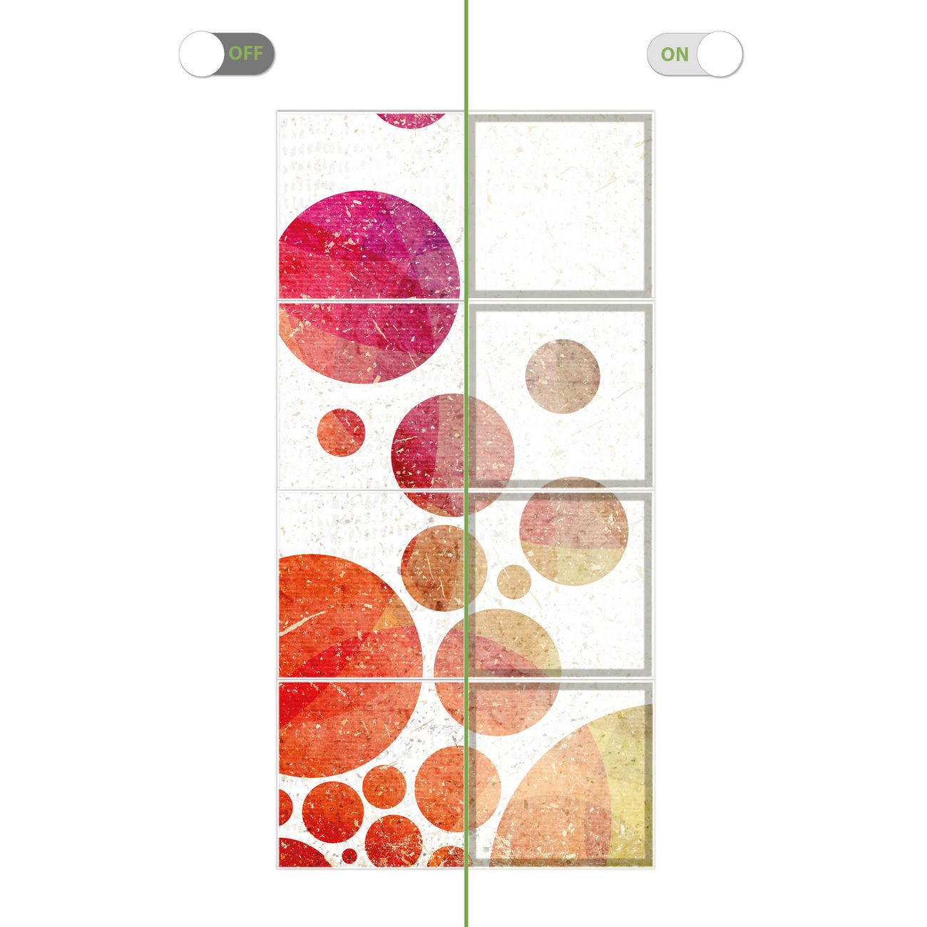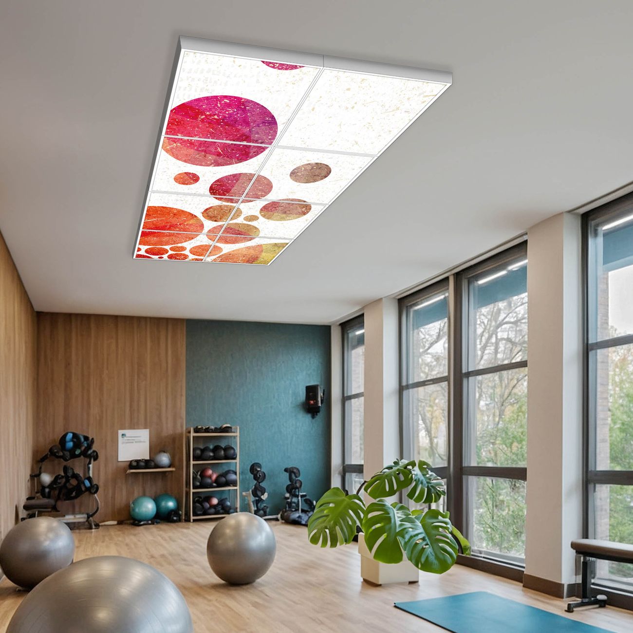 Entdecken Sie unsere vielseitigen Lichtdecken, hier in der Größe 124 x 248cm mit dem Motiv Motiv Kreise - Ihre Beleuchtungslösung für jede Umgebung Beleuchten Sie Ihren Raum nicht nur, sondern schaffen Sie Atmosphäre! Die banjado Lichtdecke verwandelt jeden Ort, ob zu Hause, in Praxen, Büros oder Studios in eine Wohlfühloase. Unsere einzelnen Elemente haben eine genormte Einheitsgröße von 62 x 62cm und können somit in jede gängige Rasterdecken verbaut werden. So finden Sie Ihre passende Ausführung: Gern helfen wir Ihnen, die passende Ausführung zu wählen. Hierfür muss die aktuelle Gegebenheit Ihrer Decke oder Wand beachtet werden. Haben Sie bereits eine Rasterdecke (auch Odenwalddecke genannt)? Hier bestellen Sie lediglich das Motiv + Beleuchtungspanel, denn beides wird in die bereits vorhandene Decke eingelegt. Haben Sie eine glatte Decke mit Lichtauslass oder möchten die Lichtdecke an der Wand befestigen? Hier bestellen Sie bitte Motiv + Beleuchtungspanel + Deckenbefestigung, eine Aufbauanleitung liegt immer bei. Die Lichtdecke kann sowohl an der Decke als auch an der Wand montiert werden, perfekt für kreative Lichtakzente oder alternative Beleuchtungslösungen. Haben Sie bereits eine Lichtdecke und möchten nur das Motiv wechseln? Hier bestellen Sie bitte nur Motiv, der Wechsel ist denkbar einfach. Der Aufbau Ihrer banjado Lichtdecke gestaltet sich unkompliziert, dank einer verständlichen Anleitung, die Ihnen Schritt für Schritt durch den Montageprozess hilft. Für die endgültige Installation und den sicheren Anschluss empfehlen wir die Hinzuziehung eines Fachmanns, um die optimale Funktion und Sicherheit Ihrer Beleuchtung zu gewährleisten. Falls Sie einen Fachmann für die Installation benötigen, geben Sie uns gern Bescheid, wir vermitteln Ihnen gern einen geeigneten Ansprechpartner aus Ihrer Nähe. Steuerung: Steigern Sie Ihr Beleuchtungserlebnis mit der nahtlosen Integration in Ihr Smart Home. Durch die Kompatibilität mit der SmartLife App, Alexa und Google Assistant wird Ihr Smartphone zur zentralen Steuerungseinheit. Ihr Handy fungiert hierbei sozusagen als Fernbedienung. Legen Sie individuelle Lichtszenen in der App fest, die bei Aktivierung über den Wand-Ein-/Ausschalter immer wieder abgerufen werden können ohne Handy. Mit der Szenenfunktion in der Smart App können Sie die Beleuchtung personalisieren und steuern, sodass sie auf Ihre individuellen Bedürfnisse, Tagesrhythmus und Stimmung zugeschnitten ist. Beispielsweise können Sie sich in der Morgendämmerung durch ein sanftes Licht wecken lassen oder das Licht der Praxis werktags um 7 Uhr automatisch einschalten lassen. Dieses kann dann natürlich auch zu einer bestimmten Zeit automatisch ausgeschaltet werden. Motivwahl: Diese einzigartige Lichtdecke zeichnet sich durch ihre Fähigkeit aus, die Lichtfarbe je nach gewähltem Motiv anzupassen - ein Baum wirft ein sanftes grünes Licht, während eine Wolkendecke Ihren Raum in ein beruhigendes blaues Leuchten hüllt. Berücksichtigen Sie dies bitte bei Ihrer Motivauswahl. Sie können das Motiv jederzeit ohne großen Aufwand austauschen, ob nach Jahreszeit oder anderem Anlass, unsere Auswahl lässt kaum Wünsche offen. Wir fertigen Ihnen gern eine personalisierte Lichtdecke mit einem eigenen Motiv oder Logo oder Foto, schreiben Sie uns jederzeit an. Technische Daten: Das Motiv ist auf einer 4mm starken Acrylglas Scheibe aufgebracht, das Gesamtgewicht Ihrer Ausführung beträgt 39,4kg. Die Farbtemperatur lässt sich frei einstellen von 3000 bis 6000 Kelvin, damit können Sie stufenlos zwischen warmweiß, neutralweiß und kaltweiß wählen. Die Gesamtleistung bei Ihrer gewählten Ausführung beträgt 320W. Der Lichtstrom beträgt 3600 Lumen, die Nennspannung 230 V. Die Lichtdecke ist mit Schutzart IP20 für den Innenbereich konzipiert und sollte nicht im Nassbereich verwendet werden.