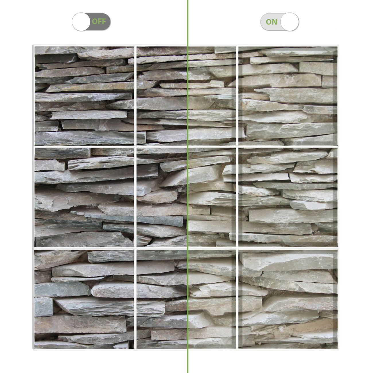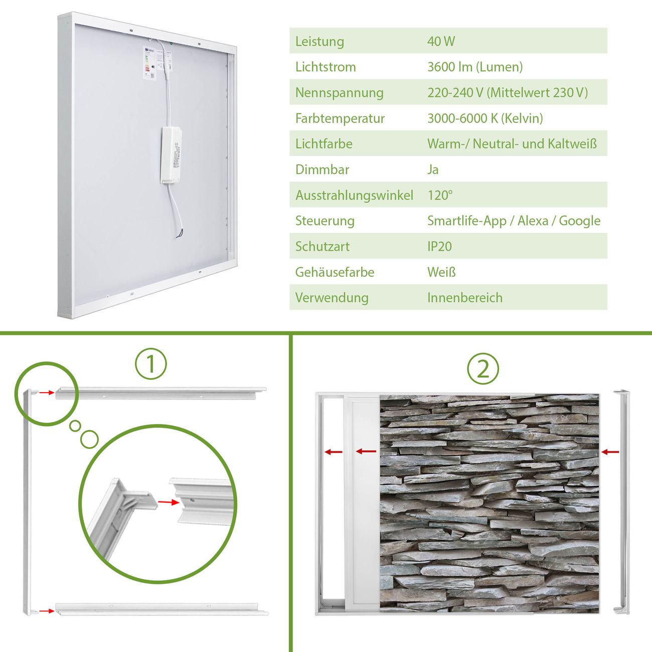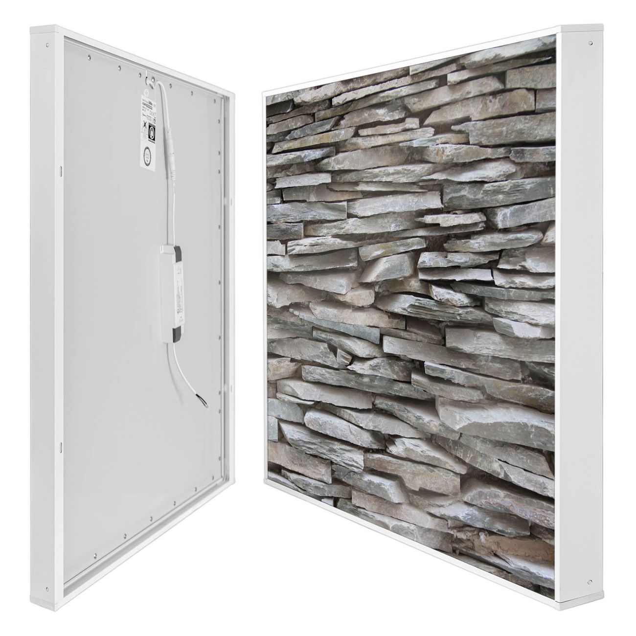 Entdecken Sie unsere vielseitigen Lichtdecken, hier in der Größe 186 x 186cm mit dem Motiv Motiv Steinwand - Ihre Beleuchtungslösung für jede Umgebung Beleuchten Sie Ihren Raum nicht nur, sondern schaffen Sie Atmosphäre! Die banjado Lichtdecke verwandelt jeden Ort, ob zu Hause, in Praxen, Büros oder Studios in eine Wohlfühloase. Unsere einzelnen Elemente haben eine genormte Einheitsgröße von 62 x 62cm und können somit in jede gängige Rasterdecken verbaut werden. So finden Sie Ihre passende Ausführung: Gern helfen wir Ihnen, die passende Ausführung zu wählen. Hierfür muss die aktuelle Gegebenheit Ihrer Decke oder Wand beachtet werden. Haben Sie bereits eine Rasterdecke (auch Odenwalddecke genannt)? Hier bestellen Sie lediglich das Motiv + Beleuchtungspanel, denn beides wird in die bereits vorhandene Decke eingelegt. Haben Sie eine glatte Decke mit Lichtauslass oder möchten die Lichtdecke an der Wand befestigen? Hier bestellen Sie bitte Motiv + Beleuchtungspanel + Deckenbefestigung, eine Aufbauanleitung liegt immer bei. Die Lichtdecke kann sowohl an der Decke als auch an der Wand montiert werden, perfekt für kreative Lichtakzente oder alternative Beleuchtungslösungen. Haben Sie bereits eine Lichtdecke und möchten nur das Motiv wechseln? Hier bestellen Sie bitte nur Motiv, der Wechsel ist denkbar einfach. Der Aufbau Ihrer banjado Lichtdecke gestaltet sich unkompliziert, dank einer verständlichen Anleitung, die Ihnen Schritt für Schritt durch den Montageprozess hilft. Für die endgültige Installation und den sicheren Anschluss empfehlen wir die Hinzuziehung eines Fachmanns, um die optimale Funktion und Sicherheit Ihrer Beleuchtung zu gewährleisten. Falls Sie einen Fachmann für die Installation benötigen, geben Sie uns gern Bescheid, wir vermitteln Ihnen gern einen geeigneten Ansprechpartner aus Ihrer Nähe. Steuerung: Steigern Sie Ihr Beleuchtungserlebnis mit der nahtlosen Integration in Ihr Smart Home. Durch die Kompatibilität mit der SmartLife App, Alexa und Google Assistant wird Ihr Smartphone zur zentralen Steuerungseinheit. Ihr Handy fungiert hierbei sozusagen als Fernbedienung. Legen Sie individuelle Lichtszenen in der App fest, die bei Aktivierung über den Wand-Ein-/Ausschalter immer wieder abgerufen werden können ohne Handy. Mit der Szenenfunktion in der Smart App können Sie die Beleuchtung personalisieren und steuern, sodass sie auf Ihre individuellen Bedürfnisse, Tagesrhythmus und Stimmung zugeschnitten ist. Beispielsweise können Sie sich in der Morgendämmerung durch ein sanftes Licht wecken lassen oder das Licht der Praxis werktags um 7 Uhr automatisch einschalten lassen. Dieses kann dann natürlich auch zu einer bestimmten Zeit automatisch ausgeschaltet werden. Motivwahl: Diese einzigartige Lichtdecke zeichnet sich durch ihre Fähigkeit aus, die Lichtfarbe je nach gewähltem Motiv anzupassen - ein Baum wirft ein sanftes grünes Licht, während eine Wolkendecke Ihren Raum in ein beruhigendes blaues Leuchten hüllt. Berücksichtigen Sie dies bitte bei Ihrer Motivauswahl. Sie können das Motiv jederzeit ohne großen Aufwand austauschen, ob nach Jahreszeit oder anderem Anlass, unsere Auswahl lässt kaum Wünsche offen. Wir fertigen Ihnen gern eine personalisierte Lichtdecke mit einem eigenen Motiv oder Logo oder Foto, schreiben Sie uns jederzeit an. Technische Daten: Das Motiv ist auf einer 4mm starken Acrylglas Scheibe aufgebracht, das Gesamtgewicht Ihrer Ausführung beträgt 20,4kg. Die Farbtemperatur lässt sich frei einstellen von 3000 bis 6000 Kelvin, damit können Sie stufenlos zwischen warmweiß, neutralweiß und kaltweiß wählen. Die Gesamtleistung bei Ihrer gewählten Ausführung beträgt 360W. Der Lichtstrom beträgt 3600 Lumen, die Nennspannung 230 V. Die Lichtdecke ist mit Schutzart IP20 für den Innenbereich konzipiert und sollte nicht im Nassbereich verwendet werden.