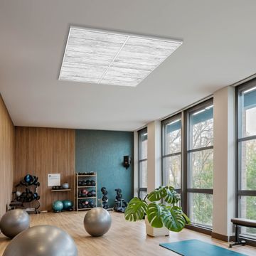 Entdecken Sie unsere vielseitigen Lichtdecken, hier in der Größe 124 x 124cm mit dem Motiv Motiv Weiß Gebeizt - Ihre Beleuchtungslösung für jede Umgebung Beleuchten Sie Ihren Raum nicht nur, sondern schaffen Sie Atmosphäre! Die banjado Lichtdecke verwandelt jeden Ort, ob zu Hause, in Praxen, Büros oder Studios in eine Wohlfühloase. Unsere einzelnen Elemente haben eine genormte Einheitsgröße von 62 x 62cm und können somit in jede gängige Rasterdecken verbaut werden. So finden Sie Ihre passende Ausführung: Gern helfen wir Ihnen, die passende Ausführung zu wählen. Hierfür muss die aktuelle Gegebenheit Ihrer Decke oder Wand beachtet werden. Haben Sie bereits eine Rasterdecke (auch Odenwalddecke genannt)? Hier bestellen Sie lediglich das Motiv + Beleuchtungspanel, denn beides wird in die bereits vorhandene Decke eingelegt. Haben Sie eine glatte Decke mit Lichtauslass oder möchten die Lichtdecke an der Wand befestigen? Hier bestellen Sie bitte Motiv + Beleuchtungspanel + Deckenbefestigung, eine Aufbauanleitung liegt immer bei. Die Lichtdecke kann sowohl an der Decke als auch an der Wand montiert werden, perfekt für kreative Lichtakzente oder alternative Beleuchtungslösungen. Haben Sie bereits eine Lichtdecke und möchten nur das Motiv wechseln? Hier bestellen Sie bitte nur Motiv, der Wechsel ist denkbar einfach. Der Aufbau Ihrer banjado Lichtdecke gestaltet sich unkompliziert, dank einer verständlichen Anleitung, die Ihnen Schritt für Schritt durch den Montageprozess hilft. Für die endgültige Installation und den sicheren Anschluss empfehlen wir die Hinzuziehung eines Fachmanns, um die optimale Funktion und Sicherheit Ihrer Beleuchtung zu gewährleisten. Falls Sie einen Fachmann für die Installation benötigen, geben Sie uns gern Bescheid, wir vermitteln Ihnen gern einen geeigneten Ansprechpartner aus Ihrer Nähe. Steuerung: Steigern Sie Ihr Beleuchtungserlebnis mit der nahtlosen Integration in Ihr Smart Home. Durch die Kompatibilität mit der SmartLife App, Alexa und Google Assistant wird Ihr Smartphone zur zentralen Steuerungseinheit. Ihr Handy fungiert hierbei sozusagen als Fernbedienung. Legen Sie individuelle Lichtszenen in der App fest, die bei Aktivierung über den Wand-Ein-/Ausschalter immer wieder abgerufen werden können ohne Handy. Mit der Szenenfunktion in der Smart App können Sie die Beleuchtung personalisieren und steuern, sodass sie auf Ihre individuellen Bedürfnisse, Tagesrhythmus und Stimmung zugeschnitten ist. Beispielsweise können Sie sich in der Morgendämmerung durch ein sanftes Licht wecken lassen oder das Licht der Praxis werktags um 7 Uhr automatisch einschalten lassen. Dieses kann dann natürlich auch zu einer bestimmten Zeit automatisch ausgeschaltet werden. Motivwahl: Diese einzigartige Lichtdecke zeichnet sich durch ihre Fähigkeit aus, die Lichtfarbe je nach gewähltem Motiv anzupassen - ein Baum wirft ein sanftes grünes Licht, während eine Wolkendecke Ihren Raum in ein beruhigendes blaues Leuchten hüllt. Berücksichtigen Sie dies bitte bei Ihrer Motivauswahl. Sie können das Motiv jederzeit ohne großen Aufwand austauschen, ob nach Jahreszeit oder anderem Anlass, unsere Auswahl lässt kaum Wünsche offen. Wir fertigen Ihnen gern eine personalisierte Lichtdecke mit einem eigenen Motiv oder Logo oder Foto, schreiben Sie uns jederzeit an. Technische Daten: Das Motiv ist auf einer 4mm starken Acrylglas Scheibe aufgebracht, das Gesamtgewicht Ihrer Ausführung beträgt 19,7kg. Die Farbtemperatur lässt sich frei einstellen von 3000 bis 6000 Kelvin, damit können Sie stufenlos zwischen warmweiß, neutralweiß und kaltweiß wählen. Die Gesamtleistung bei Ihrer gewählten Ausführung beträgt 160W. Der Lichtstrom beträgt 3600 Lumen, die Nennspannung 230 V. Die Lichtdecke ist mit Schutzart IP20 für den Innenbereich konzipiert und sollte nicht im Nassbereich verwendet werden.