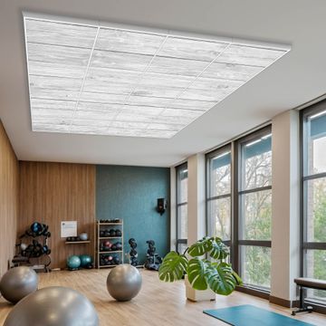 Entdecken Sie unsere vielseitigen Lichtdecken, hier in der Größe 248 x 248cm mit dem Motiv Motiv Weiß Gebeizt - Ihre Beleuchtungslösung für jede Umgebung Beleuchten Sie Ihren Raum nicht nur, sondern schaffen Sie Atmosphäre! Die banjado Lichtdecke verwandelt jeden Ort, ob zu Hause, in Praxen, Büros oder Studios in eine Wohlfühloase. Unsere einzelnen Elemente haben eine genormte Einheitsgröße von 62 x 62cm und können somit in jede gängige Rasterdecken verbaut werden. So finden Sie Ihre passende Ausführung: Gern helfen wir Ihnen, die passende Ausführung zu wählen. Hierfür muss die aktuelle Gegebenheit Ihrer Decke oder Wand beachtet werden. Haben Sie bereits eine Rasterdecke (auch Odenwalddecke genannt)? Hier bestellen Sie lediglich das Motiv + Beleuchtungspanel, denn beides wird in die bereits vorhandene Decke eingelegt. Haben Sie eine glatte Decke mit Lichtauslass oder möchten die Lichtdecke an der Wand befestigen? Hier bestellen Sie bitte Motiv + Beleuchtungspanel + Deckenbefestigung, eine Aufbauanleitung liegt immer bei. Die Lichtdecke kann sowohl an der Decke als auch an der Wand montiert werden, perfekt für kreative Lichtakzente oder alternative Beleuchtungslösungen. Haben Sie bereits eine Lichtdecke und möchten nur das Motiv wechseln? Hier bestellen Sie bitte nur Motiv, der Wechsel ist denkbar einfach. Der Aufbau Ihrer banjado Lichtdecke gestaltet sich unkompliziert, dank einer verständlichen Anleitung, die Ihnen Schritt für Schritt durch den Montageprozess hilft. Für die endgültige Installation und den sicheren Anschluss empfehlen wir die Hinzuziehung eines Fachmanns, um die optimale Funktion und Sicherheit Ihrer Beleuchtung zu gewährleisten. Falls Sie einen Fachmann für die Installation benötigen, geben Sie uns gern Bescheid, wir vermitteln Ihnen gern einen geeigneten Ansprechpartner aus Ihrer Nähe. Steuerung: Steigern Sie Ihr Beleuchtungserlebnis mit der nahtlosen Integration in Ihr Smart Home. Durch die Kompatibilität mit der SmartLife App, Alexa und Google Assistant wird Ihr Smartphone zur zentralen Steuerungseinheit. Ihr Handy fungiert hierbei sozusagen als Fernbedienung. Legen Sie individuelle Lichtszenen in der App fest, die bei Aktivierung über den Wand-Ein-/Ausschalter immer wieder abgerufen werden können ohne Handy. Mit der Szenenfunktion in der Smart App können Sie die Beleuchtung personalisieren und steuern, sodass sie auf Ihre individuellen Bedürfnisse, Tagesrhythmus und Stimmung zugeschnitten ist. Beispielsweise können Sie sich in der Morgendämmerung durch ein sanftes Licht wecken lassen oder das Licht der Praxis werktags um 7 Uhr automatisch einschalten lassen. Dieses kann dann natürlich auch zu einer bestimmten Zeit automatisch ausgeschaltet werden. Motivwahl: Diese einzigartige Lichtdecke zeichnet sich durch ihre Fähigkeit aus, die Lichtfarbe je nach gewähltem Motiv anzupassen - ein Baum wirft ein sanftes grünes Licht, während eine Wolkendecke Ihren Raum in ein beruhigendes blaues Leuchten hüllt. Berücksichtigen Sie dies bitte bei Ihrer Motivauswahl. Sie können das Motiv jederzeit ohne großen Aufwand austauschen, ob nach Jahreszeit oder anderem Anlass, unsere Auswahl lässt kaum Wünsche offen. Wir fertigen Ihnen gern eine personalisierte Lichtdecke mit einem eigenen Motiv oder Logo oder Foto, schreiben Sie uns jederzeit an. Technische Daten: Das Motiv ist auf einer 4mm starken Acrylglas Scheibe aufgebracht, das Gesamtgewicht Ihrer Ausführung beträgt 78,9kg. Die Farbtemperatur lässt sich frei einstellen von 3000 bis 6000 Kelvin, damit können Sie stufenlos zwischen warmweiß, neutralweiß und kaltweiß wählen. Die Gesamtleistung bei Ihrer gewählten Ausführung beträgt 640W. Der Lichtstrom beträgt 3600 Lumen, die Nennspannung 230 V. Die Lichtdecke ist mit Schutzart IP20 für den Innenbereich konzipiert und sollte nicht im Nassbereich verwendet werden.