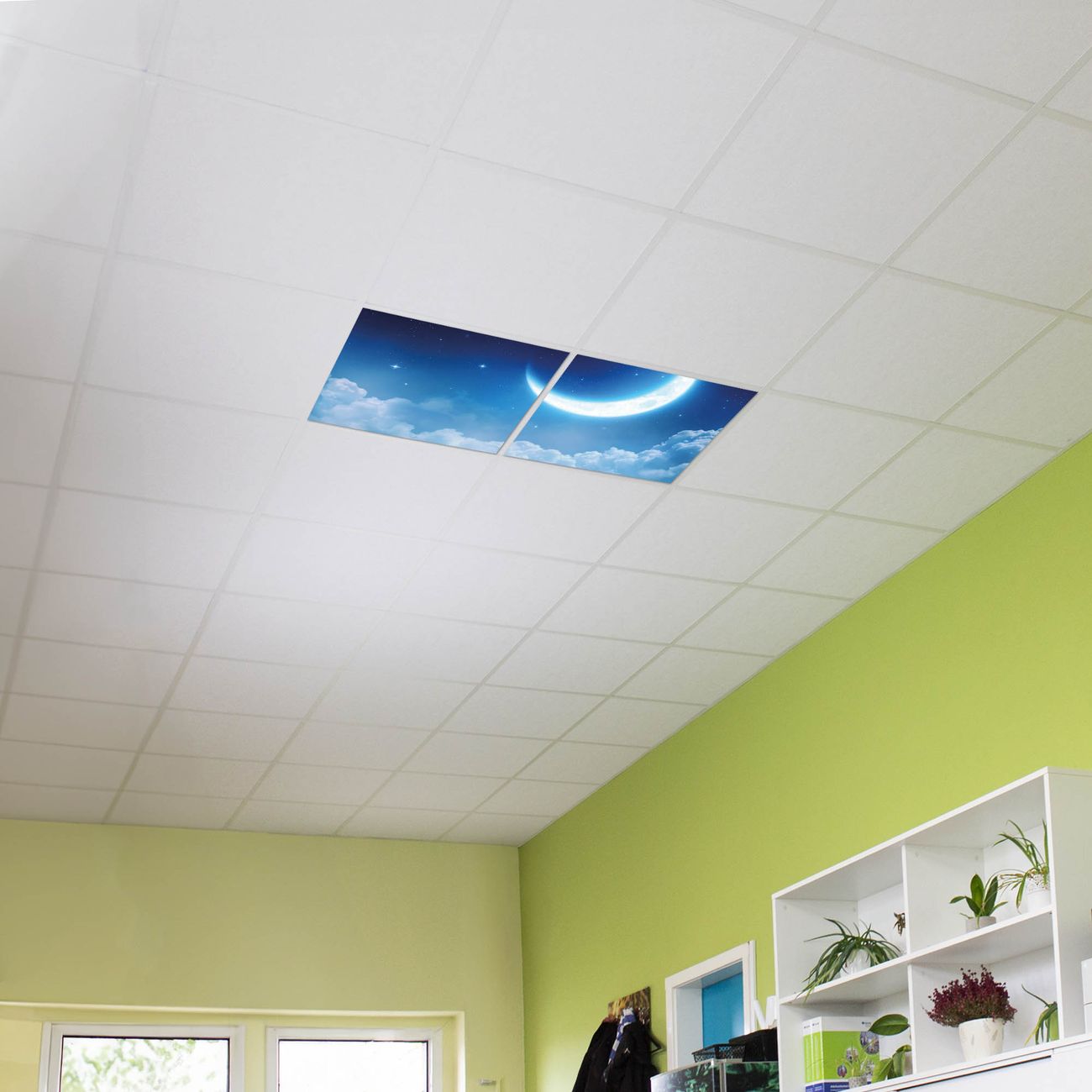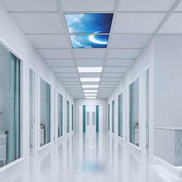 Entdecken Sie unsere vielseitigen Lichtdecken, hier in der Größe 124 x 62cm mit dem Motiv Motiv zunehmender Mond - Ihre Beleuchtungslösung für jede Umgebung Beleuchten Sie Ihren Raum nicht nur, sondern schaffen Sie Atmosphäre! Die banjado Lichtdecke verwandelt jeden Ort, ob zu Hause, in Praxen, Büros oder Studios in eine Wohlfühloase. Unsere einzelnen Elemente haben eine genormte Einheitsgröße von 62 x 62cm und können somit in jede gängige Rasterdecken verbaut werden. So finden Sie Ihre passende Ausführung: Gern helfen wir Ihnen, die passende Ausführung zu wählen. Hierfür muss die aktuelle Gegebenheit Ihrer Decke oder Wand beachtet werden. Haben Sie bereits eine Rasterdecke (auch Odenwalddecke genannt)? Hier bestellen Sie lediglich das Motiv + Beleuchtungspanel, denn beides wird in die bereits vorhandene Decke eingelegt. Haben Sie eine glatte Decke mit Lichtauslass oder möchten die Lichtdecke an der Wand befestigen? Hier bestellen Sie bitte Motiv + Beleuchtungspanel + Deckenbefestigung, eine Aufbauanleitung liegt immer bei. Die Lichtdecke kann sowohl an der Decke als auch an der Wand montiert werden, perfekt für kreative Lichtakzente oder alternative Beleuchtungslösungen. Haben Sie bereits eine Lichtdecke und möchten nur das Motiv wechseln? Hier bestellen Sie bitte nur Motiv, der Wechsel ist denkbar einfach. Der Aufbau Ihrer banjado Lichtdecke gestaltet sich unkompliziert, dank einer verständlichen Anleitung, die Ihnen Schritt für Schritt durch den Montageprozess hilft. Für die endgültige Installation und den sicheren Anschluss empfehlen wir die Hinzuziehung eines Fachmanns, um die optimale Funktion und Sicherheit Ihrer Beleuchtung zu gewährleisten. Falls Sie einen Fachmann für die Installation benötigen, geben Sie uns gern Bescheid, wir vermitteln Ihnen gern einen geeigneten Ansprechpartner aus Ihrer Nähe. Steuerung: Steigern Sie Ihr Beleuchtungserlebnis mit der nahtlosen Integration in Ihr Smart Home. Durch die Kompatibilität mit der SmartLife App, Alexa und Google Assistant wird Ihr Smartphone zur zentralen Steuerungseinheit. Ihr Handy fungiert hierbei sozusagen als Fernbedienung. Legen Sie individuelle Lichtszenen in der App fest, die bei Aktivierung über den Wand-Ein-/Ausschalter immer wieder abgerufen werden können ohne Handy. Mit der Szenenfunktion in der Smart App können Sie die Beleuchtung personalisieren und steuern, sodass sie auf Ihre individuellen Bedürfnisse, Tagesrhythmus und Stimmung zugeschnitten ist. Beispielsweise können Sie sich in der Morgendämmerung durch ein sanftes Licht wecken lassen oder das Licht der Praxis werktags um 7 Uhr automatisch einschalten lassen. Dieses kann dann natürlich auch zu einer bestimmten Zeit automatisch ausgeschaltet werden. Motivwahl: Diese einzigartige Lichtdecke zeichnet sich durch ihre Fähigkeit aus, die Lichtfarbe je nach gewähltem Motiv anzupassen - ein Baum wirft ein sanftes grünes Licht, während eine Wolkendecke Ihren Raum in ein beruhigendes blaues Leuchten hüllt. Berücksichtigen Sie dies bitte bei Ihrer Motivauswahl. Sie können das Motiv jederzeit ohne großen Aufwand austauschen, ob nach Jahreszeit oder anderem Anlass, unsere Auswahl lässt kaum Wünsche offen. Wir fertigen Ihnen gern eine personalisierte Lichtdecke mit einem eigenen Motiv oder Logo oder Foto, schreiben Sie uns jederzeit an. Technische Daten: Das Motiv ist auf einer 4mm starken Acrylglas Scheibe aufgebracht, das Gesamtgewicht Ihrer Ausführung beträgt 4,5kg. Die Farbtemperatur lässt sich frei einstellen von 3000 bis 6000 Kelvin, damit können Sie stufenlos zwischen warmweiß, neutralweiß und kaltweiß wählen. Die Gesamtleistung bei Ihrer gewählten Ausführung beträgt 80W. Der Lichtstrom beträgt 3600 Lumen, die Nennspannung 230 V. Die Lichtdecke ist mit Schutzart IP20 für den Innenbereich konzipiert und sollte nicht im Nassbereich verwendet werden.