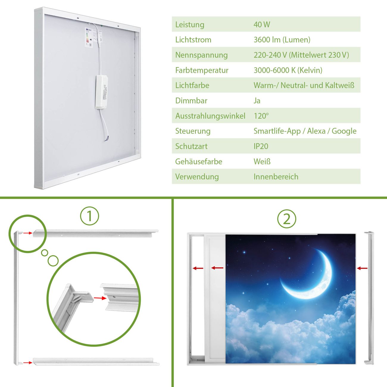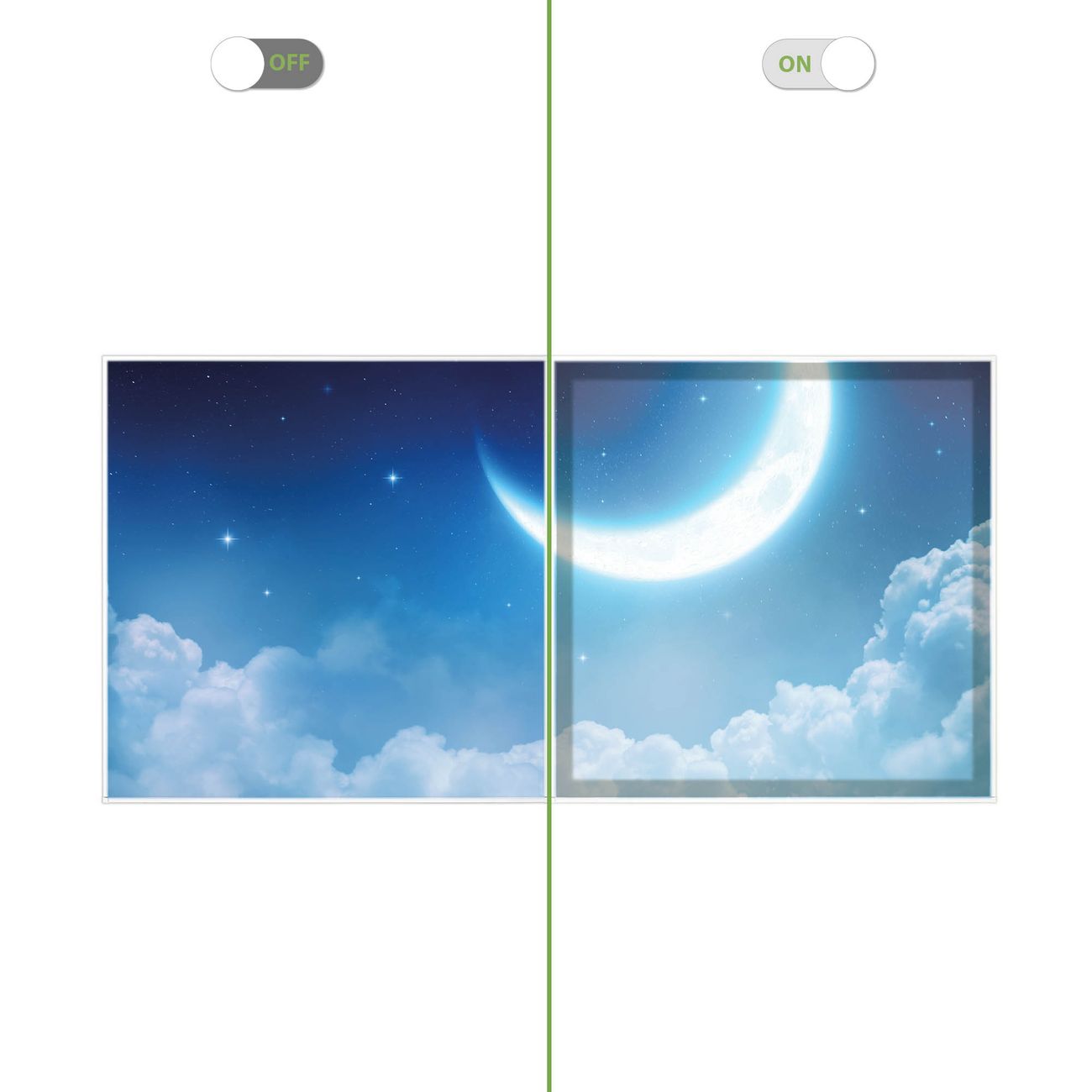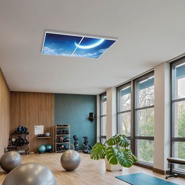 Entdecken Sie unsere vielseitigen Lichtdecken, hier in der Größe 124 x 62cm mit dem Motiv Motiv zunehmender Mond - Ihre Beleuchtungslösung für jede Umgebung Beleuchten Sie Ihren Raum nicht nur, sondern schaffen Sie Atmosphäre! Die banjado Lichtdecke verwandelt jeden Ort, ob zu Hause, in Praxen, Büros oder Studios in eine Wohlfühloase. Unsere einzelnen Elemente haben eine genormte Einheitsgröße von 62 x 62cm und können somit in jede gängige Rasterdecken verbaut werden. So finden Sie Ihre passende Ausführung: Gern helfen wir Ihnen, die passende Ausführung zu wählen. Hierfür muss die aktuelle Gegebenheit Ihrer Decke oder Wand beachtet werden. Haben Sie bereits eine Rasterdecke (auch Odenwalddecke genannt)? Hier bestellen Sie lediglich das Motiv + Beleuchtungspanel, denn beides wird in die bereits vorhandene Decke eingelegt. Haben Sie eine glatte Decke mit Lichtauslass oder möchten die Lichtdecke an der Wand befestigen? Hier bestellen Sie bitte Motiv + Beleuchtungspanel + Deckenbefestigung, eine Aufbauanleitung liegt immer bei. Die Lichtdecke kann sowohl an der Decke als auch an der Wand montiert werden, perfekt für kreative Lichtakzente oder alternative Beleuchtungslösungen. Haben Sie bereits eine Lichtdecke und möchten nur das Motiv wechseln? Hier bestellen Sie bitte nur Motiv, der Wechsel ist denkbar einfach. Der Aufbau Ihrer banjado Lichtdecke gestaltet sich unkompliziert, dank einer verständlichen Anleitung, die Ihnen Schritt für Schritt durch den Montageprozess hilft. Für die endgültige Installation und den sicheren Anschluss empfehlen wir die Hinzuziehung eines Fachmanns, um die optimale Funktion und Sicherheit Ihrer Beleuchtung zu gewährleisten. Falls Sie einen Fachmann für die Installation benötigen, geben Sie uns gern Bescheid, wir vermitteln Ihnen gern einen geeigneten Ansprechpartner aus Ihrer Nähe. Steuerung: Steigern Sie Ihr Beleuchtungserlebnis mit der nahtlosen Integration in Ihr Smart Home. Durch die Kompatibilität mit der SmartLife App, Alexa und Google Assistant wird Ihr Smartphone zur zentralen Steuerungseinheit. Ihr Handy fungiert hierbei sozusagen als Fernbedienung. Legen Sie individuelle Lichtszenen in der App fest, die bei Aktivierung über den Wand-Ein-/Ausschalter immer wieder abgerufen werden können ohne Handy. Mit der Szenenfunktion in der Smart App können Sie die Beleuchtung personalisieren und steuern, sodass sie auf Ihre individuellen Bedürfnisse, Tagesrhythmus und Stimmung zugeschnitten ist. Beispielsweise können Sie sich in der Morgendämmerung durch ein sanftes Licht wecken lassen oder das Licht der Praxis werktags um 7 Uhr automatisch einschalten lassen. Dieses kann dann natürlich auch zu einer bestimmten Zeit automatisch ausgeschaltet werden. Motivwahl: Diese einzigartige Lichtdecke zeichnet sich durch ihre Fähigkeit aus, die Lichtfarbe je nach gewähltem Motiv anzupassen - ein Baum wirft ein sanftes grünes Licht, während eine Wolkendecke Ihren Raum in ein beruhigendes blaues Leuchten hüllt. Berücksichtigen Sie dies bitte bei Ihrer Motivauswahl. Sie können das Motiv jederzeit ohne großen Aufwand austauschen, ob nach Jahreszeit oder anderem Anlass, unsere Auswahl lässt kaum Wünsche offen. Wir fertigen Ihnen gern eine personalisierte Lichtdecke mit einem eigenen Motiv oder Logo oder Foto, schreiben Sie uns jederzeit an. Technische Daten: Das Motiv ist auf einer 4mm starken Acrylglas Scheibe aufgebracht, das Gesamtgewicht Ihrer Ausführung beträgt 9,9kg. Die Farbtemperatur lässt sich frei einstellen von 3000 bis 6000 Kelvin, damit können Sie stufenlos zwischen warmweiß, neutralweiß und kaltweiß wählen. Die Gesamtleistung bei Ihrer gewählten Ausführung beträgt 80W. Der Lichtstrom beträgt 3600 Lumen, die Nennspannung 230 V. Die Lichtdecke ist mit Schutzart IP20 für den Innenbereich konzipiert und sollte nicht im Nassbereich verwendet werden.