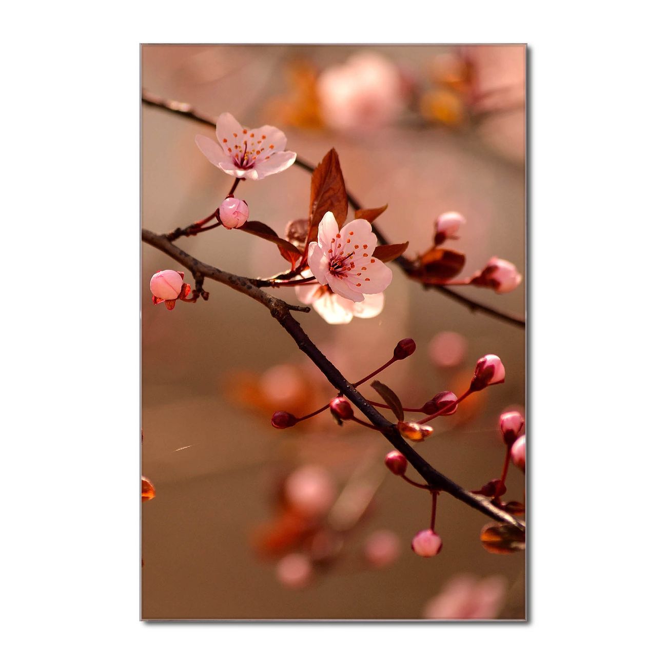 Brillantes Glasbild im Hochformat Blühender Kirschzweig