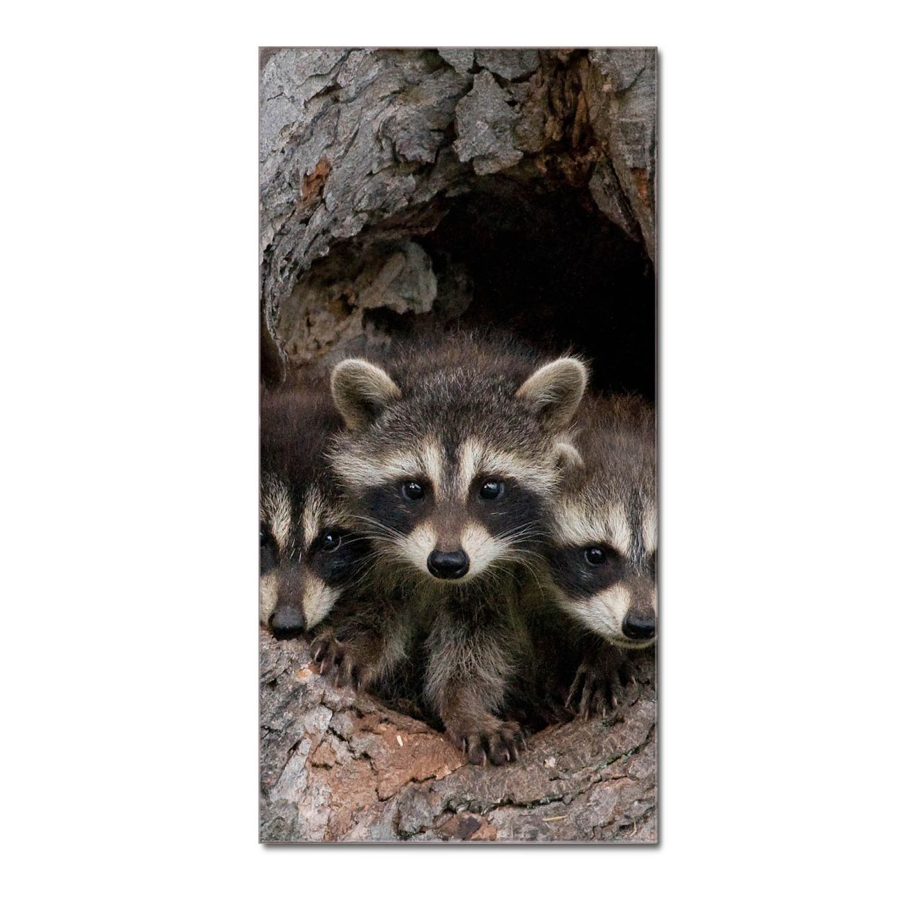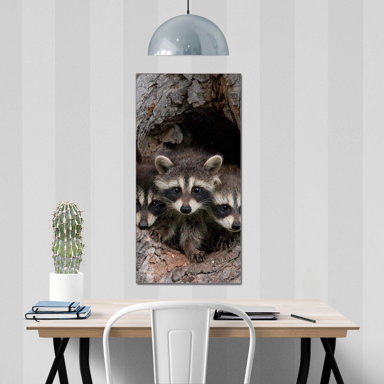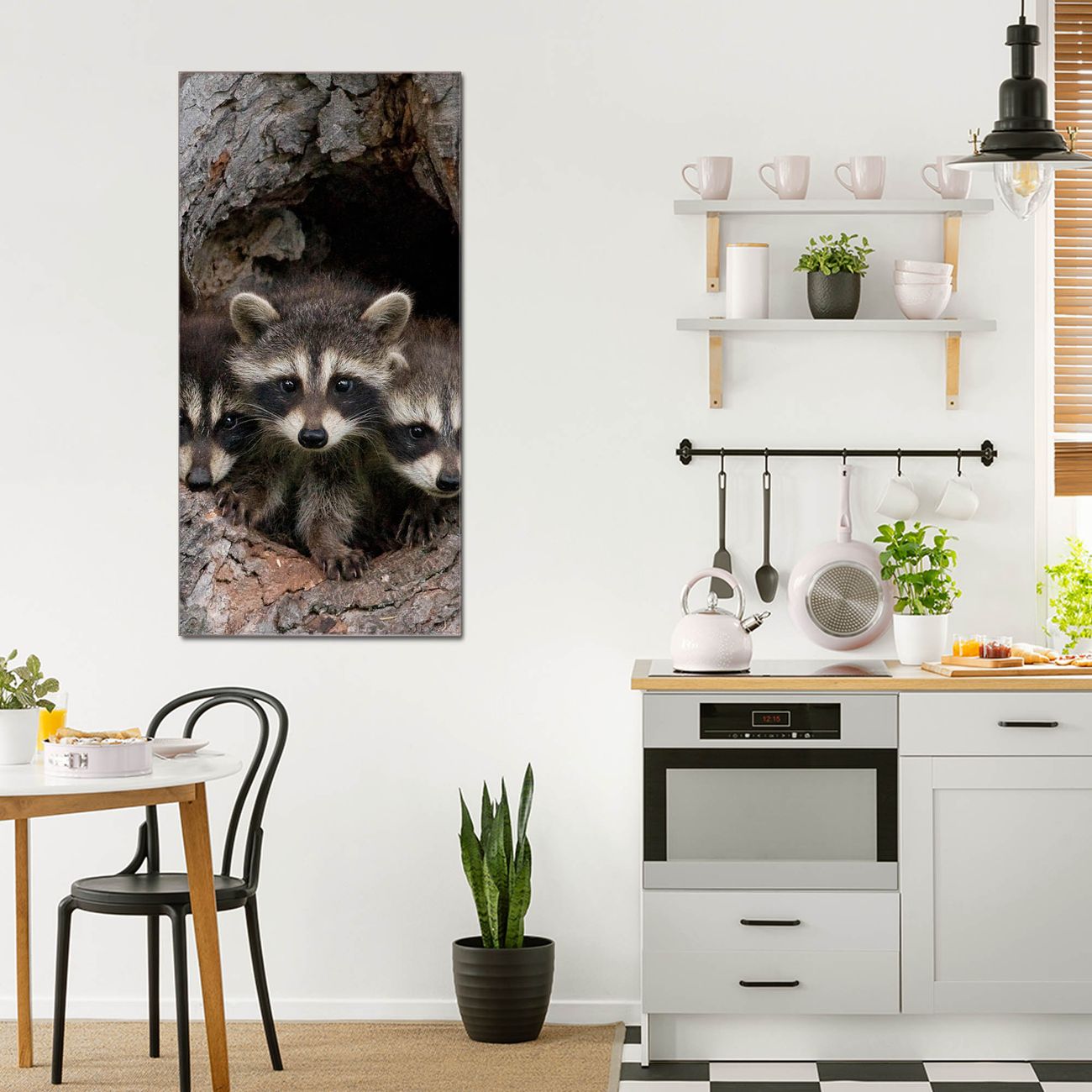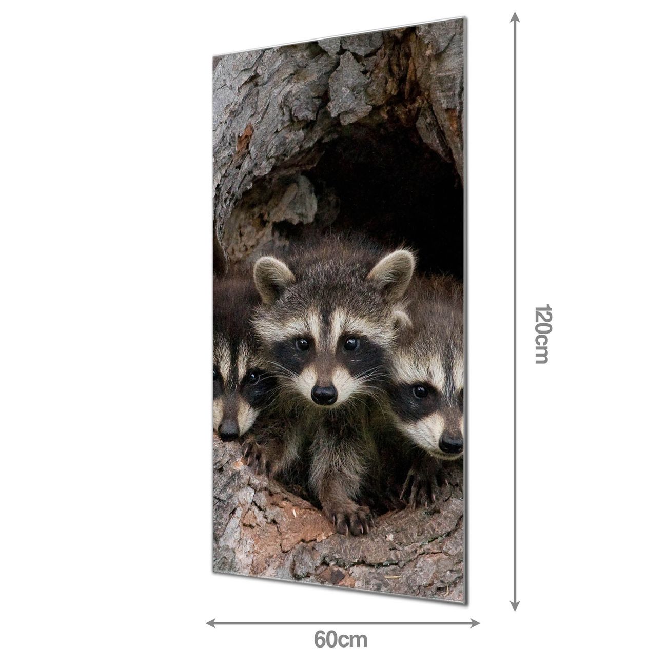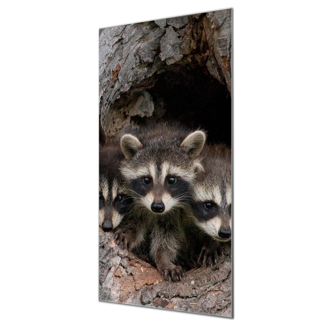 Unsere brillanten Glasbilder im Hochformat von banjado mit Motiv Drei Waschbären sind der absolute Hingucker! Unsere Banjado Glasbilder sind sehr begehrt, weil sie top verarbeitet sind und sich ganz leicht montieren lassen. Schon mit wenigen Handgriffen hängen sie an der Wand und strahlen mit höchster brillianz. Durch die Ramenlose Herstellung schwebt das Echtglasbild förmlich an der Wand. Das Motiv erscheint besonders ausdrucksstark und hochwertig und ist hinter dem Echtglas geschützt.