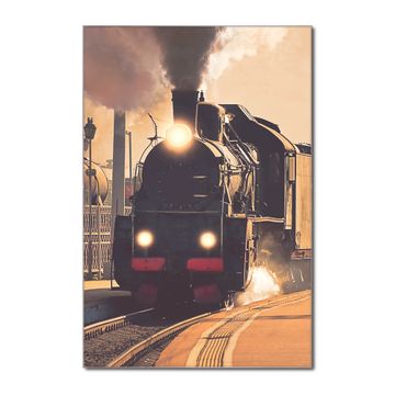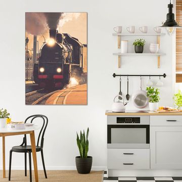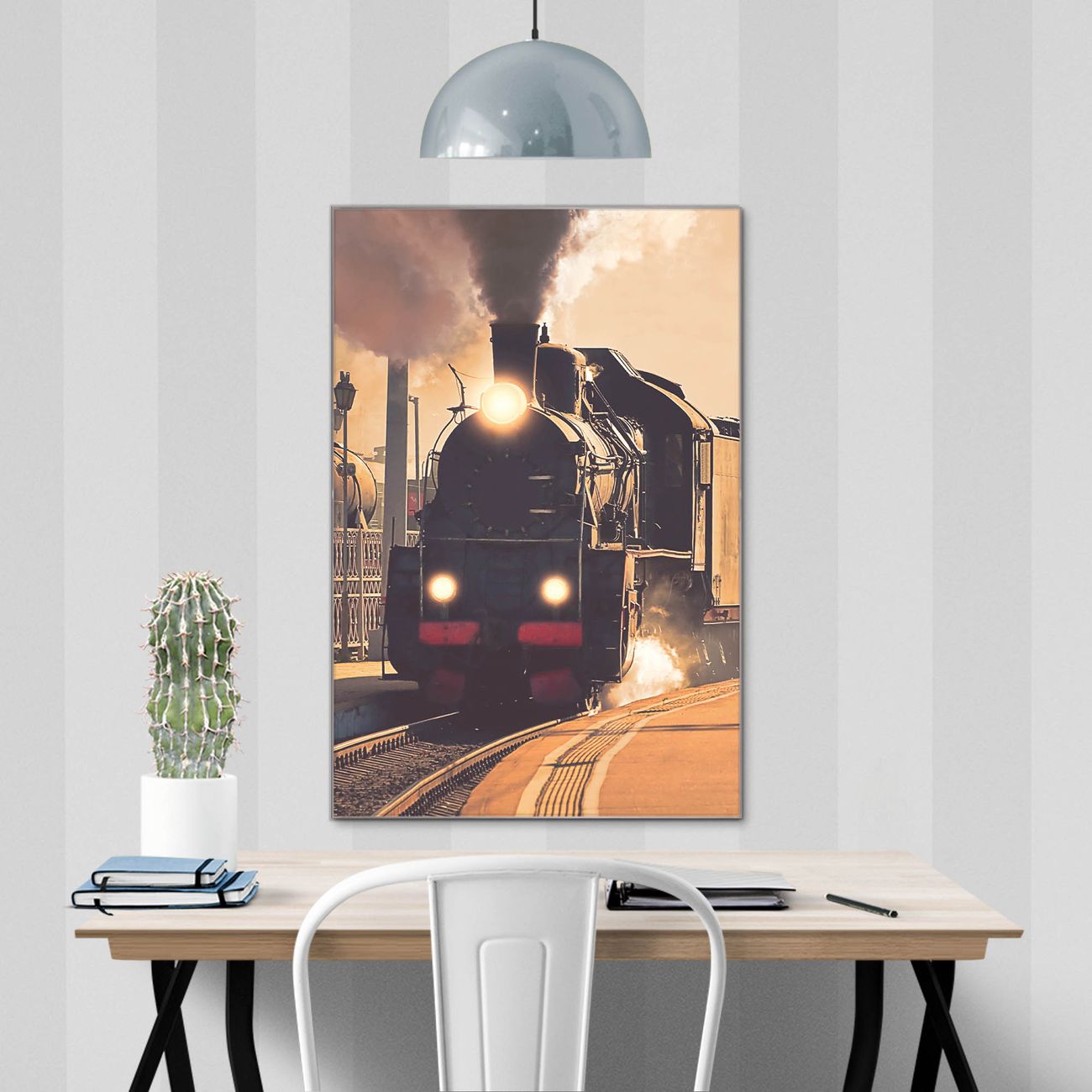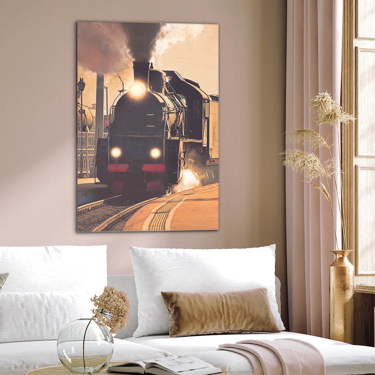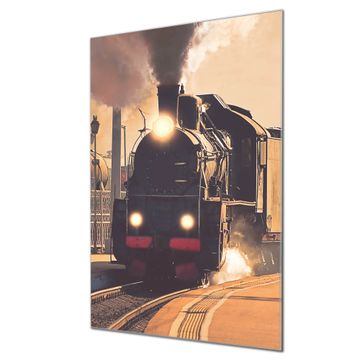Brillantes Glasbild im Hochformat Einfahrender Zug
