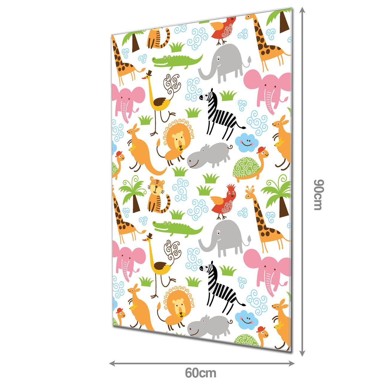 Material  4mm Sicherheitsglas mit Metallrückwand Eigenschaften  farbbrillant, kratzfest, rahmenlos Maße  60x90x0,6cm, 8,10 kg schwer Motiv  Nummer 11279 Fröhliche Tiere