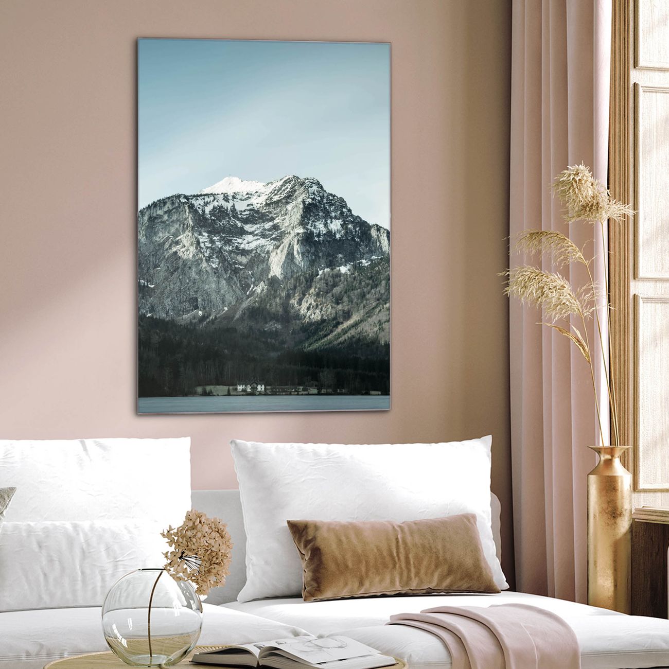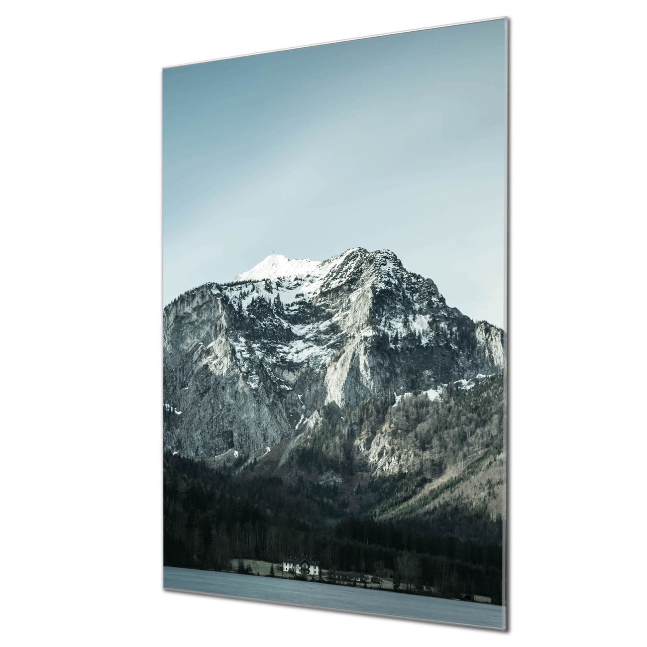 Brillantes Glasbild im Hochformat Im Schatten des Bergs