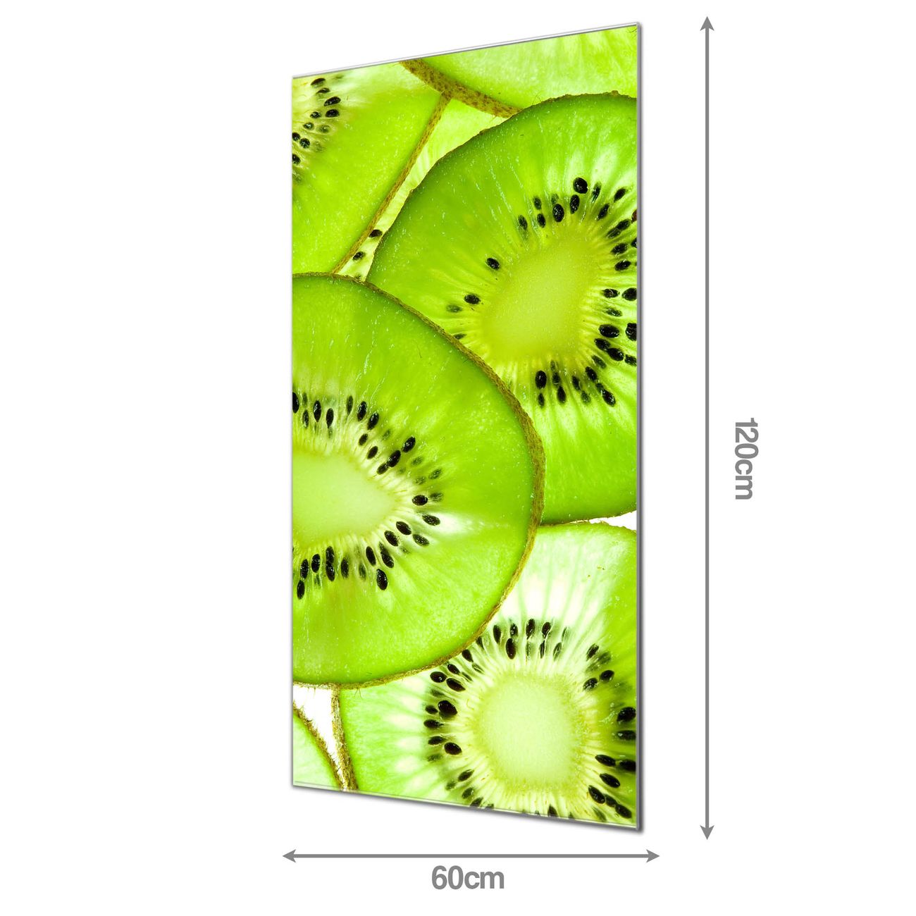 Material  4mm Sicherheitsglas mit Metallrückwand Eigenschaften  farbbrillant, kratzfest, rahmenlos Maße  60x120x0,6cm, 10,80 kg schwer Motiv  Nummer 11725 Kiwi