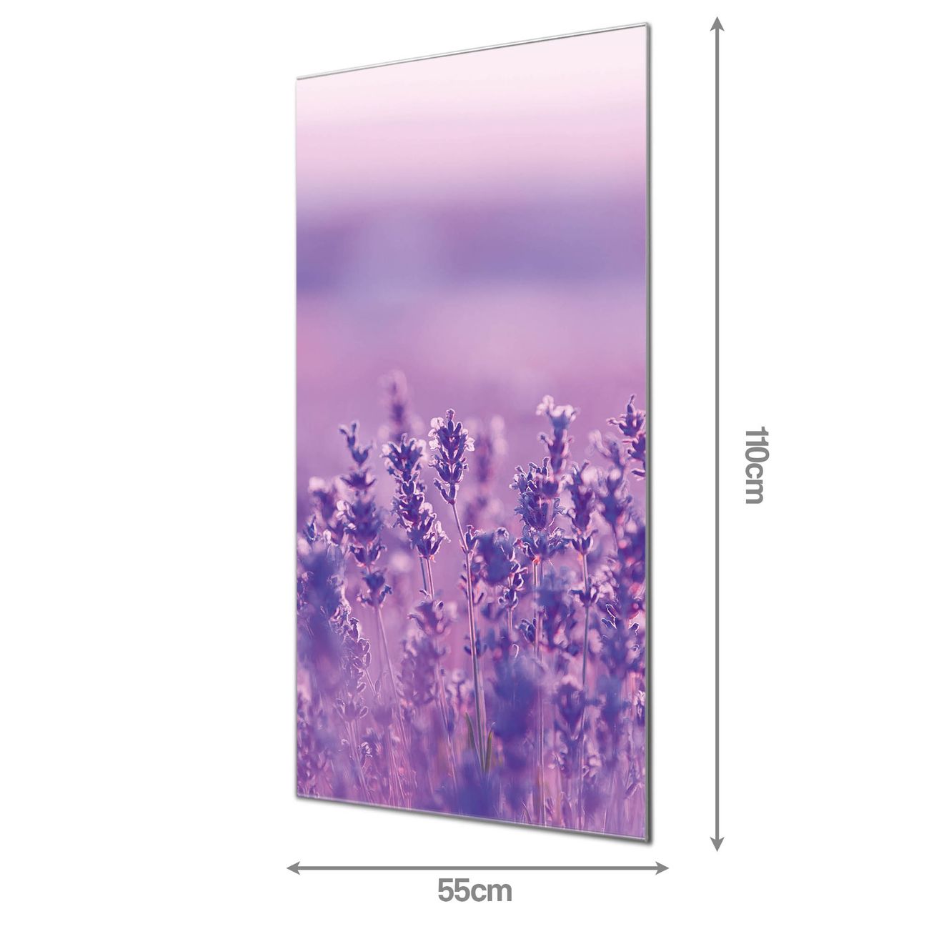 Material  4mm Sicherheitsglas mit Metallrückwand Eigenschaften  farbbrillant, kratzfest, rahmenlos Maße  55x110x0,6cm, 9,08 kg schwer Motiv  Nummer 11483 Lavendelmeer