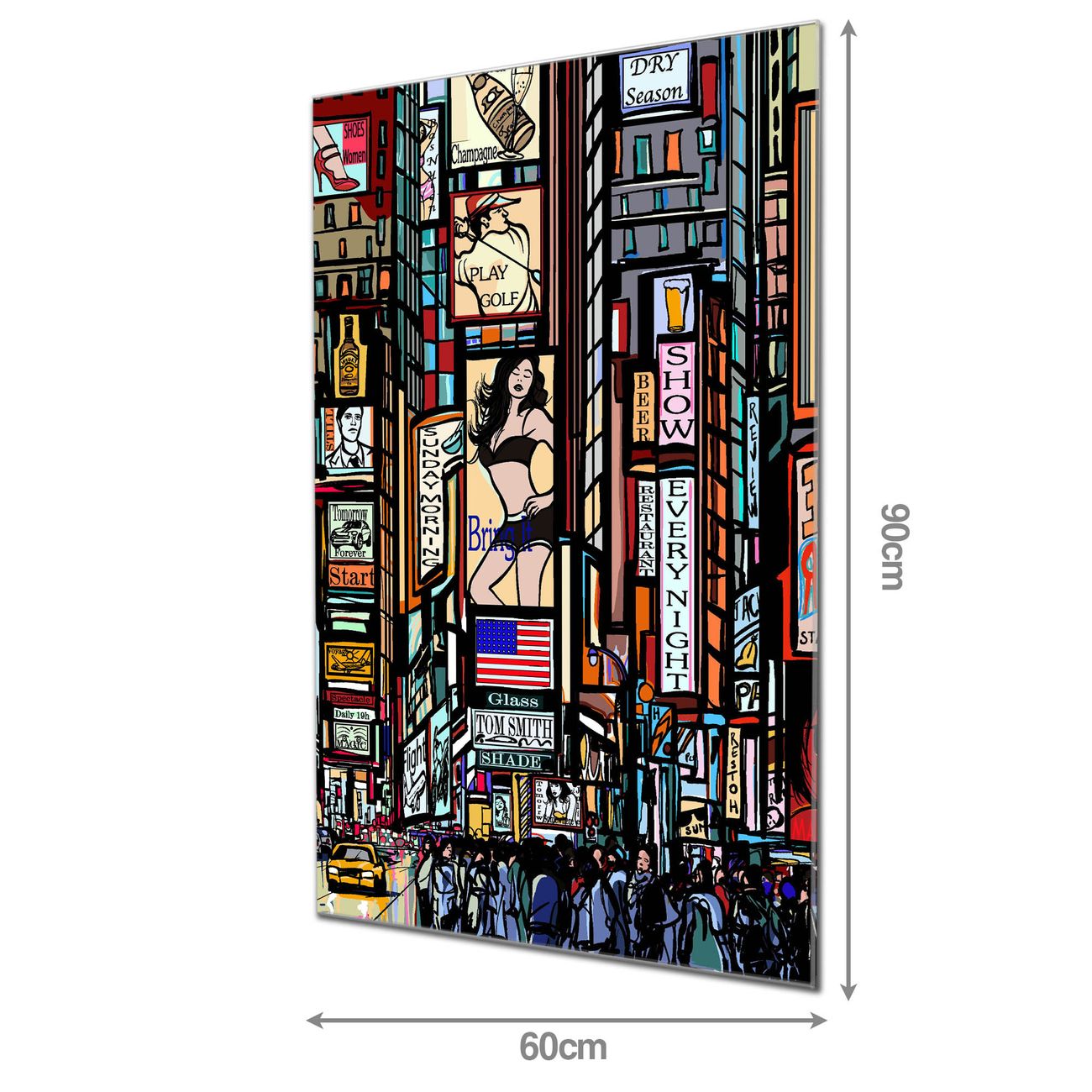 Material  4mm Sicherheitsglas mit Metallrückwand Eigenschaften  farbbrillant, kratzfest, rahmenlos Maße  60x90x0,6cm, 8,10 kg schwer Motiv  Nummer 11145 New York Show