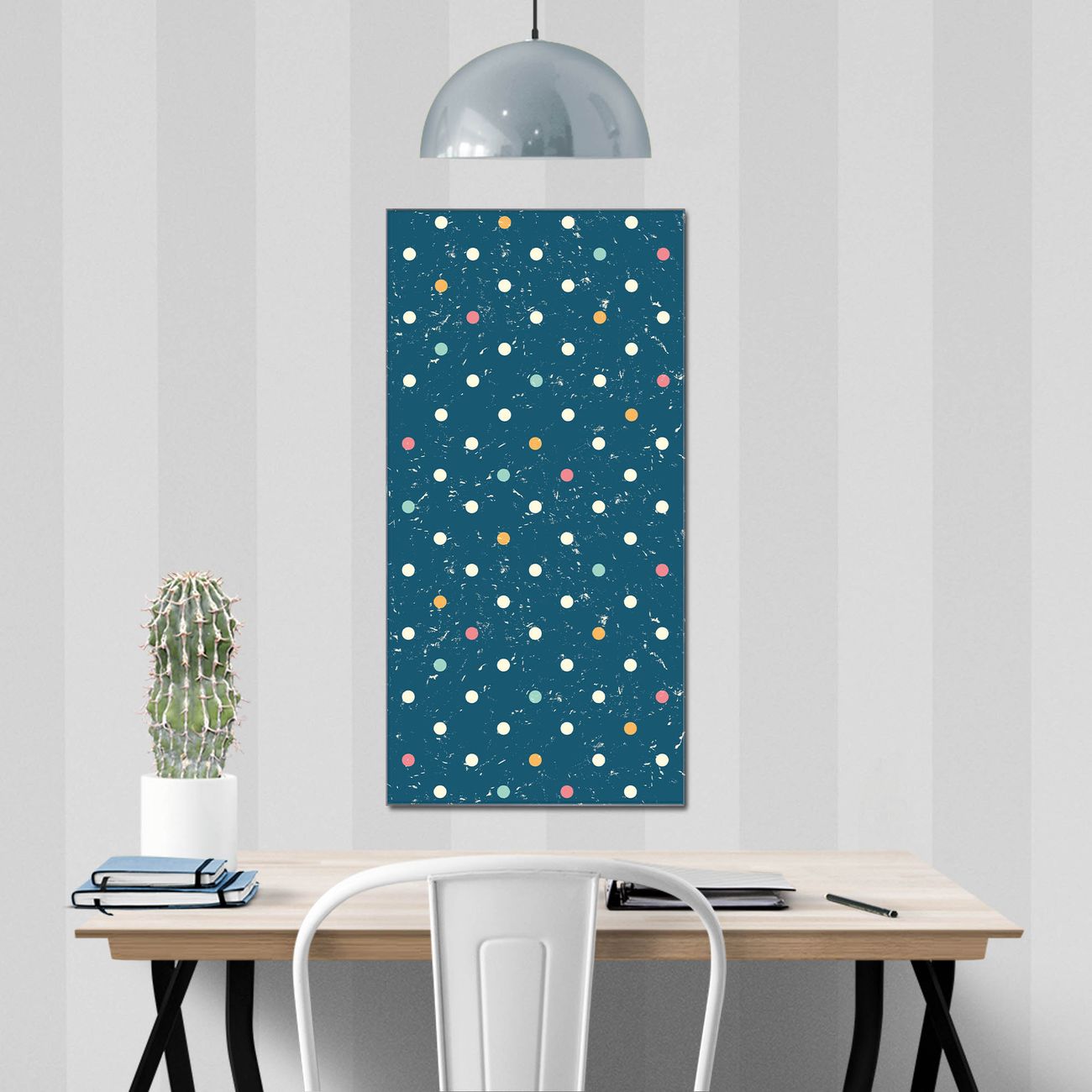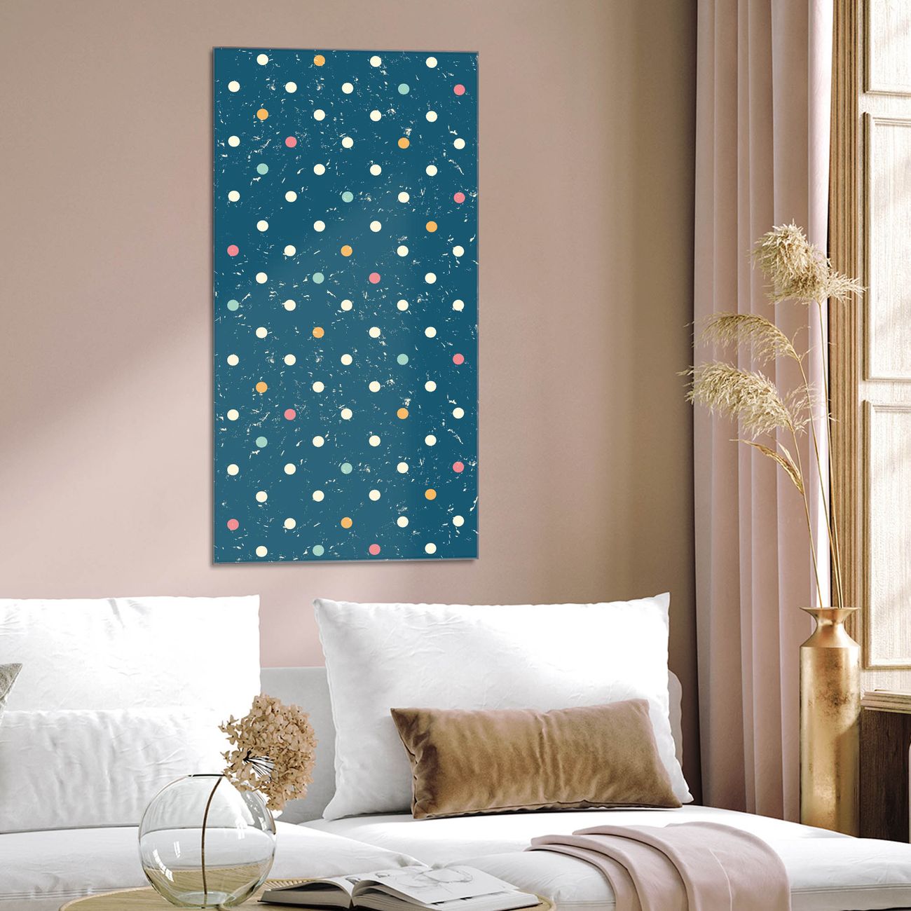 Brillantes Glasbild im Hochformat Punkte auf Blau