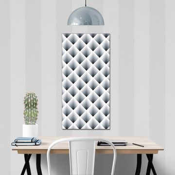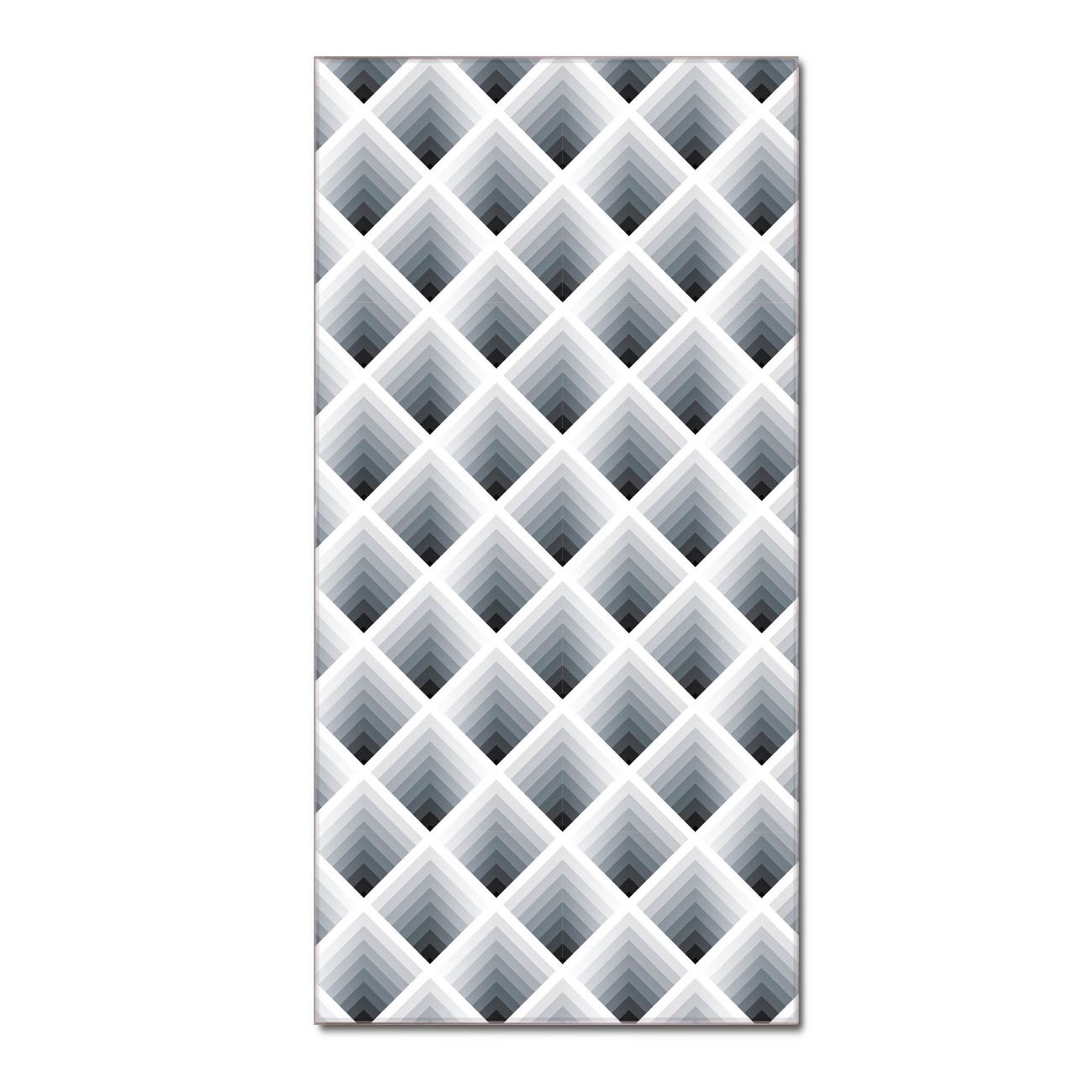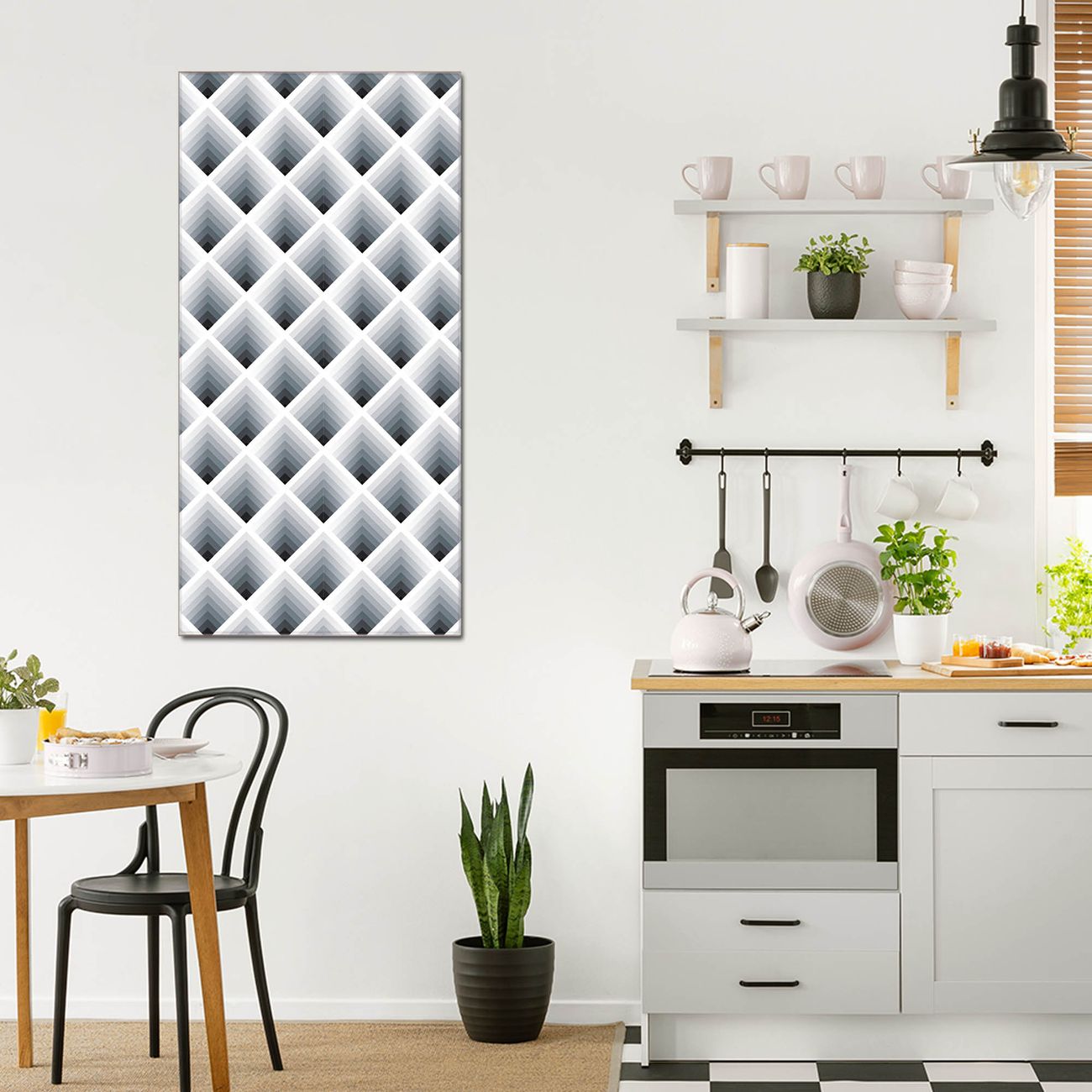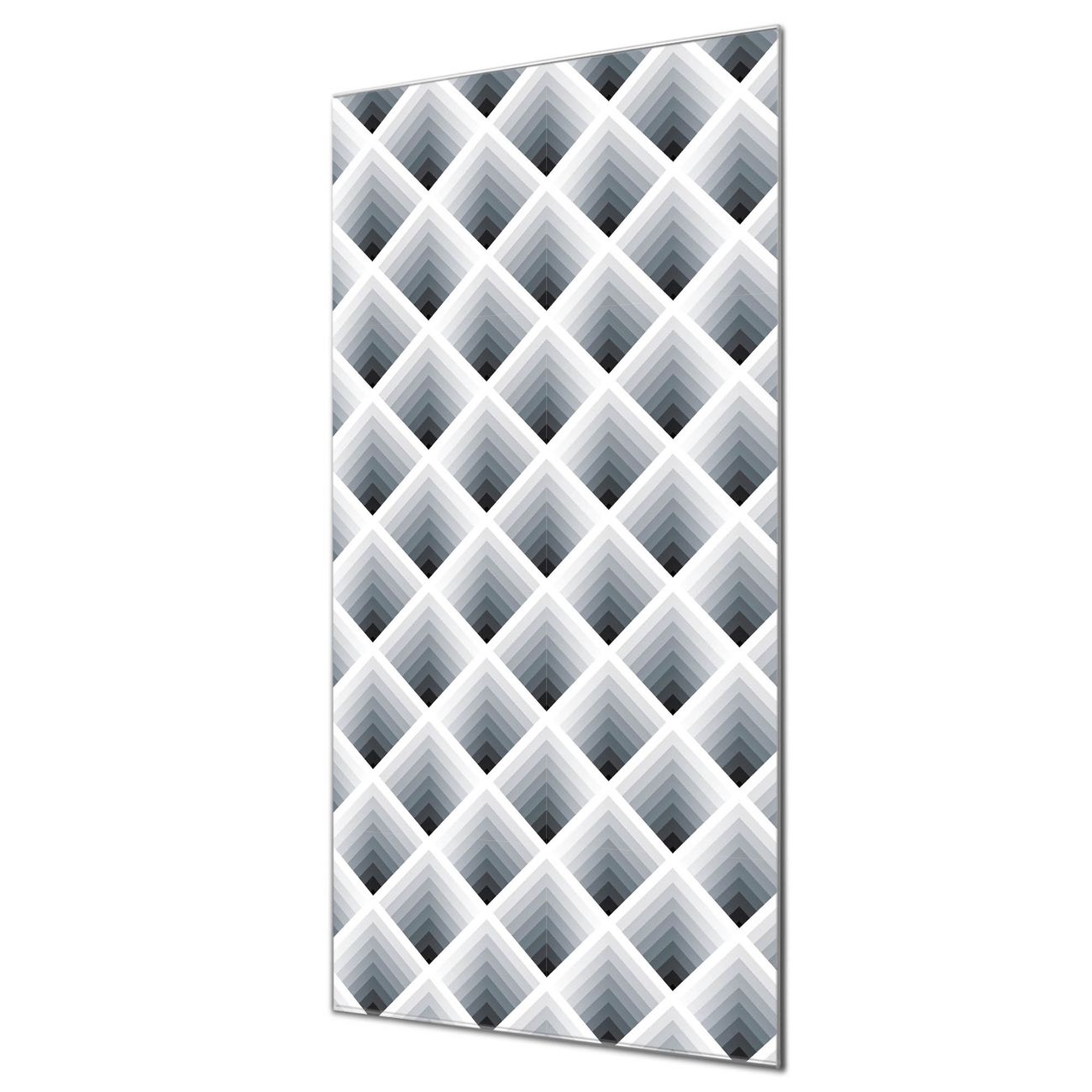 Material  4mm Sicherheitsglas mit Metallrückwand Eigenschaften  farbbrillant, kratzfest, rahmenlos Maße  50x100x0,6cm, 7,50 kg schwer Motiv  Nummer 11937 Raster 3D Grau