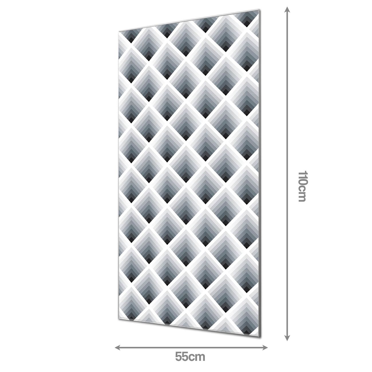 Material  4mm Sicherheitsglas mit Metallrückwand Eigenschaften  farbbrillant, kratzfest, rahmenlos Maße  55x110x0,6cm, 9,08 kg schwer Motiv  Nummer 11937 Raster 3D Grau