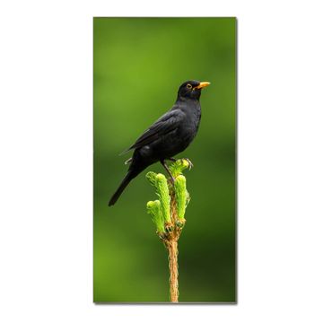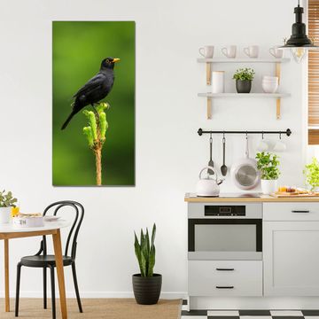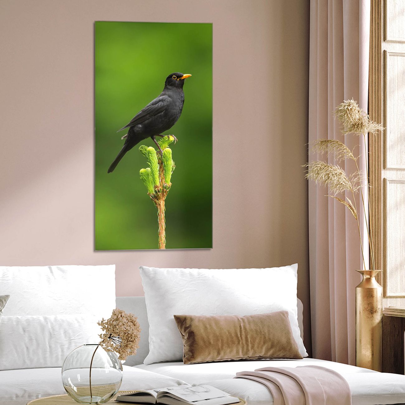 Brillantes Glasbild im Hochformat Vogel auf Tannenzweig
