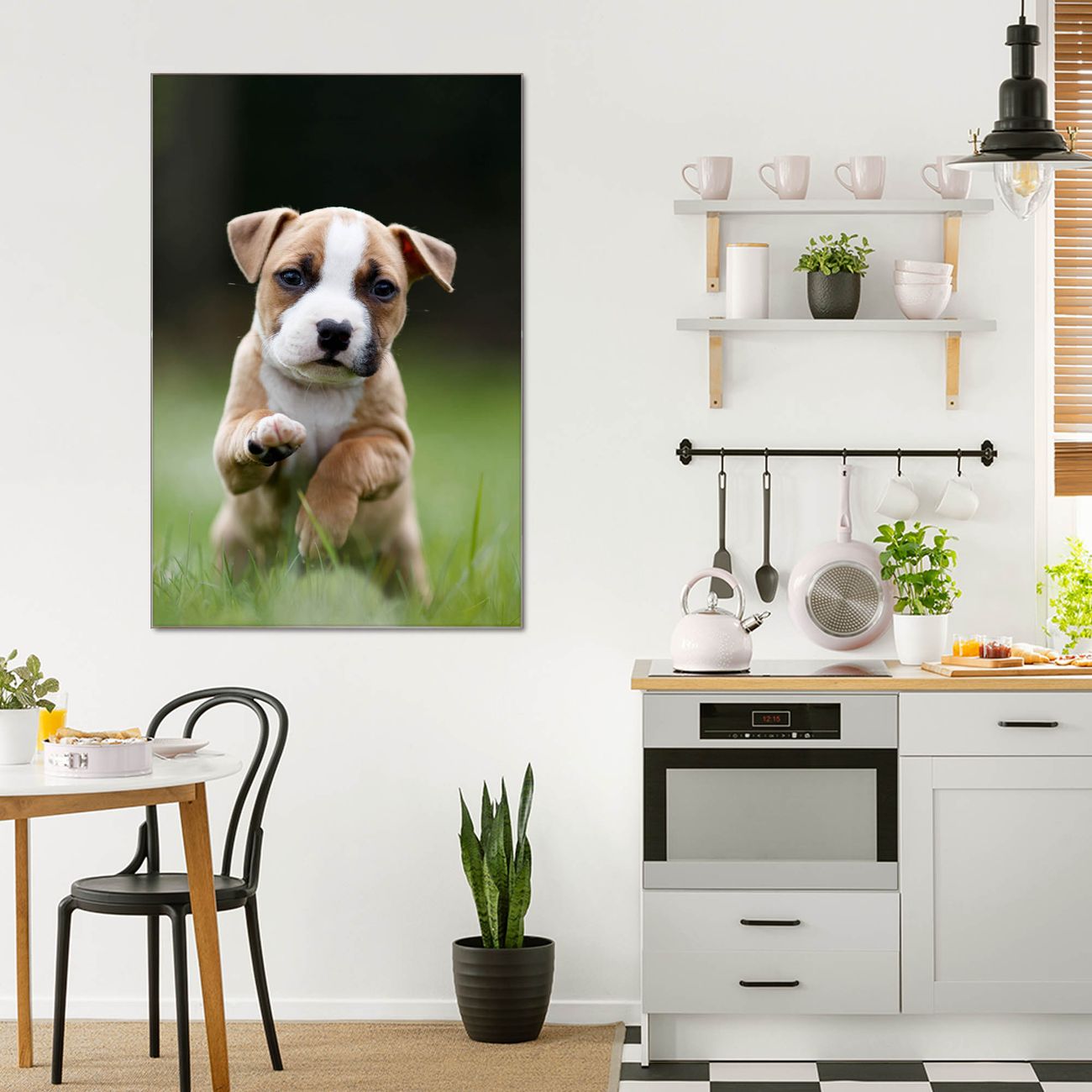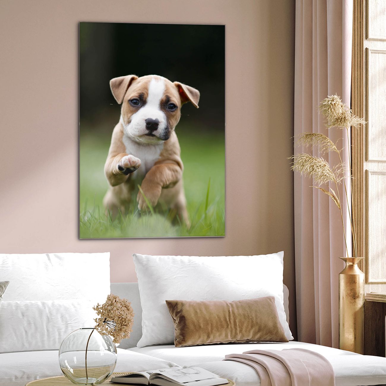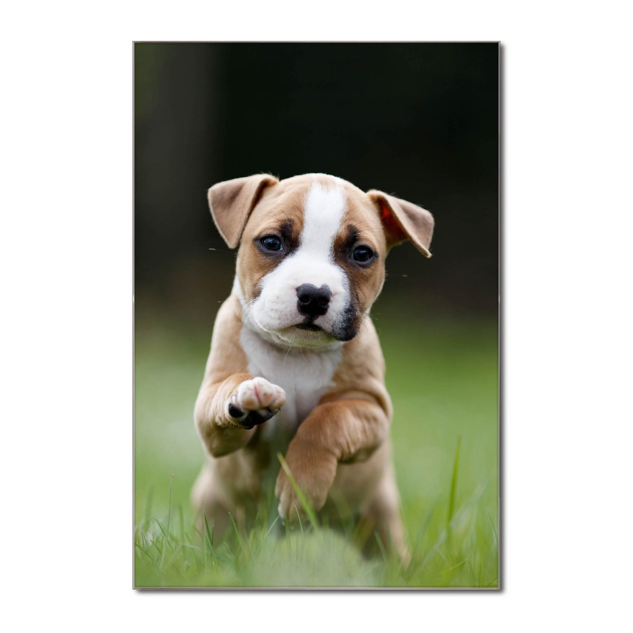 Brillantes Glasbild im Hochformat Welpe im Gras