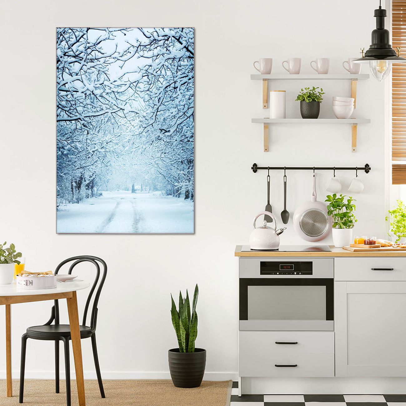 Brillantes Glasbild im Hochformat Winterspaziergang