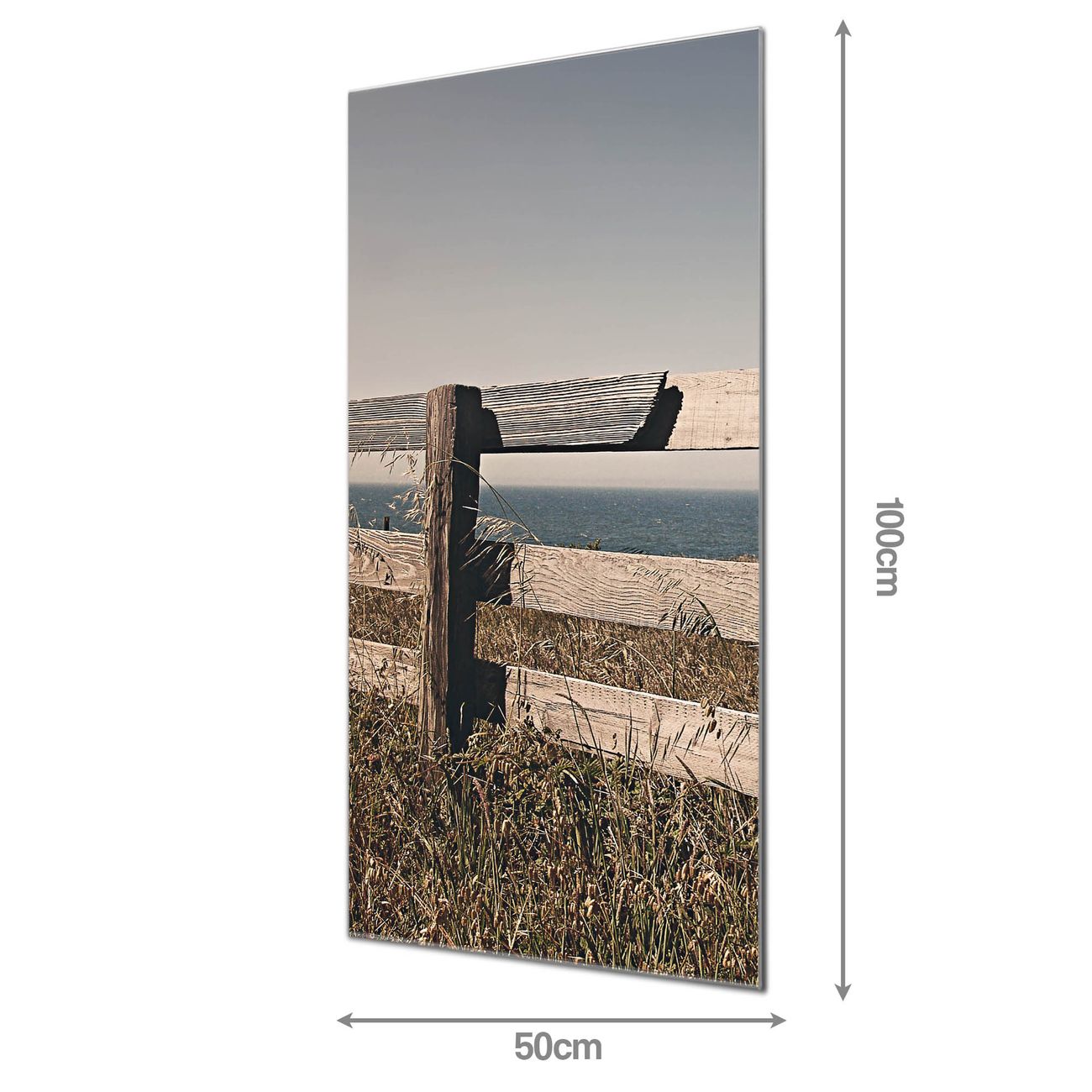 Material  4mm Sicherheitsglas mit Metallrückwand Eigenschaften  farbbrillant, kratzfest, rahmenlos Maße  50x100x0,6cm, 7,50 kg schwer Motiv  Nummer 11906 Zaun am Meer