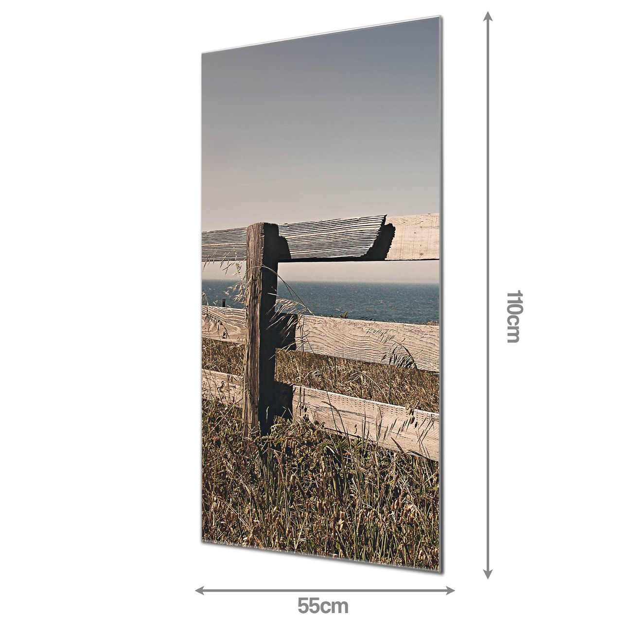 Material  4mm Sicherheitsglas mit Metallrückwand Eigenschaften  farbbrillant, kratzfest, rahmenlos Maße  55x110x0,6cm, 9,08 kg schwer Motiv  Nummer 11906 Zaun am Meer
