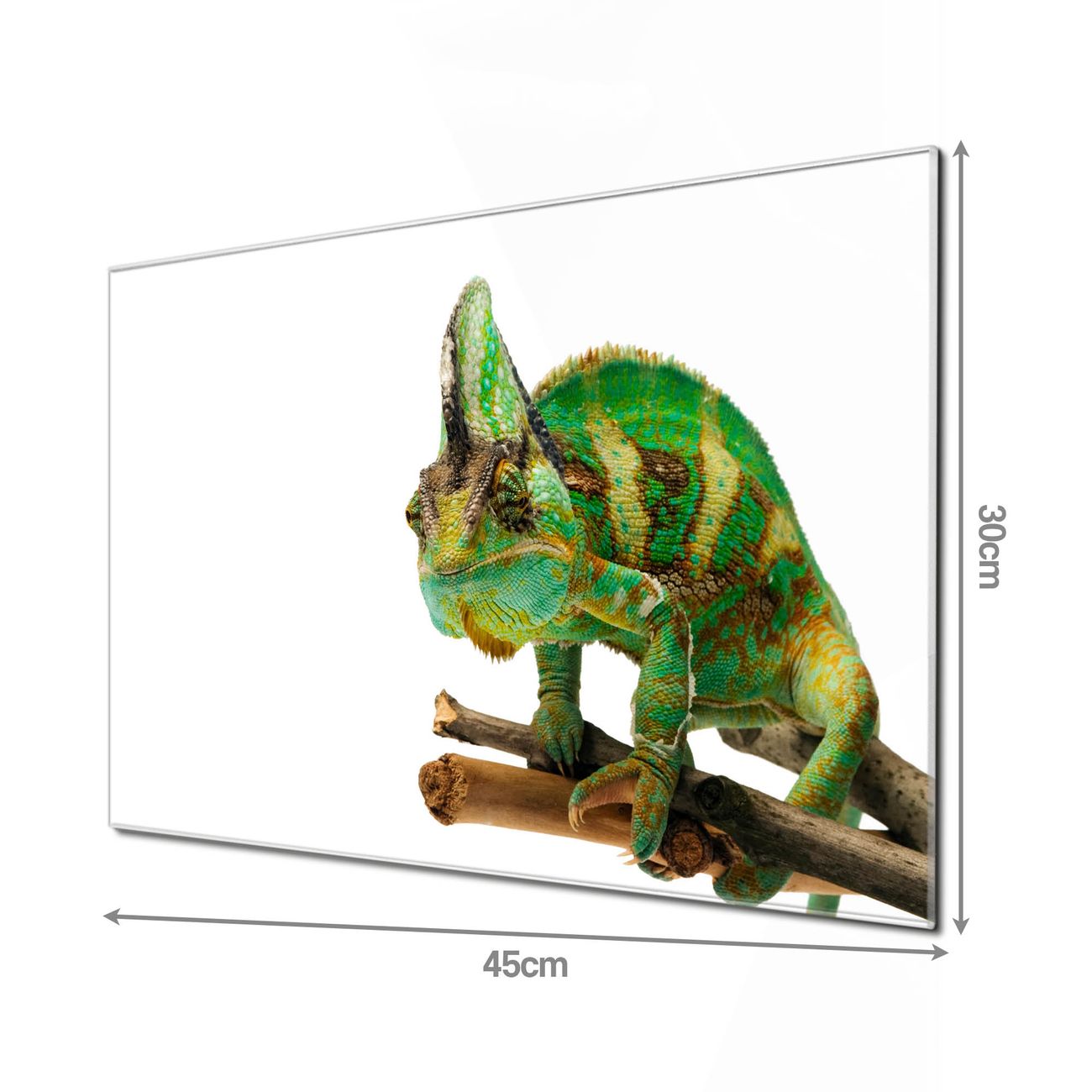 Unsere einzigartigen Glasbilder im Querformat von banjado mit Motiv Chamäleon sind der absolute Hingucker! Unsere Banjado Glasbilder sind sehr begehrt, weil sie top verarbeitet sind und sich ganz leicht montieren lassen. Schon mit wenigen Handgriffen hängen sie an der Wand und strahlen mit höchster brillianz. Durch die Ramenlose Herstellung schwebt das Echtglasbild förmlich an der Wand. Das Motiv erscheint besonders ausdrucksstark und hochwertig und ist hinter dem Echtglas geschützt.