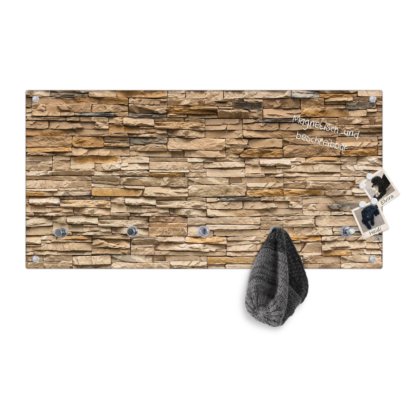 Bitte beachten Sie, dass an dieser Garderobe nur starke Neodym-Magnete halten! FUNKTION: Die banjado Wandgarderobe mit Motiv Alte Mauer ist Ihr täglicher Begleiter. Zuverlässig hängen hier Ihre Jacken und Mäntel griffbereit. Gleichzeitig ist die Design Garderobe magnetisch, Sie können Notizen anheften und durch das Echtglas ist Ihr Paneel auch beschreibbar und wieder abwischbar. DESIGN: Sie erhalten eine Garderobenleiste aus elegantem Echtglas mit dem Farbbrillanten Motiv Alte Mauer hinterklebt. Das Design ist zeitlos klassisch, ohne dabei auf Funktionalität zu verzichten. Suchen Sie aus einer Vielzahl von Motiven das für Ihre Einrichtung Passende aus. DETAILS: Die Flurgarderobe besteht aus 4mm gehärtetem Sicherheitsglas. Sie ist 80cm breit, 40cm hoch und 6cm tief. Die Garderobenhaken zur Selbstmontage präsentieren sich in Edelstahl-Optik, ebenso die Abstandshalter für die Wandmontage. Ihre neue Garderobe ist sofort einsatzbereit. NUTZEN: Ihre neue Garderobe hält nicht nur zuverlässig Ihre Kleidung, sie ist auch optisch ein Blickfang. Durch die magnetische Wirkung können Sie mit 4 beigefügten extrastarken Neodym-Magneten Notizen anheften und mit wasserlöslichen Kreidestiften oder Whiteboard-Markern auch Nachrichten hinterlassen. BANJADO: Wir sind ein kleines kreatives Team aus Sachsen und entwickeln Produkte die Design und Funktionalität verbinden sollen. Viel Freude mit Ihrer neuen Garderobe wünscht das banjado-Team!