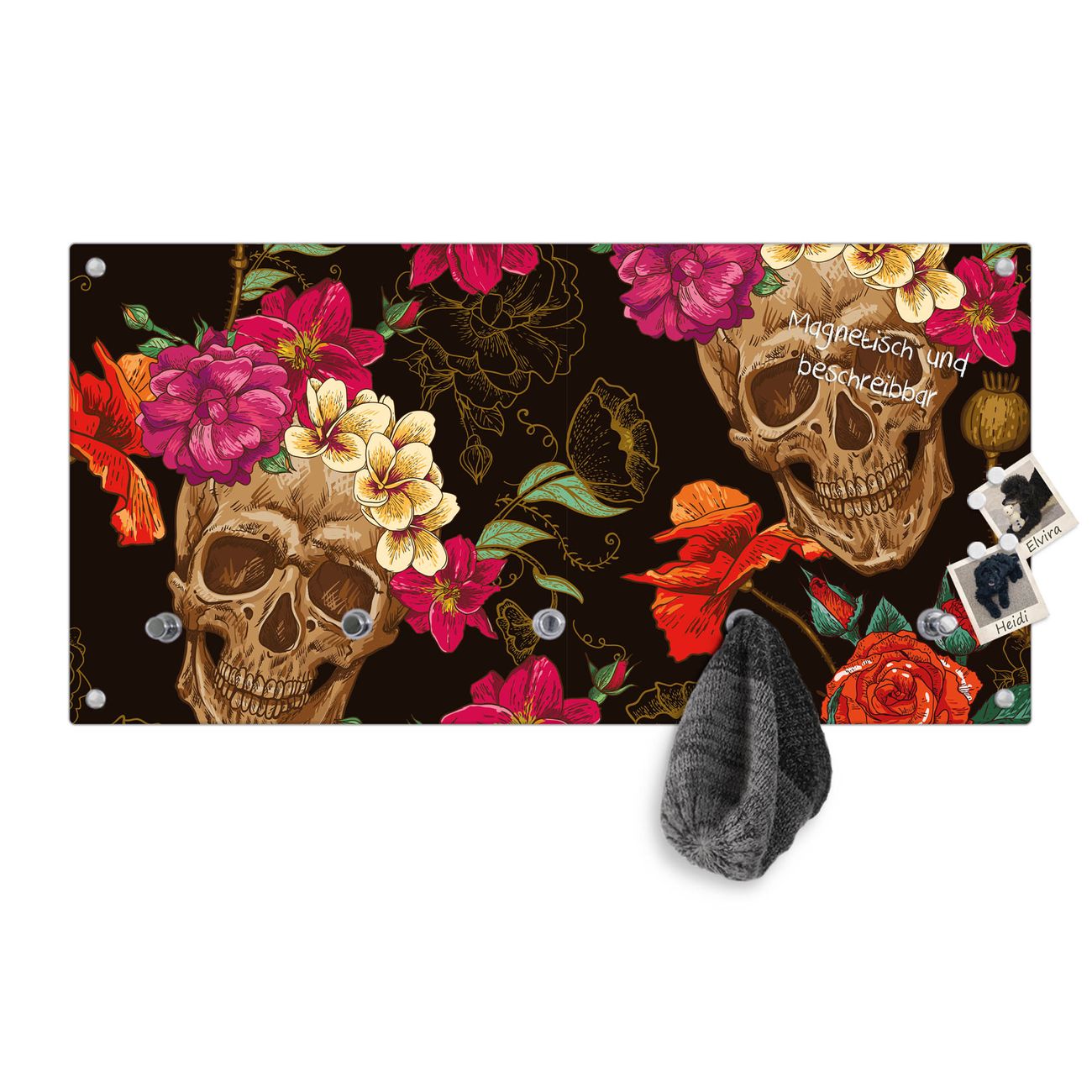 Bitte beachten Sie, dass an dieser Garderobe nur starke Neodym-Magnete halten! FUNKTION: Die banjado Wandgarderobe mit Motiv Los Dias de Muertos ist Ihr täglicher Begleiter. Zuverlässig hängen hier Ihre Jacken und Mäntel griffbereit. Gleichzeitig ist die Design Garderobe magnetisch, Sie können Notizen anheften und durch das Echtglas ist Ihr Paneel auch beschreibbar und wieder abwischbar. DESIGN: Sie erhalten eine Garderobenleiste aus elegantem Echtglas mit dem Farbbrillanten Motiv Los Dias de Muertos hinterklebt. Das Design ist zeitlos klassisch, ohne dabei auf Funktionalität zu verzichten. Suchen Sie aus einer Vielzahl von Motiven das für Ihre Einrichtung Passende aus. DETAILS: Die Flurgarderobe besteht aus 4mm gehärtetem Sicherheitsglas. Sie ist 80cm breit, 40cm hoch und 6cm tief. Die Garderobenhaken zur Selbstmontage präsentieren sich in Edelstahl-Optik, ebenso die Abstandshalter für die Wandmontage. Ihre neue Garderobe ist sofort einsatzbereit. NUTZEN: Ihre neue Garderobe hält nicht nur zuverlässig Ihre Kleidung, sie ist auch optisch ein Blickfang. Durch die magnetische Wirkung können Sie mit 4 beigefügten extrastarken Neodym-Magneten Notizen anheften und mit wasserlöslichen Kreidestiften oder Whiteboard-Markern auch Nachrichten hinterlassen. BANJADO: Wir sind ein kleines kreatives Team aus Sachsen und entwickeln Produkte die Design und Funktionalität verbinden sollen. Viel Freude mit Ihrer neuen Garderobe wünscht das banjado-Team!