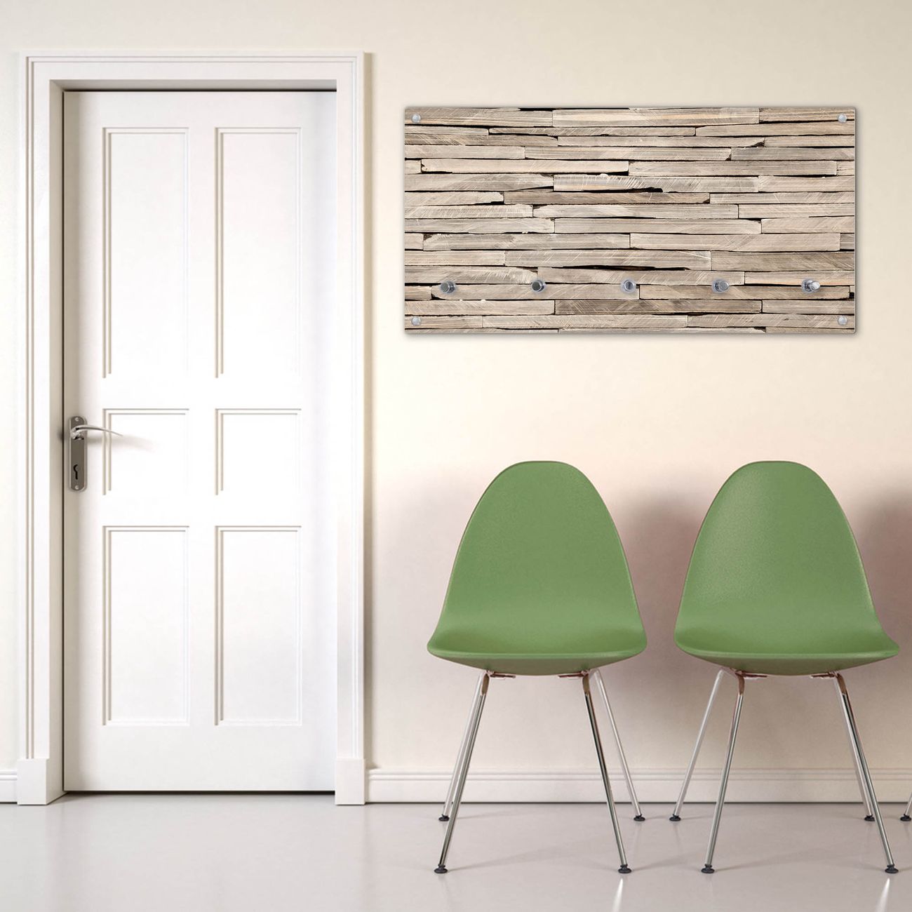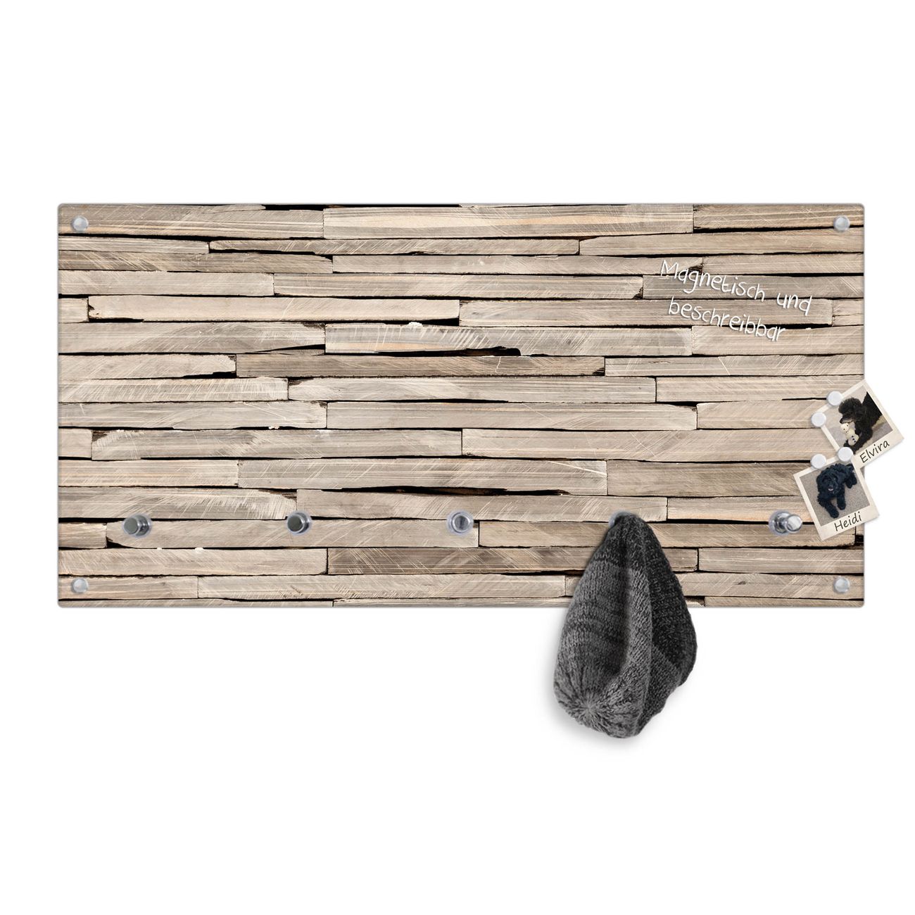 Bitte beachten Sie, dass an dieser Garderobe nur starke Neodym-Magnete halten! FUNKTION: Die banjado Wandgarderobe mit Motiv Steinplatten ist Ihr täglicher Begleiter. Zuverlässig hängen hier Ihre Jacken und Mäntel griffbereit. Gleichzeitig ist die Design Garderobe magnetisch, Sie können Notizen anheften und durch das Echtglas ist Ihr Paneel auch beschreibbar und wieder abwischbar. DESIGN: Sie erhalten eine Garderobenleiste aus elegantem Echtglas mit dem Farbbrillanten Motiv Steinplatten hinterklebt. Das Design ist zeitlos klassisch, ohne dabei auf Funktionalität zu verzichten. Suchen Sie aus einer Vielzahl von Motiven das für Ihre Einrichtung Passende aus. DETAILS: Die Flurgarderobe besteht aus 4mm gehärtetem Sicherheitsglas. Sie ist 80cm breit, 40cm hoch und 6cm tief. Die Garderobenhaken zur Selbstmontage präsentieren sich in Edelstahl-Optik, ebenso die Abstandshalter für die Wandmontage. Ihre neue Garderobe ist sofort einsatzbereit. NUTZEN: Ihre neue Garderobe hält nicht nur zuverlässig Ihre Kleidung, sie ist auch optisch ein Blickfang. Durch die magnetische Wirkung können Sie mit 4 beigefügten extrastarken Neodym-Magneten Notizen anheften und mit wasserlöslichen Kreidestiften oder Whiteboard-Markern auch Nachrichten hinterlassen. BANJADO: Wir sind ein kleines kreatives Team aus Sachsen und entwickeln Produkte die Design und Funktionalität verbinden sollen. Viel Freude mit Ihrer neuen Garderobe wünscht das banjado-Team!