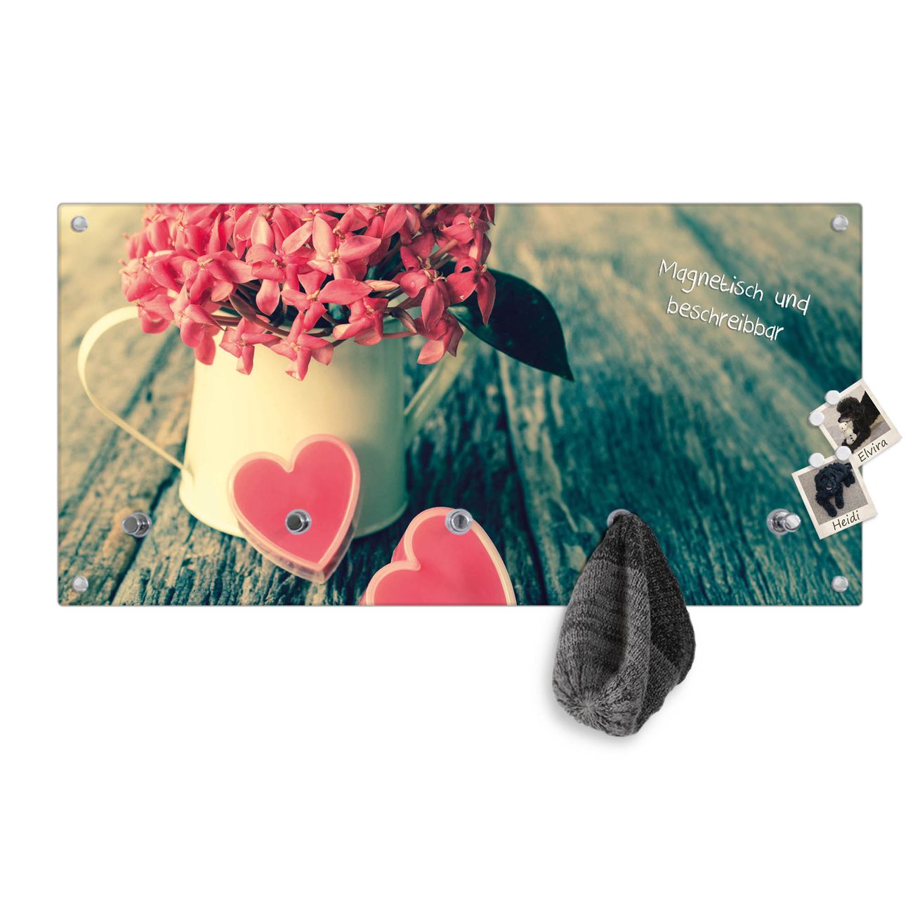 Bitte beachten Sie, dass an dieser Garderobe nur starke Neodym-Magnete halten! FUNKTION: Die banjado Wandgarderobe mit Motiv Valentin ist Ihr täglicher Begleiter. Zuverlässig hängen hier Ihre Jacken und Mäntel griffbereit. Gleichzeitig ist die Design Garderobe magnetisch, Sie können Notizen anheften und durch das Echtglas ist Ihr Paneel auch beschreibbar und wieder abwischbar. DESIGN: Sie erhalten eine Garderobenleiste aus elegantem Echtglas mit dem Farbbrillanten Motiv Valentin hinterklebt. Das Design ist zeitlos klassisch, ohne dabei auf Funktionalität zu verzichten. Suchen Sie aus einer Vielzahl von Motiven das für Ihre Einrichtung Passende aus. DETAILS: Die Flurgarderobe besteht aus 4mm gehärtetem Sicherheitsglas. Sie ist 80cm breit, 40cm hoch und 6cm tief. Die Garderobenhaken zur Selbstmontage präsentieren sich in Edelstahl-Optik, ebenso die Abstandshalter für die Wandmontage. Ihre neue Garderobe ist sofort einsatzbereit. NUTZEN: Ihre neue Garderobe hält nicht nur zuverlässig Ihre Kleidung, sie ist auch optisch ein Blickfang. Durch die magnetische Wirkung können Sie mit 4 beigefügten extrastarken Neodym-Magneten Notizen anheften und mit wasserlöslichen Kreidestiften oder Whiteboard-Markern auch Nachrichten hinterlassen. BANJADO: Wir sind ein kleines kreatives Team aus Sachsen und entwickeln Produkte die Design und Funktionalität verbinden sollen. Viel Freude mit Ihrer neuen Garderobe wünscht das banjado-Team!
