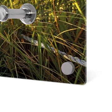 Bitte beachten Sie, dass an dieser Garderobe nur starke Neodym-Magnete halten! FUNKTION: Die banjado Wandgarderobe mit Motiv Weg zum Strand ist Ihr täglicher Begleiter. Zuverlässig hängen hier Ihre Jacken und Mäntel griffbereit. Gleichzeitig ist die Design Garderobe magnetisch, Sie können Notizen anheften und durch das Echtglas ist Ihr Paneel auch beschreibbar und wieder abwischbar. DESIGN: Sie erhalten eine Garderobenleiste aus elegantem Echtglas mit dem Farbbrillanten Motiv Weg zum Strand hinterklebt. Das Design ist zeitlos klassisch, ohne dabei auf Funktionalität zu verzichten. Suchen Sie aus einer Vielzahl von Motiven das für Ihre Einrichtung Passende aus. DETAILS: Die Flurgarderobe besteht aus 4mm gehärtetem Sicherheitsglas. Sie ist 80cm breit, 40cm hoch und 6cm tief. Die Garderobenhaken zur Selbstmontage präsentieren sich in Edelstahl-Optik, ebenso die Abstandshalter für die Wandmontage. Ihre neue Garderobe ist sofort einsatzbereit. NUTZEN: Ihre neue Garderobe hält nicht nur zuverlässig Ihre Kleidung, sie ist auch optisch ein Blickfang. Durch die magnetische Wirkung können Sie mit 4 beigefügten extrastarken Neodym-Magneten Notizen anheften und mit wasserlöslichen Kreidestiften oder Whiteboard-Markern auch Nachrichten hinterlassen. BANJADO: Wir sind ein kleines kreatives Team aus Sachsen und entwickeln Produkte die Design und Funktionalität verbinden sollen. Viel Freude mit Ihrer neuen Garderobe wünscht das banjado-Team!