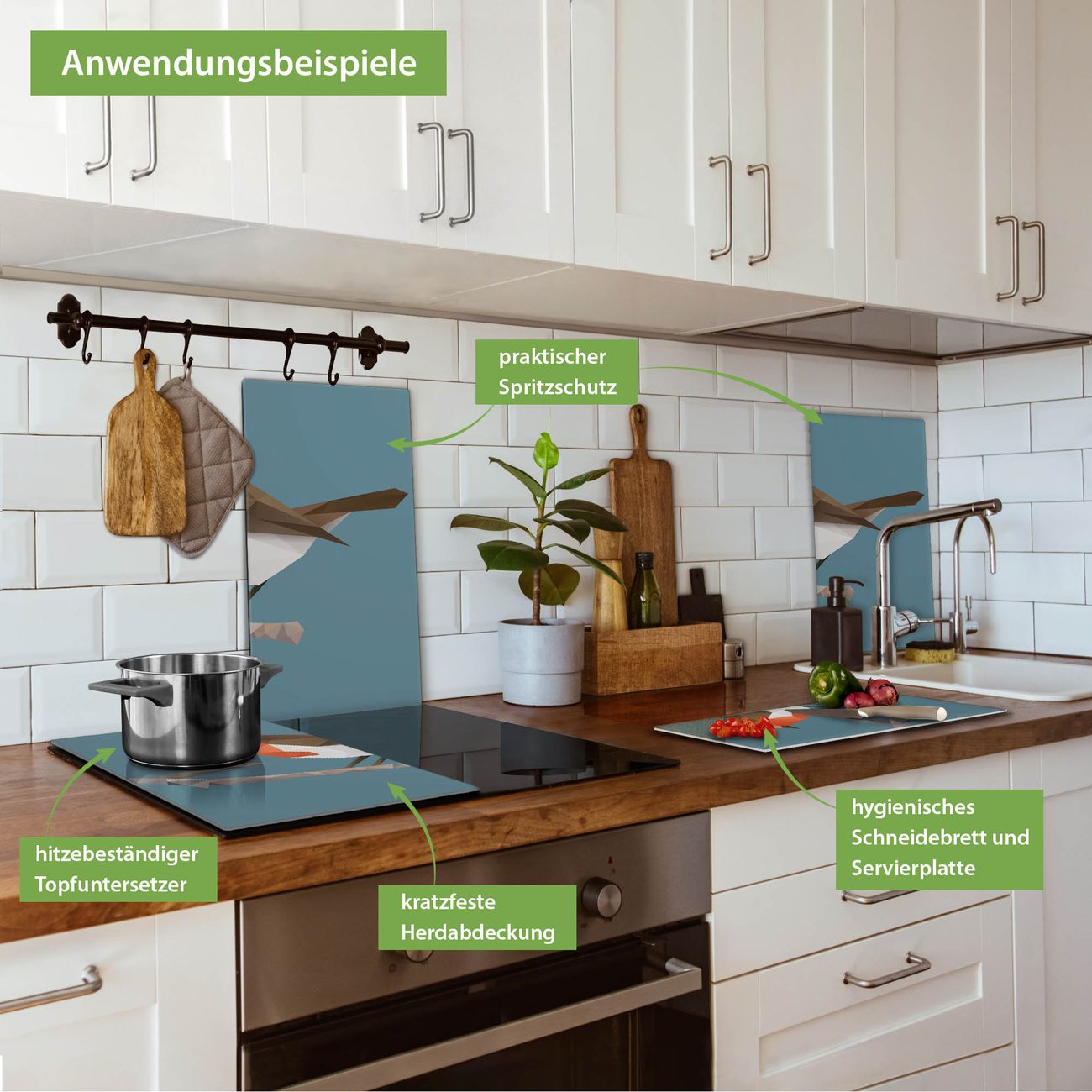 VIELSEITIG: Die Ceranfeldabdeckung ist vielseitig einsetzbar: ob als Spritzschutz hinter dem Herd für Ihre Küche oder als Glas Schneidebrett als hygienische und geruchsneutrale Unterlage. Sie können ebenfalls heiße Töpfe und Pfannen bis 100°C auf der Herdplattenabdeckung abstellen. Sie erhalten ein Multitalent für Ihre Küche. Die banjado Herdabdeckplatte aus Glas mit Motiv abstrakter Vogel verdeckt mit einem schönen Motiv Ihr Ceranfeld bzw. Ihren Induktionsherd. Die Herdabdeckplatte ist vielseitig einsetzbar und passt sich dabei Ihrem Einrichtungsstil an. DESIGN: Die Herdabdeckung abstrakter Vogel besteht aus hochwertigem, gehärtetem Glas mit einem unserer zahlreichen Motive. Sie haben die Wahl zwischen verschiedenen Maßen von einteiligen, zweiteiligen und einer dreiteiligen Herdabdeckung. Wählen Sie was zu Ihrer Einrichtung passt! DETAILS: Die Herdabdeckplatte ist vielseitig einsetzbar. Die Ecken sind für mehr Sicherheit dezent abgerundet, das Glas ist gehärtet. Sie erhalten separate Gummi Abstandshalter, damit Ihre Abdeckung rutschfest auf dem Herd steht. Diese können Sie frei positionieren, sodass die Herdabdeckung perfekt auf Ihrem Ceranfeld sitzt. BANJADO: Wir sind ein kleines Team aus dem Herzen von Sachsen und fertigen jeden Artikel nach Bestellung eigens für Sie an. Sie erhalten also keine preiswerte Importware, sondern Handarbeit. Auf Wunsch sind auch andere Farben und Größen möglich, kontakierten Sie uns gern.