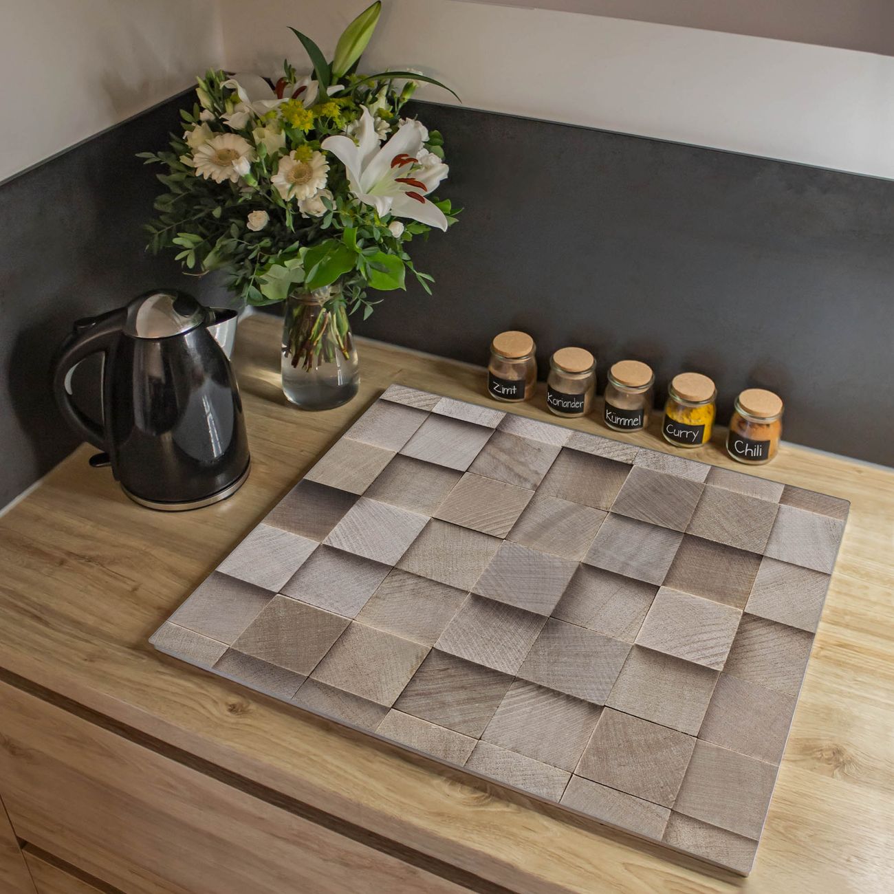 VIELSEITIG: Die Ceranfeldabdeckung ist vielseitig einsetzbar: ob als Spritzschutz hinter dem Herd für Ihre Küche oder als Glas Schneidebrett als hygienische und geruchsneutrale Unterlage. Sie können ebenfalls heiße Töpfe und Pfannen bis 100°C auf der Herdplattenabdeckung abstellen. Sie erhalten ein Multitalent für Ihre Küche. Die banjado Herdabdeckplatte aus Glas mit Motiv Bauklötze Relief verdeckt mit einem schönen Motiv Ihr Ceranfeld bzw. Ihren Induktionsherd. Die Herdabdeckplatte ist vielseitig einsetzbar und passt sich dabei Ihrem Einrichtungsstil an. DESIGN: Die Herdabdeckung Bauklötze Relief besteht aus hochwertigem, gehärtetem Glas mit einem unserer zahlreichen Motive. Sie haben die Wahl zwischen verschiedenen Maßen von einteiligen, zweiteiligen und einer dreiteiligen Herdabdeckung. Wählen Sie was zu Ihrer Einrichtung passt! DETAILS: Die Herdabdeckplatte ist vielseitig einsetzbar. Die Ecken sind für mehr Sicherheit dezent abgerundet, das Glas ist gehärtet. Sie erhalten separate Gummi Abstandshalter, damit Ihre Abdeckung rutschfest auf dem Herd steht. Diese können Sie frei positionieren, sodass die Herdabdeckung perfekt auf Ihrem Ceranfeld sitzt. BANJADO: Wir sind ein kleines Team aus dem Herzen von Sachsen und fertigen jeden Artikel nach Bestellung eigens für Sie an. Sie erhalten also keine preiswerte Importware, sondern Handarbeit. Auf Wunsch sind auch andere Farben und Größen möglich, kontakierten Sie uns gern.