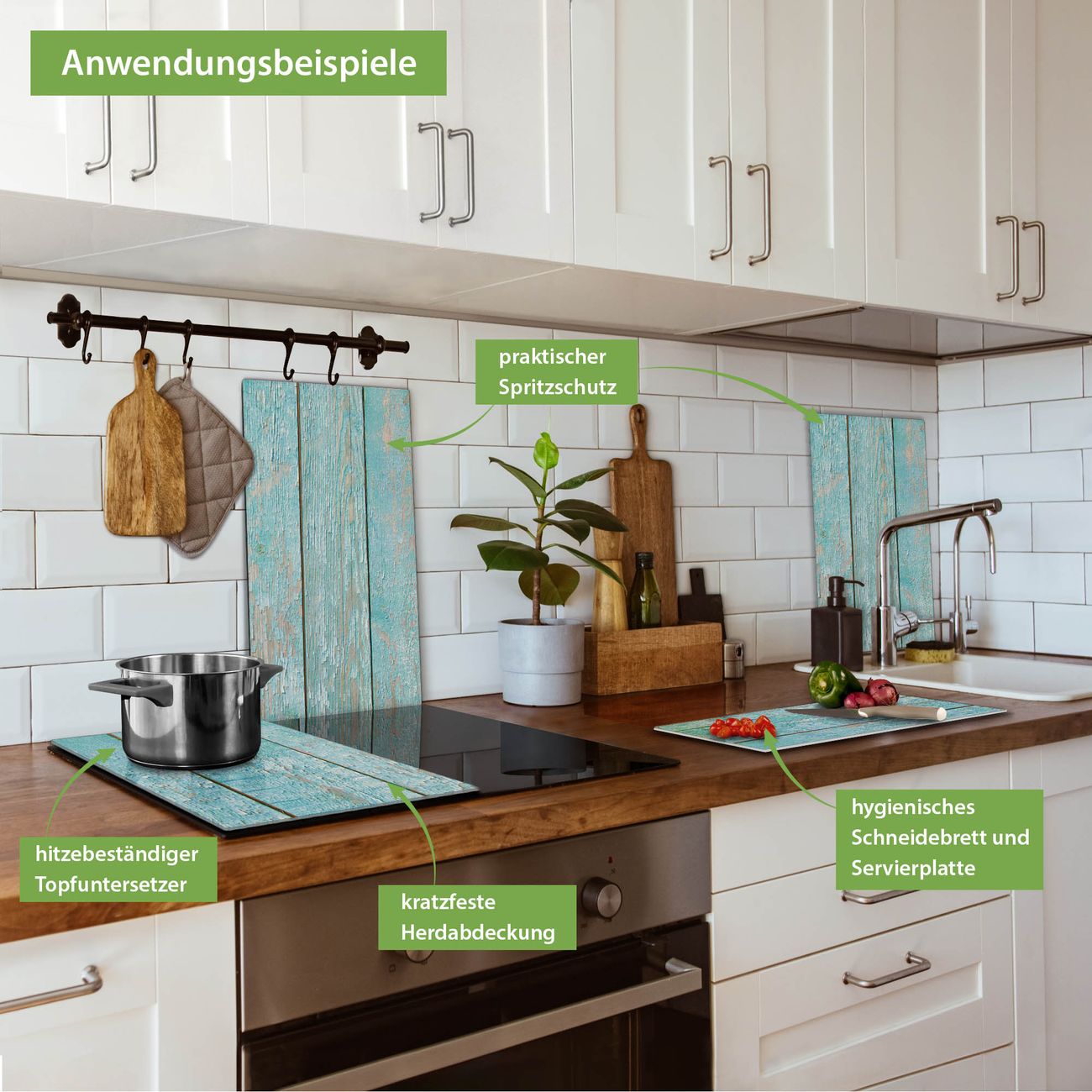 VIELSEITIG: Die Ceranfeldabdeckung ist vielseitig einsetzbar: ob als Spritzschutz hinter dem Herd für Ihre Küche oder als Glas Schneidebrett als hygienische und geruchsneutrale Unterlage. Sie können ebenfalls heiße Töpfe und Pfannen bis 100°C auf der Herdplattenabdeckung abstellen. Sie erhalten ein Multitalent für Ihre Küche. Die banjado Herdabdeckplatte aus Glas mit Motiv Blaue Planken verdeckt mit einem schönen Motiv Ihr Ceranfeld bzw. Ihren Induktionsherd. Die Herdabdeckplatte ist vielseitig einsetzbar und passt sich dabei Ihrem Einrichtungsstil an. DESIGN: Die Herdabdeckung Blaue Planken besteht aus hochwertigem, gehärtetem Glas mit einem unserer zahlreichen Motive. Sie haben die Wahl zwischen verschiedenen Maßen von einteiligen, zweiteiligen und einer dreiteiligen Herdabdeckung. Wählen Sie was zu Ihrer Einrichtung passt! DETAILS: Die Herdabdeckplatte ist vielseitig einsetzbar. Die Ecken sind für mehr Sicherheit dezent abgerundet, das Glas ist gehärtet. Sie erhalten separate Gummi Abstandshalter, damit Ihre Abdeckung rutschfest auf dem Herd steht. Diese können Sie frei positionieren, sodass die Herdabdeckung perfekt auf Ihrem Ceranfeld sitzt. BANJADO: Wir sind ein kleines Team aus dem Herzen von Sachsen und fertigen jeden Artikel nach Bestellung eigens für Sie an. Sie erhalten also keine preiswerte Importware, sondern Handarbeit. Auf Wunsch sind auch andere Farben und Größen möglich, kontakierten Sie uns gern.