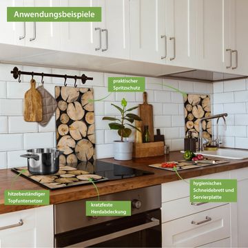 VIELSEITIG: Die Ceranfeldabdeckung ist vielseitig einsetzbar: ob als Spritzschutz hinter dem Herd für Ihre Küche oder als Glas Schneidebrett als hygienische und geruchsneutrale Unterlage. Sie können ebenfalls heiße Töpfe und Pfannen bis 100°C auf der Herdplattenabdeckung abstellen. Sie erhalten ein Multitalent für Ihre Küche. Die banjado Herdabdeckplatte aus Glas mit Motiv Brennholz verdeckt mit einem schönen Motiv Ihr Ceranfeld bzw. Ihren Induktionsherd. Die Herdabdeckplatte ist vielseitig einsetzbar und passt sich dabei Ihrem Einrichtungsstil an. DESIGN: Die Herdabdeckung Brennholz besteht aus hochwertigem, gehärtetem Glas mit einem unserer zahlreichen Motive. Sie haben die Wahl zwischen verschiedenen Maßen von einteiligen, zweiteiligen und einer dreiteiligen Herdabdeckung. Wählen Sie was zu Ihrer Einrichtung passt! DETAILS: Die Herdabdeckplatte ist vielseitig einsetzbar. Die Ecken sind für mehr Sicherheit dezent abgerundet, das Glas ist gehärtet. Sie erhalten separate Gummi Abstandshalter, damit Ihre Abdeckung rutschfest auf dem Herd steht. Diese können Sie frei positionieren, sodass die Herdabdeckung perfekt auf Ihrem Ceranfeld sitzt. BANJADO: Wir sind ein kleines Team aus dem Herzen von Sachsen und fertigen jeden Artikel nach Bestellung eigens für Sie an. Sie erhalten also keine preiswerte Importware, sondern Handarbeit. Auf Wunsch sind auch andere Farben und Größen möglich, kontakierten Sie uns gern.