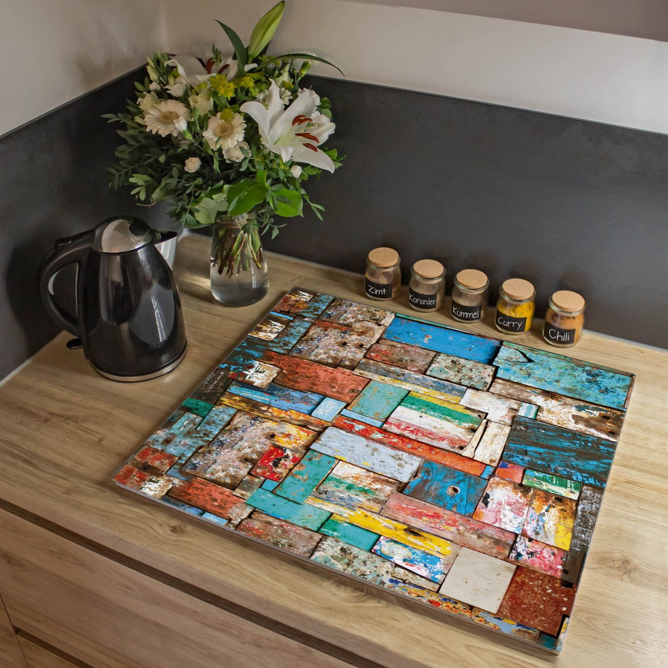 VIELSEITIG: Die Ceranfeldabdeckung ist vielseitig einsetzbar: ob als Spritzschutz hinter dem Herd für Ihre Küche oder als Glas Schneidebrett als hygienische und geruchsneutrale Unterlage. Sie können ebenfalls heiße Töpfe und Pfannen bis 100°C auf der Herdplattenabdeckung abstellen. Sie erhalten ein Multitalent für Ihre Küche. Die banjado Herdabdeckplatte aus Glas mit Motiv Bunte Holzschindeln verdeckt mit einem schönen Motiv Ihr Ceranfeld bzw. Ihren Induktionsherd. Die Herdabdeckplatte ist vielseitig einsetzbar und passt sich dabei Ihrem Einrichtungsstil an. DESIGN: Die Herdabdeckung Bunte Holzschindeln besteht aus hochwertigem, gehärtetem Glas mit einem unserer zahlreichen Motive. Sie haben die Wahl zwischen verschiedenen Maßen von einteiligen, zweiteiligen und einer dreiteiligen Herdabdeckung. Wählen Sie was zu Ihrer Einrichtung passt! DETAILS: Die Herdabdeckplatte ist vielseitig einsetzbar. Die Ecken sind für mehr Sicherheit dezent abgerundet, das Glas ist gehärtet. Sie erhalten separate Gummi Abstandshalter, damit Ihre Abdeckung rutschfest auf dem Herd steht. Diese können Sie frei positionieren, sodass die Herdabdeckung perfekt auf Ihrem Ceranfeld sitzt. BANJADO: Wir sind ein kleines Team aus dem Herzen von Sachsen und fertigen jeden Artikel nach Bestellung eigens für Sie an. Sie erhalten also keine preiswerte Importware, sondern Handarbeit. Auf Wunsch sind auch andere Farben und Größen möglich, kontakierten Sie uns gern.