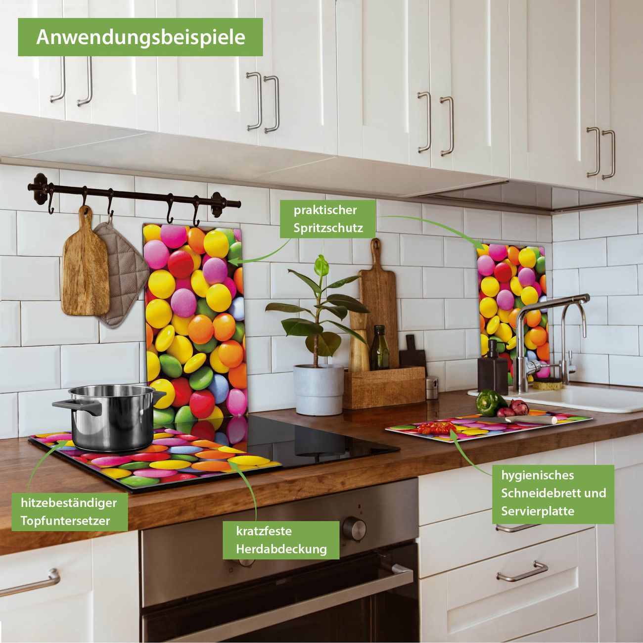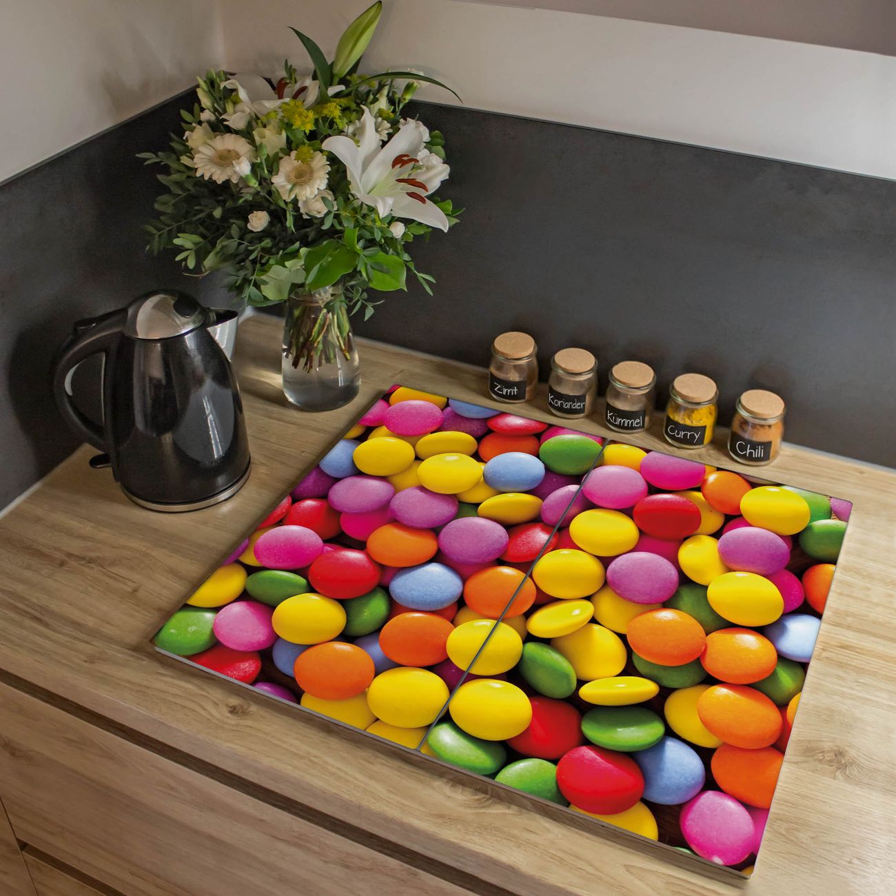 VIELSEITIG: Die Ceranfeldabdeckung ist vielseitig einsetzbar: ob als Spritzschutz hinter dem Herd für Ihre Küche oder als Glas Schneidebrett als hygienische und geruchsneutrale Unterlage. Sie können ebenfalls heiße Töpfe und Pfannen bis 100°C auf der Herdplattenabdeckung abstellen. Sie erhalten ein Multitalent für Ihre Küche. Die banjado Herdabdeckplatte aus Glas mit Motiv Dragees verdeckt mit einem schönen Motiv Ihr Ceranfeld bzw. Ihren Induktionsherd. Die Herdabdeckplatte ist vielseitig einsetzbar und passt sich dabei Ihrem Einrichtungsstil an. DESIGN: Die Herdabdeckung Dragees besteht aus hochwertigem, gehärtetem Glas mit einem unserer zahlreichen Motive. Sie haben die Wahl zwischen verschiedenen Maßen von einteiligen, zweiteiligen und einer dreiteiligen Herdabdeckung. Wählen Sie was zu Ihrer Einrichtung passt! DETAILS: Die Herdabdeckplatte ist vielseitig einsetzbar. Die Ecken sind für mehr Sicherheit dezent abgerundet, das Glas ist gehärtet. Sie erhalten separate Gummi Abstandshalter, damit Ihre Abdeckung rutschfest auf dem Herd steht. Diese können Sie frei positionieren, sodass die Herdabdeckung perfekt auf Ihrem Ceranfeld sitzt. BANJADO: Wir sind ein kleines Team aus dem Herzen von Sachsen und fertigen jeden Artikel nach Bestellung eigens für Sie an. Sie erhalten also keine preiswerte Importware, sondern Handarbeit. Auf Wunsch sind auch andere Farben und Größen möglich, kontakierten Sie uns gern.
