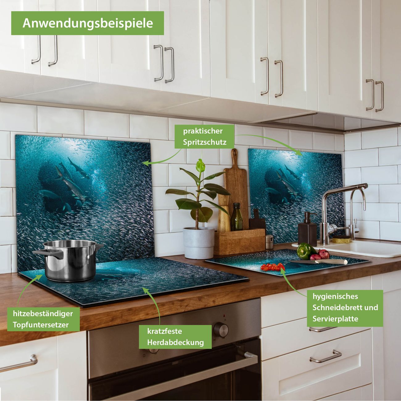 VIELSEITIG: Die Ceranfeldabdeckung ist vielseitig einsetzbar: ob als Spritzschutz hinter dem Herd für Ihre Küche oder als Glas Schneidebrett als hygienische und geruchsneutrale Unterlage. Sie können ebenfalls heiße Töpfe und Pfannen bis 100°C auf der Herdplattenabdeckung abstellen. Sie erhalten ein Multitalent für Ihre Küche. Die banjado Herdabdeckplatte aus Glas mit Motiv Fische im Meer verdeckt mit einem schönen Motiv Ihr Ceranfeld bzw. Ihren Induktionsherd. Die Herdabdeckplatte ist vielseitig einsetzbar und passt sich dabei Ihrem Einrichtungsstil an. DESIGN: Die Herdabdeckung Fische im Meer besteht aus hochwertigem, gehärtetem Glas mit einem unserer zahlreichen Motive. Sie haben die Wahl zwischen verschiedenen Maßen von einteiligen, zweiteiligen und einer dreiteiligen Herdabdeckung. Wählen Sie was zu Ihrer Einrichtung passt! DETAILS: Die Herdabdeckplatte ist vielseitig einsetzbar. Die Ecken sind für mehr Sicherheit dezent abgerundet, das Glas ist gehärtet. Sie erhalten separate Gummi Abstandshalter, damit Ihre Abdeckung rutschfest auf dem Herd steht. Diese können Sie frei positionieren, sodass die Herdabdeckung perfekt auf Ihrem Ceranfeld sitzt. BANJADO: Wir sind ein kleines Team aus dem Herzen von Sachsen und fertigen jeden Artikel nach Bestellung eigens für Sie an. Sie erhalten also keine preiswerte Importware, sondern Handarbeit. Auf Wunsch sind auch andere Farben und Größen möglich, kontakierten Sie uns gern.
