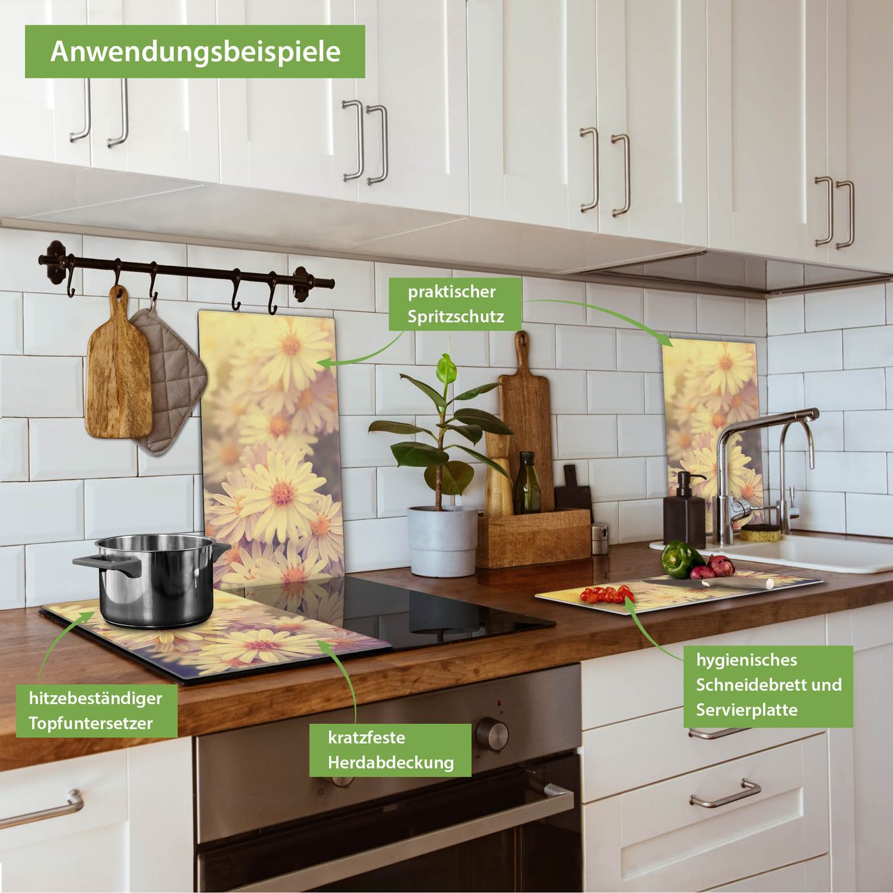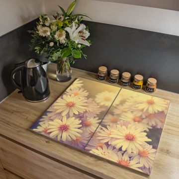 VIELSEITIG: Die Ceranfeldabdeckung ist vielseitig einsetzbar: ob als Spritzschutz hinter dem Herd für Ihre Küche oder als Glas Schneidebrett als hygienische und geruchsneutrale Unterlage. Sie können ebenfalls heiße Töpfe und Pfannen bis 100°C auf der Herdplattenabdeckung abstellen. Sie erhalten ein Multitalent für Ihre Küche. Die banjado Herdabdeckplatte aus Glas mit Motiv Gerbera 3 verdeckt mit einem schönen Motiv Ihr Ceranfeld bzw. Ihren Induktionsherd. Die Herdabdeckplatte ist vielseitig einsetzbar und passt sich dabei Ihrem Einrichtungsstil an. DESIGN: Die Herdabdeckung Gerbera 3 besteht aus hochwertigem, gehärtetem Glas mit einem unserer zahlreichen Motive. Sie haben die Wahl zwischen verschiedenen Maßen von einteiligen, zweiteiligen und einer dreiteiligen Herdabdeckung. Wählen Sie was zu Ihrer Einrichtung passt! DETAILS: Die Herdabdeckplatte ist vielseitig einsetzbar. Die Ecken sind für mehr Sicherheit dezent abgerundet, das Glas ist gehärtet. Sie erhalten separate Gummi Abstandshalter, damit Ihre Abdeckung rutschfest auf dem Herd steht. Diese können Sie frei positionieren, sodass die Herdabdeckung perfekt auf Ihrem Ceranfeld sitzt. BANJADO: Wir sind ein kleines Team aus dem Herzen von Sachsen und fertigen jeden Artikel nach Bestellung eigens für Sie an. Sie erhalten also keine preiswerte Importware, sondern Handarbeit. Auf Wunsch sind auch andere Farben und Größen möglich, kontakierten Sie uns gern.