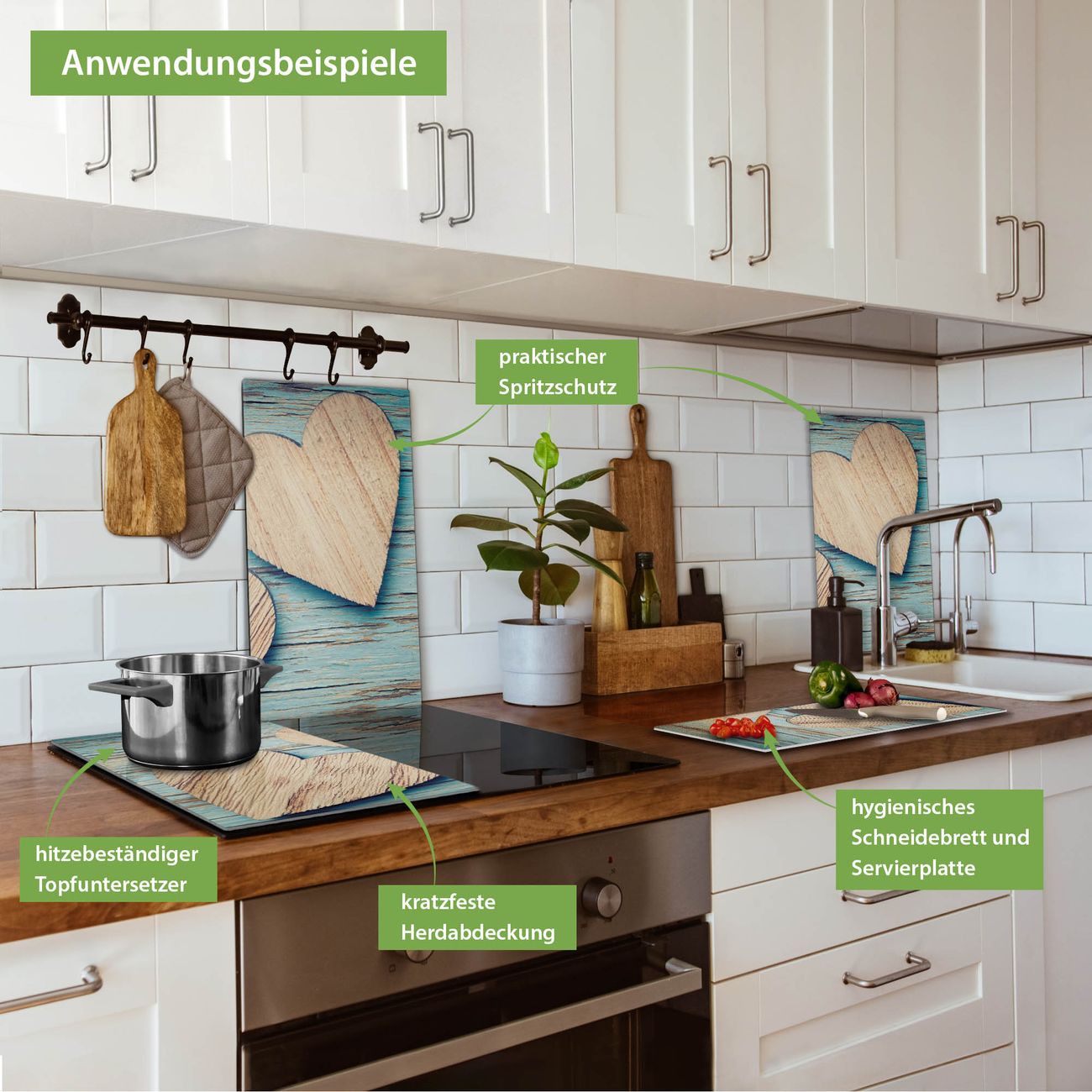 VIELSEITIG: Die Ceranfeldabdeckung ist vielseitig einsetzbar: ob als Spritzschutz hinter dem Herd für Ihre Küche oder als Glas Schneidebrett als hygienische und geruchsneutrale Unterlage. Sie können ebenfalls heiße Töpfe und Pfannen bis 100°C auf der Herdplattenabdeckung abstellen. Sie erhalten ein Multitalent für Ihre Küche. Die banjado Herdabdeckplatte aus Glas mit Motiv Holz Herzen verdeckt mit einem schönen Motiv Ihr Ceranfeld bzw. Ihren Induktionsherd. Die Herdabdeckplatte ist vielseitig einsetzbar und passt sich dabei Ihrem Einrichtungsstil an. DESIGN: Die Herdabdeckung Holz Herzen besteht aus hochwertigem, gehärtetem Glas mit einem unserer zahlreichen Motive. Sie haben die Wahl zwischen verschiedenen Maßen von einteiligen, zweiteiligen und einer dreiteiligen Herdabdeckung. Wählen Sie was zu Ihrer Einrichtung passt! DETAILS: Die Herdabdeckplatte ist vielseitig einsetzbar. Die Ecken sind für mehr Sicherheit dezent abgerundet, das Glas ist gehärtet. Sie erhalten separate Gummi Abstandshalter, damit Ihre Abdeckung rutschfest auf dem Herd steht. Diese können Sie frei positionieren, sodass die Herdabdeckung perfekt auf Ihrem Ceranfeld sitzt. BANJADO: Wir sind ein kleines Team aus dem Herzen von Sachsen und fertigen jeden Artikel nach Bestellung eigens für Sie an. Sie erhalten also keine preiswerte Importware, sondern Handarbeit. Auf Wunsch sind auch andere Farben und Größen möglich, kontakierten Sie uns gern.