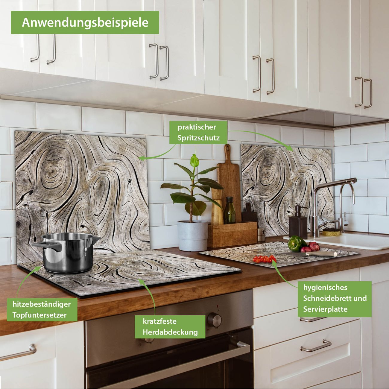 VIELSEITIG: Die Ceranfeldabdeckung ist vielseitig einsetzbar: ob als Spritzschutz hinter dem Herd für Ihre Küche oder als Glas Schneidebrett als hygienische und geruchsneutrale Unterlage. Sie können ebenfalls heiße Töpfe und Pfannen bis 100°C auf der Herdplattenabdeckung abstellen. Sie erhalten ein Multitalent für Ihre Küche. Die banjado Herdabdeckplatte aus Glas mit Motiv Holzwirbel verdeckt mit einem schönen Motiv Ihr Ceranfeld bzw. Ihren Induktionsherd. Die Herdabdeckplatte ist vielseitig einsetzbar und passt sich dabei Ihrem Einrichtungsstil an. DESIGN: Die Herdabdeckung Holzwirbel besteht aus hochwertigem, gehärtetem Glas mit einem unserer zahlreichen Motive. Sie haben die Wahl zwischen verschiedenen Maßen von einteiligen, zweiteiligen und einer dreiteiligen Herdabdeckung. Wählen Sie was zu Ihrer Einrichtung passt! DETAILS: Die Herdabdeckplatte ist vielseitig einsetzbar. Die Ecken sind für mehr Sicherheit dezent abgerundet, das Glas ist gehärtet. Sie erhalten separate Gummi Abstandshalter, damit Ihre Abdeckung rutschfest auf dem Herd steht. Diese können Sie frei positionieren, sodass die Herdabdeckung perfekt auf Ihrem Ceranfeld sitzt. BANJADO: Wir sind ein kleines Team aus dem Herzen von Sachsen und fertigen jeden Artikel nach Bestellung eigens für Sie an. Sie erhalten also keine preiswerte Importware, sondern Handarbeit. Auf Wunsch sind auch andere Farben und Größen möglich, kontakierten Sie uns gern.