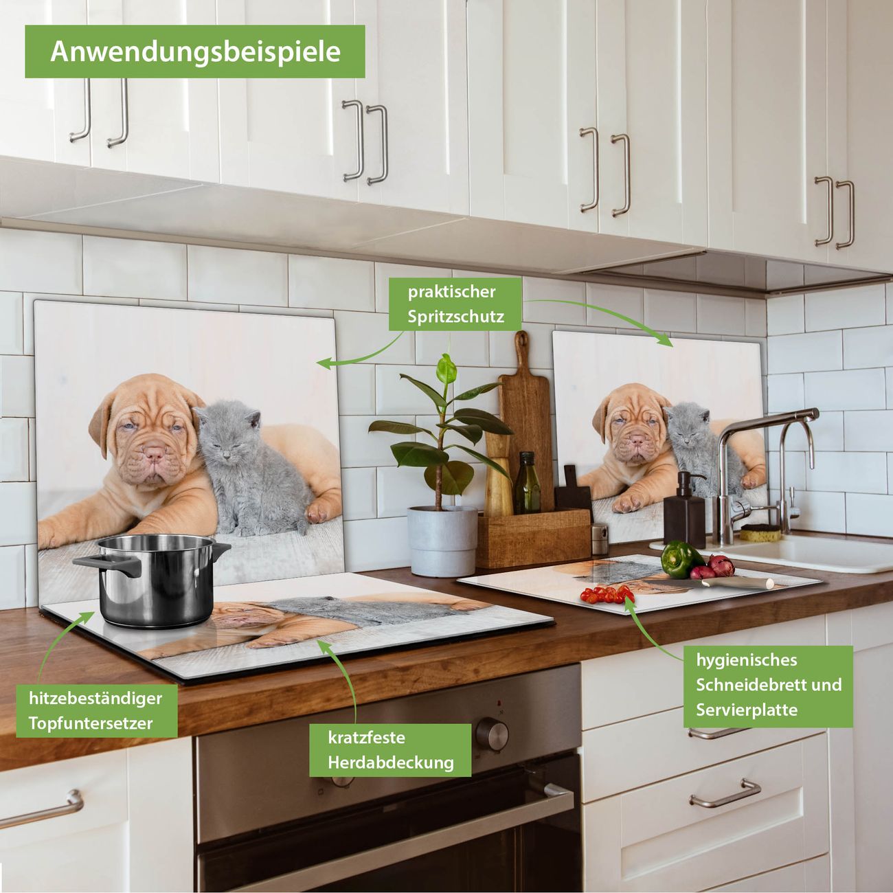VIELSEITIG: Die Ceranfeldabdeckung ist vielseitig einsetzbar: ob als Spritzschutz hinter dem Herd für Ihre Küche oder als Glas Schneidebrett als hygienische und geruchsneutrale Unterlage. Sie können ebenfalls heiße Töpfe und Pfannen bis 100°C auf der Herdplattenabdeckung abstellen. Sie erhalten ein Multitalent für Ihre Küche. Die banjado Herdabdeckplatte aus Glas mit Motiv Hund und Katze verdeckt mit einem schönen Motiv Ihr Ceranfeld bzw. Ihren Induktionsherd. Die Herdabdeckplatte ist vielseitig einsetzbar und passt sich dabei Ihrem Einrichtungsstil an. DESIGN: Die Herdabdeckung Hund und Katze besteht aus hochwertigem, gehärtetem Glas mit einem unserer zahlreichen Motive. Sie haben die Wahl zwischen verschiedenen Maßen von einteiligen, zweiteiligen und einer dreiteiligen Herdabdeckung. Wählen Sie was zu Ihrer Einrichtung passt! DETAILS: Die Herdabdeckplatte ist vielseitig einsetzbar. Die Ecken sind für mehr Sicherheit dezent abgerundet, das Glas ist gehärtet. Sie erhalten separate Gummi Abstandshalter, damit Ihre Abdeckung rutschfest auf dem Herd steht. Diese können Sie frei positionieren, sodass die Herdabdeckung perfekt auf Ihrem Ceranfeld sitzt. BANJADO: Wir sind ein kleines Team aus dem Herzen von Sachsen und fertigen jeden Artikel nach Bestellung eigens für Sie an. Sie erhalten also keine preiswerte Importware, sondern Handarbeit. Auf Wunsch sind auch andere Farben und Größen möglich, kontakierten Sie uns gern.