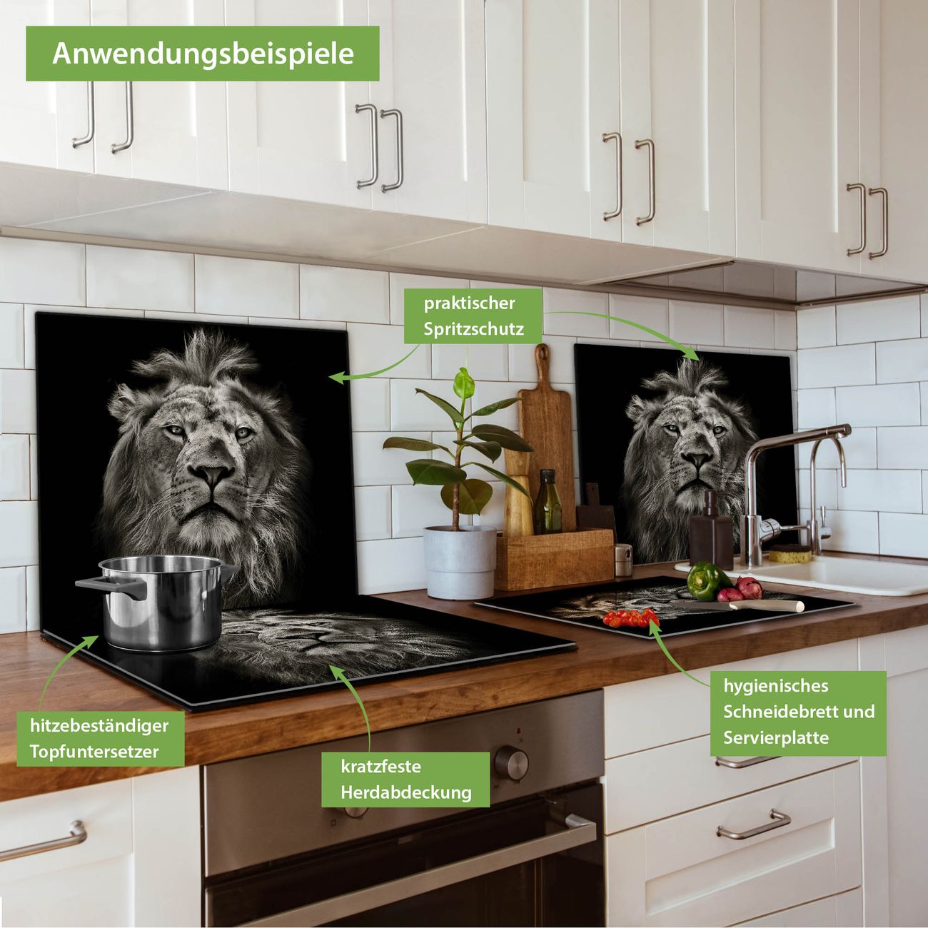 VIELSEITIG: Die Ceranfeldabdeckung ist vielseitig einsetzbar: ob als Spritzschutz hinter dem Herd für Ihre Küche oder als Glas Schneidebrett als hygienische und geruchsneutrale Unterlage. Sie können ebenfalls heiße Töpfe und Pfannen bis 100°C auf der Herdplattenabdeckung abstellen. Sie erhalten ein Multitalent für Ihre Küche. Die banjado Herdabdeckplatte aus Glas mit Motiv Löwe Porträt verdeckt mit einem schönen Motiv Ihr Ceranfeld bzw. Ihren Induktionsherd. Die Herdabdeckplatte ist vielseitig einsetzbar und passt sich dabei Ihrem Einrichtungsstil an. DESIGN: Die Herdabdeckung Löwe Porträt besteht aus hochwertigem, gehärtetem Glas mit einem unserer zahlreichen Motive. Sie haben die Wahl zwischen verschiedenen Maßen von einteiligen, zweiteiligen und einer dreiteiligen Herdabdeckung. Wählen Sie was zu Ihrer Einrichtung passt! DETAILS: Die Herdabdeckplatte ist vielseitig einsetzbar. Die Ecken sind für mehr Sicherheit dezent abgerundet, das Glas ist gehärtet. Sie erhalten separate Gummi Abstandshalter, damit Ihre Abdeckung rutschfest auf dem Herd steht. Diese können Sie frei positionieren, sodass die Herdabdeckung perfekt auf Ihrem Ceranfeld sitzt. BANJADO: Wir sind ein kleines Team aus dem Herzen von Sachsen und fertigen jeden Artikel nach Bestellung eigens für Sie an. Sie erhalten also keine preiswerte Importware, sondern Handarbeit. Auf Wunsch sind auch andere Farben und Größen möglich, kontakierten Sie uns gern.
