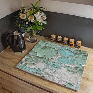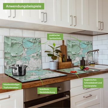 VIELSEITIG: Die Ceranfeldabdeckung ist vielseitig einsetzbar: ob als Spritzschutz hinter dem Herd für Ihre Küche oder als Glas Schneidebrett als hygienische und geruchsneutrale Unterlage. Sie können ebenfalls heiße Töpfe und Pfannen bis 100°C auf der Herdplattenabdeckung abstellen. Sie erhalten ein Multitalent für Ihre Küche. Die banjado Herdabdeckplatte aus Glas mit Motiv Patina Mint verdeckt mit einem schönen Motiv Ihr Ceranfeld bzw. Ihren Induktionsherd. Die Herdabdeckplatte ist vielseitig einsetzbar und passt sich dabei Ihrem Einrichtungsstil an. DESIGN: Die Herdabdeckung Patina Mint besteht aus hochwertigem, gehärtetem Glas mit einem unserer zahlreichen Motive. Sie haben die Wahl zwischen verschiedenen Maßen von einteiligen, zweiteiligen und einer dreiteiligen Herdabdeckung. Wählen Sie was zu Ihrer Einrichtung passt! DETAILS: Die Herdabdeckplatte ist vielseitig einsetzbar. Die Ecken sind für mehr Sicherheit dezent abgerundet, das Glas ist gehärtet. Sie erhalten separate Gummi Abstandshalter, damit Ihre Abdeckung rutschfest auf dem Herd steht. Diese können Sie frei positionieren, sodass die Herdabdeckung perfekt auf Ihrem Ceranfeld sitzt. BANJADO: Wir sind ein kleines Team aus dem Herzen von Sachsen und fertigen jeden Artikel nach Bestellung eigens für Sie an. Sie erhalten also keine preiswerte Importware, sondern Handarbeit. Auf Wunsch sind auch andere Farben und Größen möglich, kontakierten Sie uns gern.