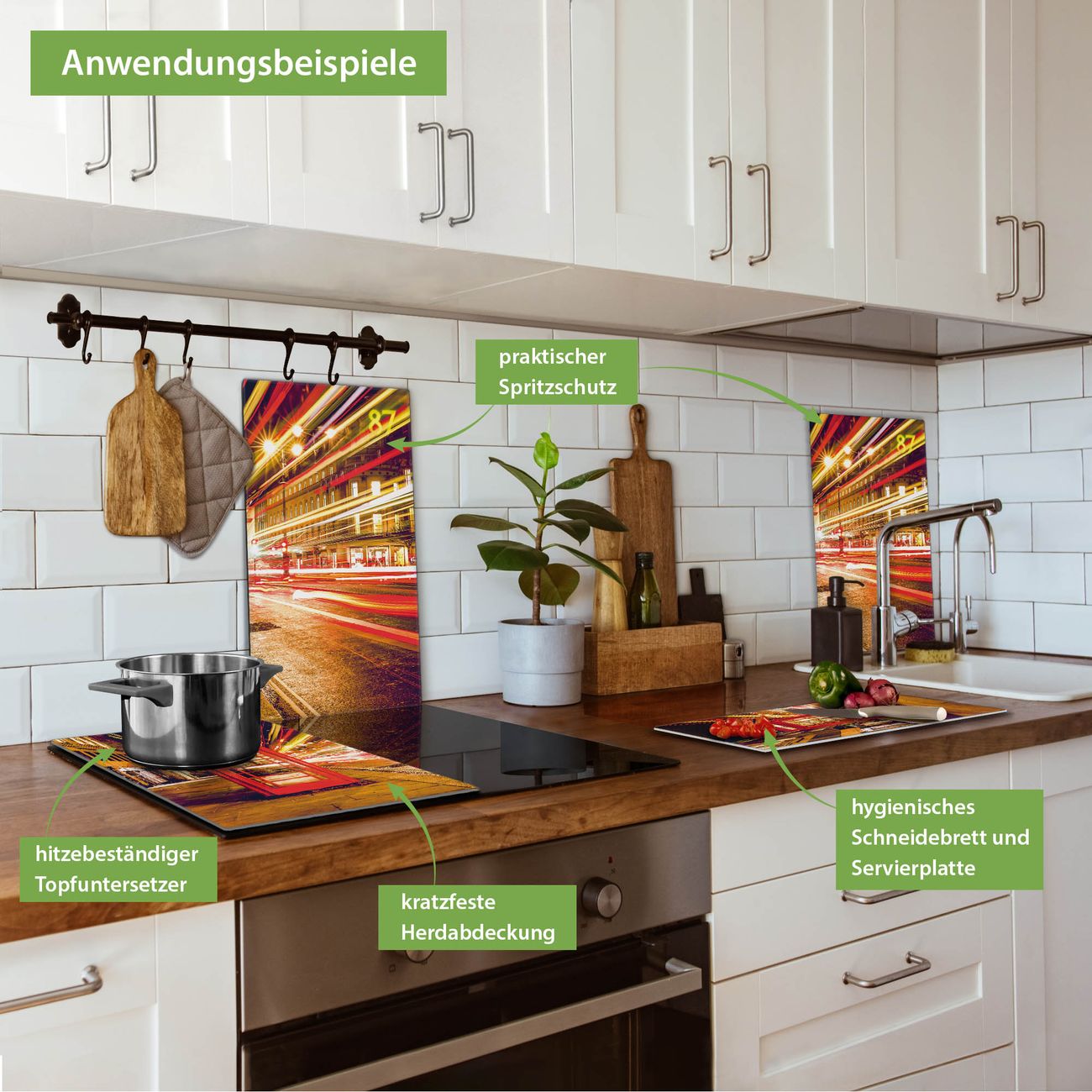 VIELSEITIG: Die Ceranfeldabdeckung ist vielseitig einsetzbar: ob als Spritzschutz hinter dem Herd für Ihre Küche oder als Glas Schneidebrett als hygienische und geruchsneutrale Unterlage. Sie können ebenfalls heiße Töpfe und Pfannen bis 100°C auf der Herdplattenabdeckung abstellen. Sie erhalten ein Multitalent für Ihre Küche. Die banjado Herdabdeckplatte aus Glas mit Motiv Red Telephone Trafic verdeckt mit einem schönen Motiv Ihr Ceranfeld bzw. Ihren Induktionsherd. Die Herdabdeckplatte ist vielseitig einsetzbar und passt sich dabei Ihrem Einrichtungsstil an. DESIGN: Die Herdabdeckung Red Telephone Trafic besteht aus hochwertigem, gehärtetem Glas mit einem unserer zahlreichen Motive. Sie haben die Wahl zwischen verschiedenen Maßen von einteiligen, zweiteiligen und einer dreiteiligen Herdabdeckung. Wählen Sie was zu Ihrer Einrichtung passt! DETAILS: Die Herdabdeckplatte ist vielseitig einsetzbar. Die Ecken sind für mehr Sicherheit dezent abgerundet, das Glas ist gehärtet. Sie erhalten separate Gummi Abstandshalter, damit Ihre Abdeckung rutschfest auf dem Herd steht. Diese können Sie frei positionieren, sodass die Herdabdeckung perfekt auf Ihrem Ceranfeld sitzt. BANJADO: Wir sind ein kleines Team aus dem Herzen von Sachsen und fertigen jeden Artikel nach Bestellung eigens für Sie an. Sie erhalten also keine preiswerte Importware, sondern Handarbeit. Auf Wunsch sind auch andere Farben und Größen möglich, kontakierten Sie uns gern.